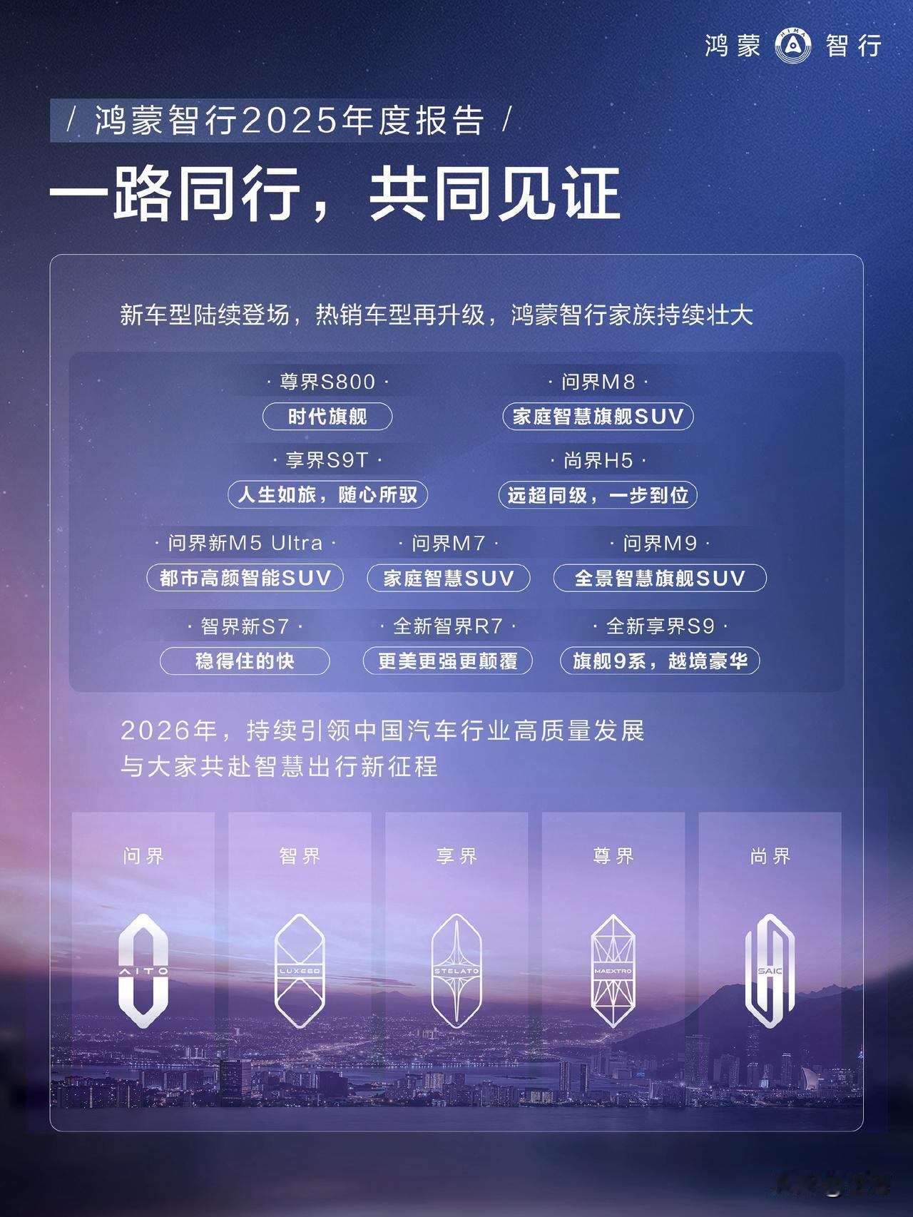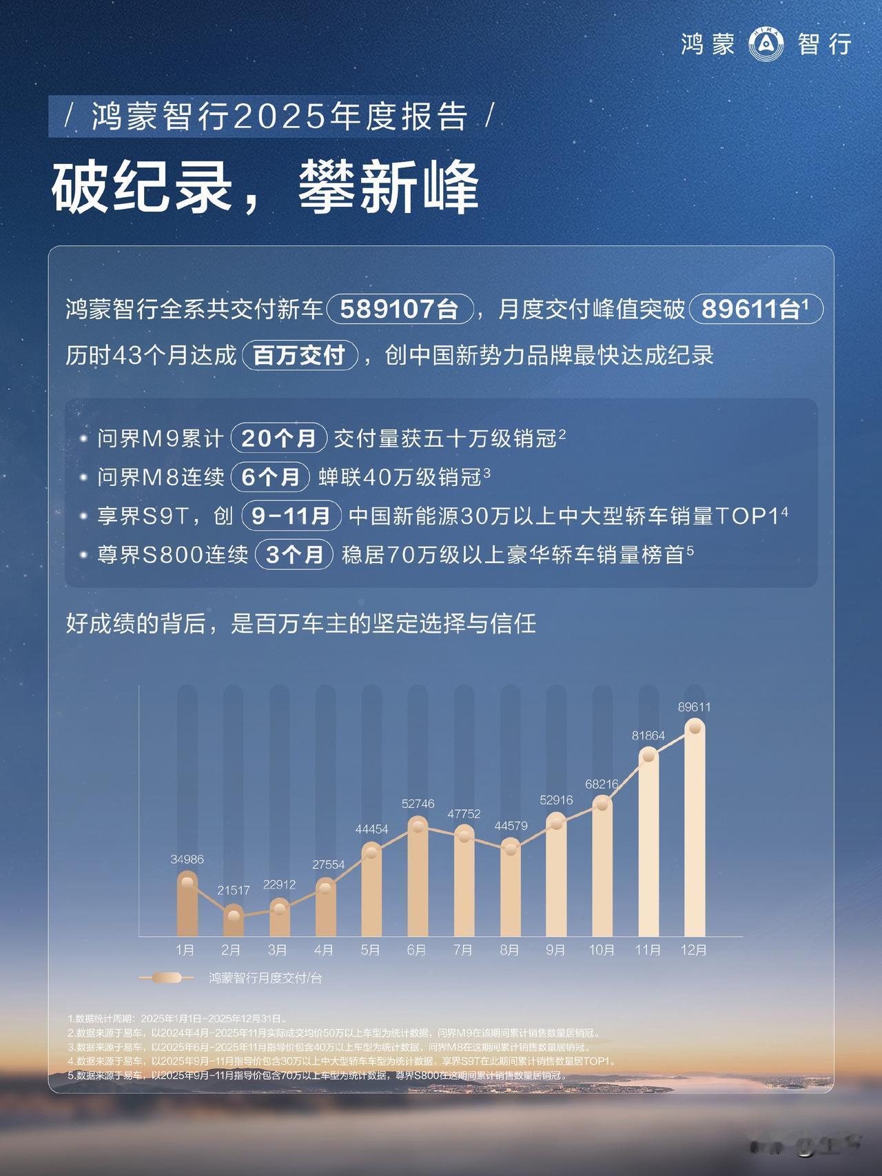 余承东2026年第一条信息来了: 鸿蒙智行全年交付量58.9万辆! 就在刚才,余承东在社交网络发出了他2026年的第一条信息,就是总结去年他们的成绩。 当然显示发了,大家都感兴趣的,十二月份他们的交付料,居然交了89,000多台车。 而且把各个车型的详细数据都列出来了,包括问界M8、M9以及旅行车,包括尊界等等车型的详细数据,在上月都创造了新的记录,在上月居然交付了超过了4000台! 最后一张图片就是新的一年他们这五个品牌,一起又要出一些新的车型了,而且还要在辅助驾驶方面安全方面,做出新的突破。