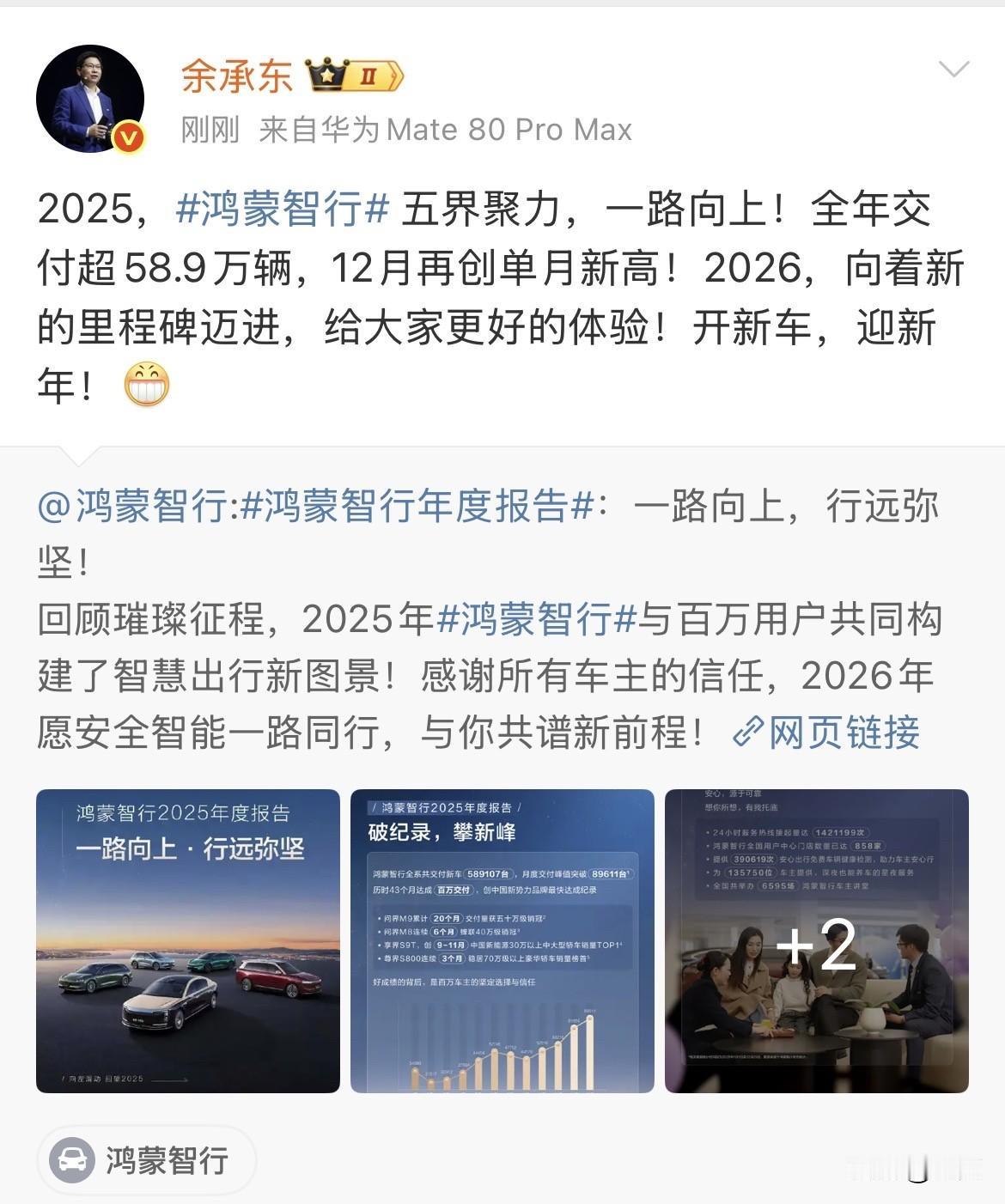 余承东2026年第一条信息来了:鸿蒙智行全年交付量58.9万辆! 就在刚才,