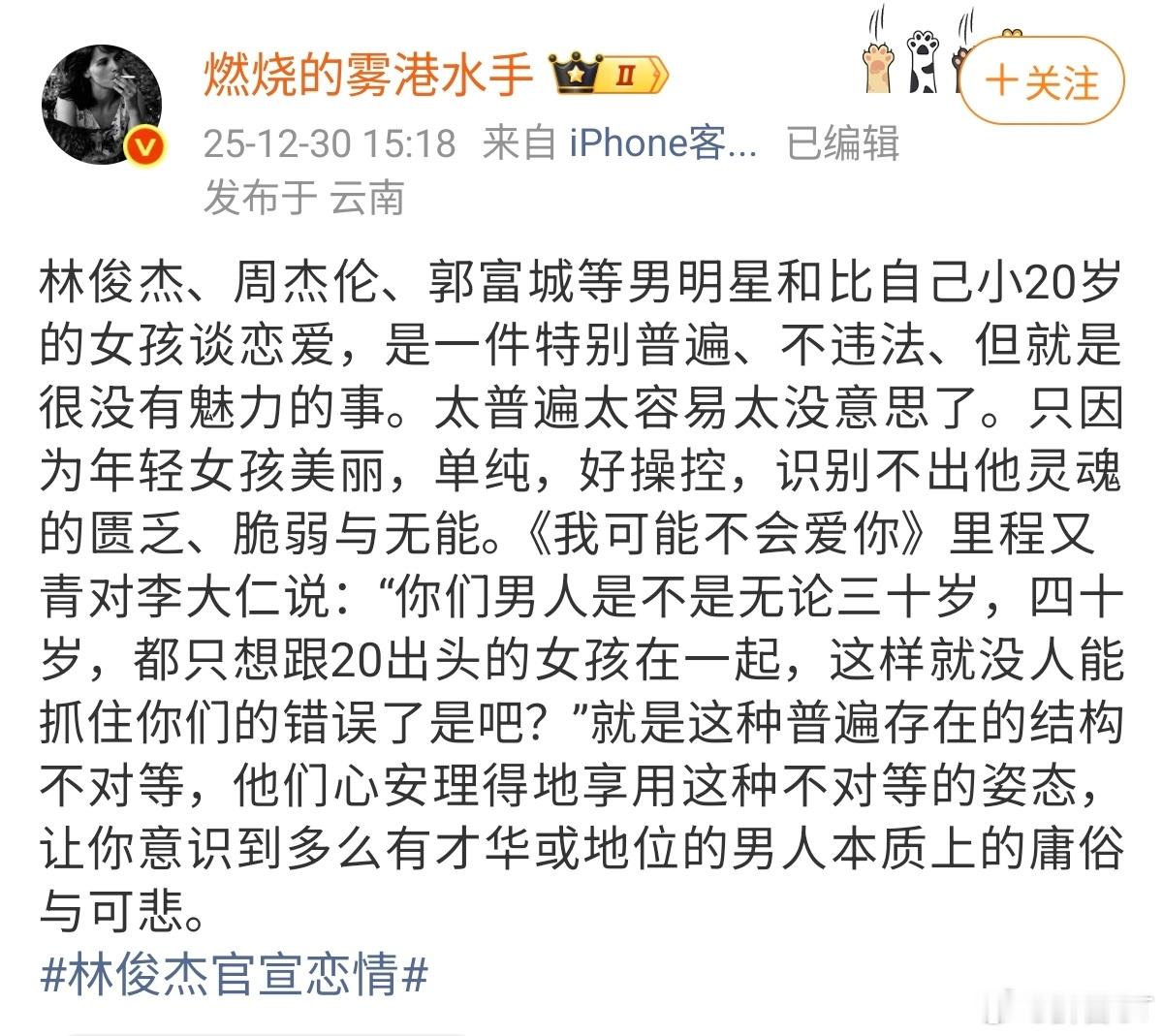 别说男明星了,正常男性找对象,首选肯定是年轻漂亮又听话的。毕竟,深埋在基因里的东西,是很难改变的。就算不找年轻又漂亮的,懂事也是最起码的要求。不然的话,难道还要找停水拉闸又自以为事还事逼的XXN吗?林俊杰维护七七