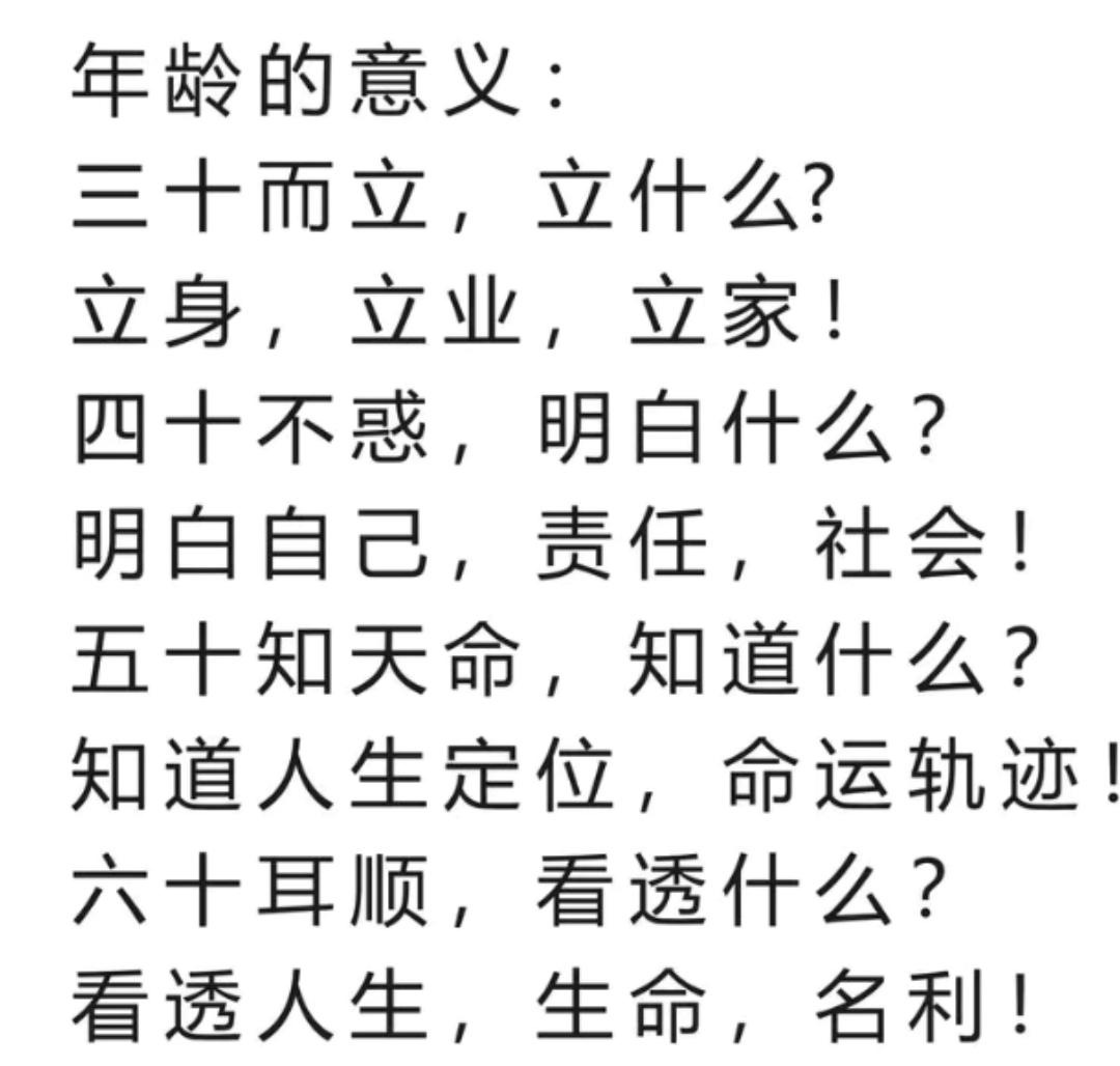 年龄的意义: 三十而立,立什么? 四十不惑,明白什么? 五十知天命,知道什么? 六十耳顺,看透什么?