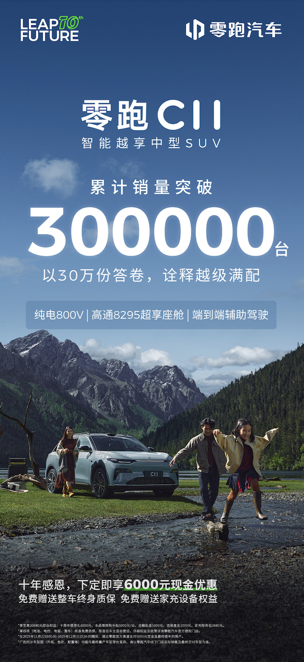 今年有个很明显的感受:在路上开车,看到的零跑多了很多。不只是核心城市,在不少三四线城市、社区停车场,零跑的出现频率都在提升,这往往是销量最直观的反馈。数据也很直接。2025年零跑全年销量接近60万辆,同比增长超100%,刷新新势力年销纪录。在品牌10周年节点,零跑已经站稳新势力第一梯队,并正式向明年年销100万辆目标发起冲击。零跑年销量近60万台超额完成目标背后的原因并不复杂。一是产品策略足够务实,覆盖主流价格区间,车型布局清晰;二是坚持全域自研,把成本优势转化为配置与品质;三是规模效应起来后,形成“卖得多—成本更低—产品更强”的正循环。这也正好踩中了当下消费者只选对的、不为品牌溢价买单的心理变化。正如朱总所说的“零跑每一款车都极具品价比,真正做到价廉物美”。具体到车型层面,零跑C11是典型样本。累计销量已突破30万台,靠的不是参数噱头,而是出色的产品力:全新自研800V碳化硅高压平台,30%-80%充电18min、AR-HUD、17.3英寸2.8K中控屏等等,从功能、性能到操控体验,全方位实现越级表现,远超同价位竞品,成为在这个价位区间用户绕不开的选择。零跑也顺势推出限时福利,热门车型都有参加,现在入手最高可省 29180 元,而且有现车不用等,有意向的朋友可以关注一下。零跑C11扎根技术,立足市场,零跑今年销量持续增长实现新突破并非偶然。随着后续D19、D99等产品加入,零跑的下一阶段增长,想象空间非常丰富!