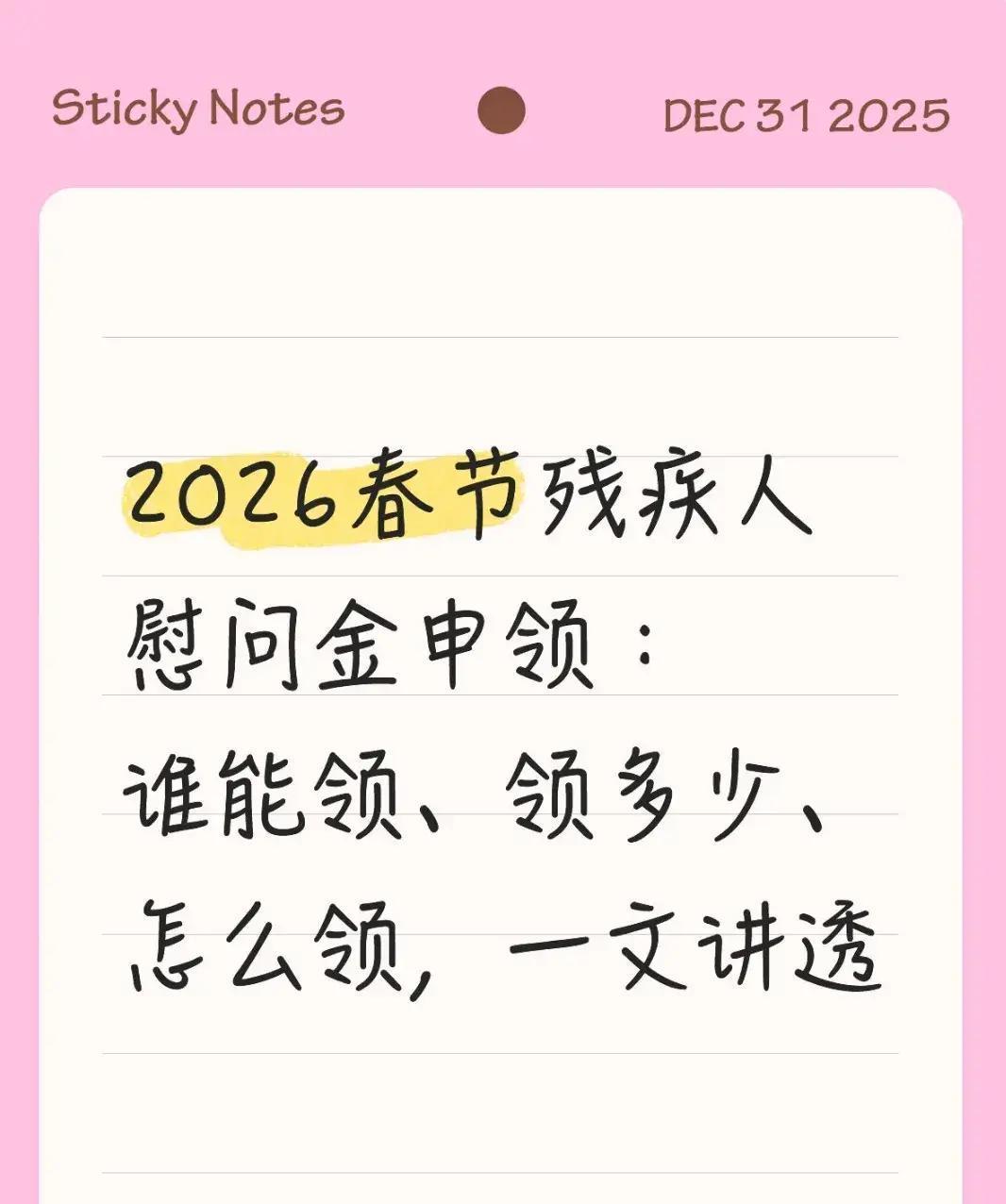 眼看2026年春节就要到了,很多残疾人家庭都在盼着那份特殊的关怀——各地启动的春节慰问帮扶活动。国家层面刚发文,要求各地加强对残疾人等困难群体的走访慰问,有条件的地方还能增发一次性补贴,真正让大家过个个暖心年。 符合条件的残疾人朋友们,别错过这波福利!主要针对持有效残疾人证、家庭经济困难或重度残疾的群体,尤其是低保、特困供养、一户多残、残疾军人、独居残疾老人和残疾儿童,这些人往往优先照顾。外地打工的残疾人,只要有本地居住证和社保记录,好多城市也支持就地申请,不用两头跑。 钱和东西怎么发?各地标准不一样,发达地区重度残疾人可能拿到一千多块,轻度的几百块,中西部稍低些,但低保家庭通常能多领20%到50%。不少地方不光给现金,还直接送米面油、棉被这些过年必需品,上门送到家,跟平时残疾人生活和护理补贴还能一起领,不冲突。 申请超简单,现在线上政务APP、小程序几分钟搞定,材料准备好身份证、残疾人证、银行卡就行。行动不便的,直接打电话,工作人员上门帮办。抓紧时间,多数地方1月中旬就截止,早办早安心。 这政策年年优化,越来越贴心,体现了社会对残疾人实打实的支持。残疾人朋友们,有需要就大胆去领,这是你们应得的权益,能多添点年味,多减点负担。赶紧行动起来,让这个春节更踏实、更温暖!残疾人政策 残疾人状况 残疾人工作政策