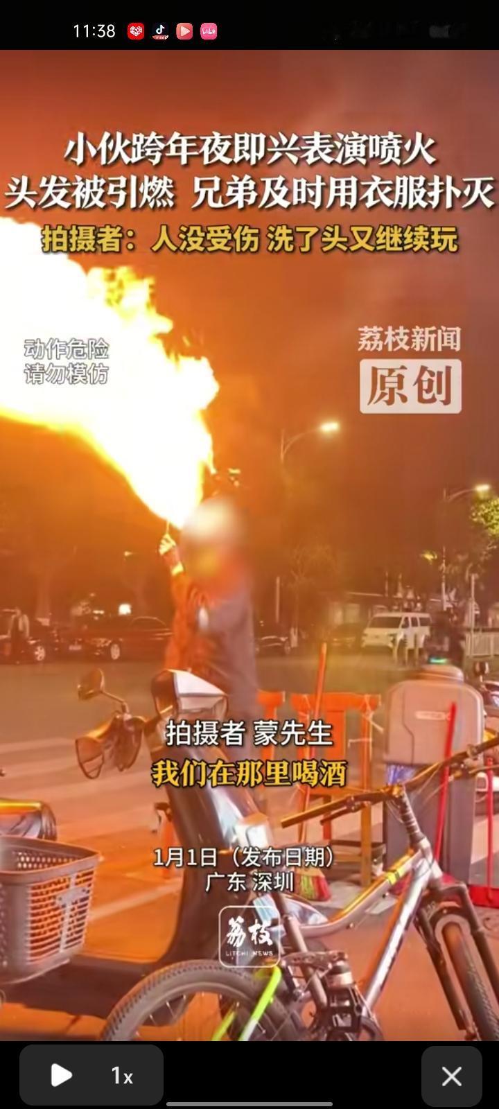 1月1日,广东深圳。网友发视频表示,一位小伙跨年夜即兴表演喷火,头发被引燃,兄弟用衣服将他头上的火扑灭。好在人没事,洗了头又继续玩了。