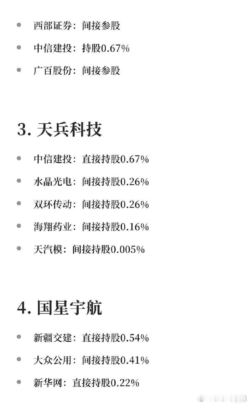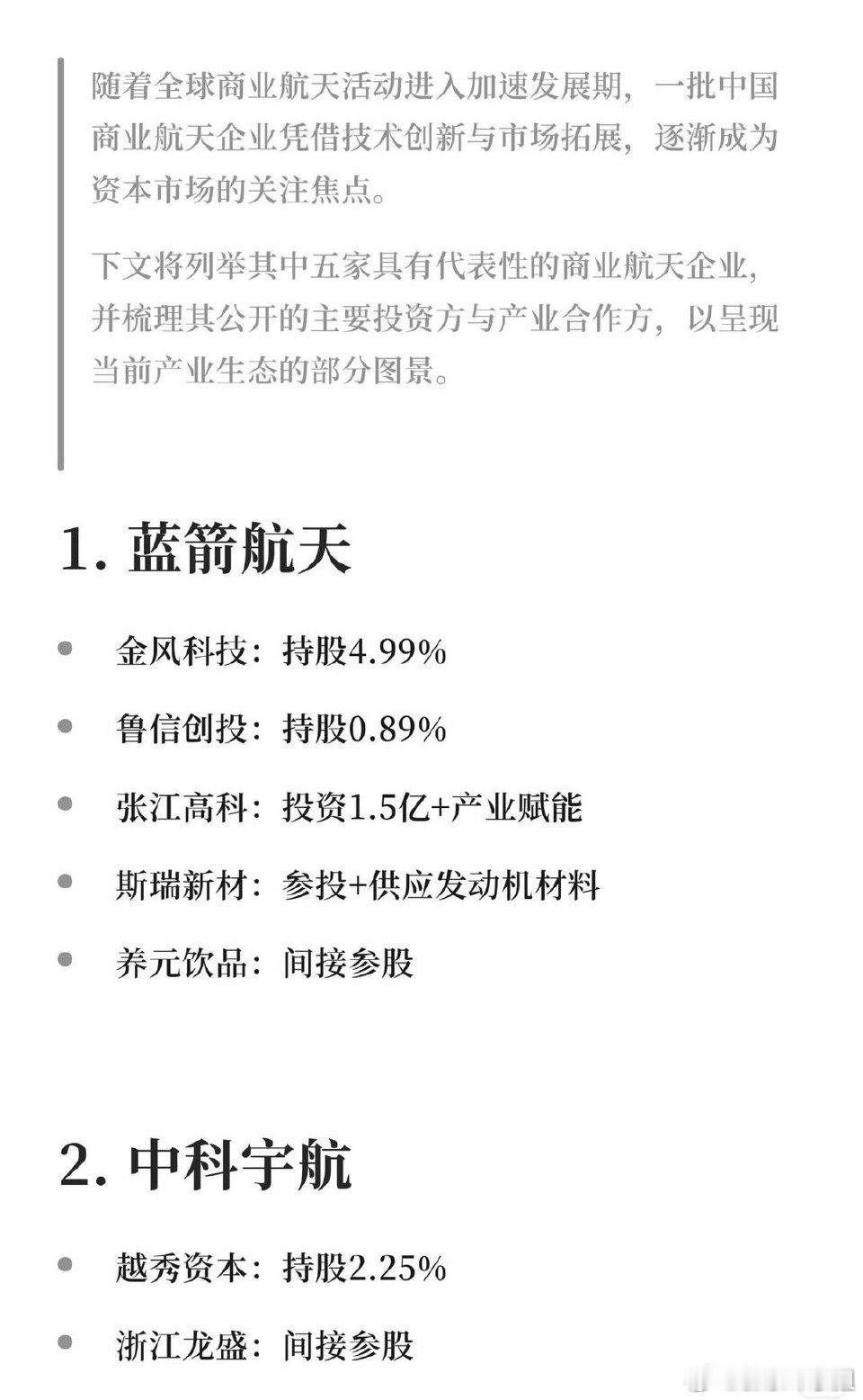 中国商业航天产业快速发展,五家“独角兽”企业——蓝箭航天、中科宇航、天兵科技、国星宇航、微纳星空——即将上市,吸引众多知名资本和产业公司参股或合作,形成紧密的产业与投资生态。各企业及主要投资方/合作方(仅列代表性持股情况):1. 蓝箭航天 - 金风科技(持股4.99%) - 鲁信创投(持股0.89%) - 张江高科(投资1.5亿+产业赋能) - 斯瑞新材(参投+供应发动机材料) - 养元饮品(间接参股)2. 中科宇航 - 越秀资本(持股2.25%) - 浙江龙盛(间接参股)3. 天兵科技 - 中信建投(直接持股0.67%) - 水晶光电、双环传动(均间接持股0.26%) - 海翔药业(间接持股0.16%) - 天汽模(间接持股0.005%)4. 国星宇航 - 新疆交建(直接持股0.54%) - 大众公用(间接持股0.41%) - 新华网(直接持股0.22%)5. 微纳星空 - 国泰海通(直接持股0.838%) - 越秀资本(持股0.596%) - 盛邦安全(战略投资+产业协同) - 中际旭创(基金持股0.02%)此外还有深圳能源、七匹狼(通过深创投)、粤电力A等间接参股相关企业。关键信息:- 多家上市公司通过直接投资或产业合作参与商业航天赛道。- 资本背景多元,涵盖券商、制造业、能源、传媒等领域。- 信息仅供静态梳理,不构成投资建议,需注意股市风险。