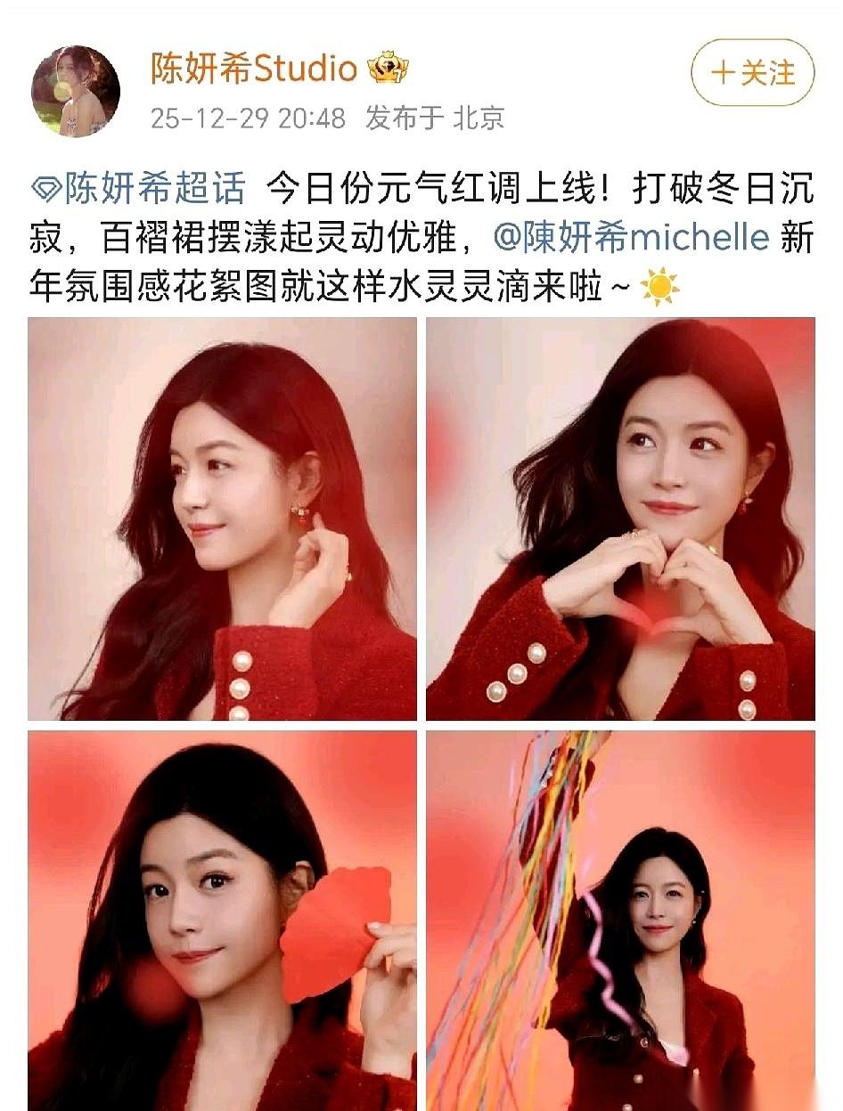 陈妍希那组红衣照,一开始我还真没觉得有什么特别。 不就是女明星的营业图吗?直到我把照片放大,才看明白那股劲儿。 镜头里,冬天的光线其实挺硬的,冷冰冰的。但她一出现,那抹红不是生硬地扎进画面,而是像一团温火,把周围的空气都烘暖了。 你看她的笑,不是那种嘴角上扬、模式化的笑。她的眼睛里有东西,亮晶晶的,带着一点点狡黠,好像在跟你分享一个藏了好久的小秘密。 最绝的是,那身红裙子在她身上,一点都不俗气。它没有压住人,反而被她整个人的气场给“穿活了”,整个人水灵灵的,像一颗刚摘下来的樱桃,饱满又清甜。 很多人觉得红色是用来“镇场子”的,得配上大浓妆、大波浪。 她偏不。 清清爽爽地站在那,就告诉你一件事:真正有元气的人,不是靠颜色壮胆,而是她自己,就能把一个颜色点亮。