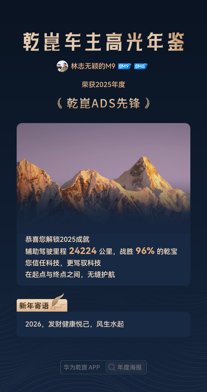 和爱车行万里路,感受M9的科技与豪华,和爱人行万里路,感受爱情的美妙、感受大自然的宏伟。华为乾崑 乾崑智驾 鸿蒙座舱 买车就买乾崑智驾 华为乾崑车主年度海报