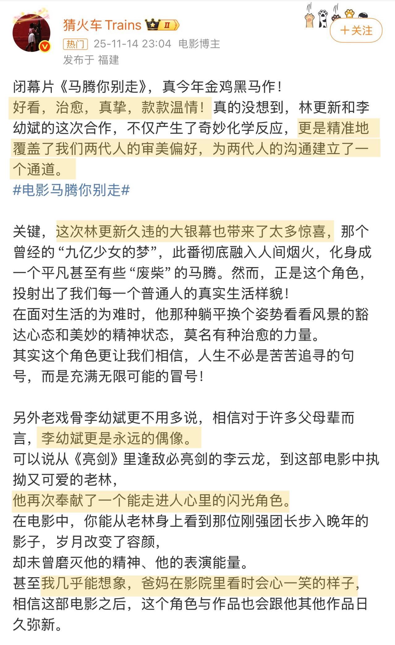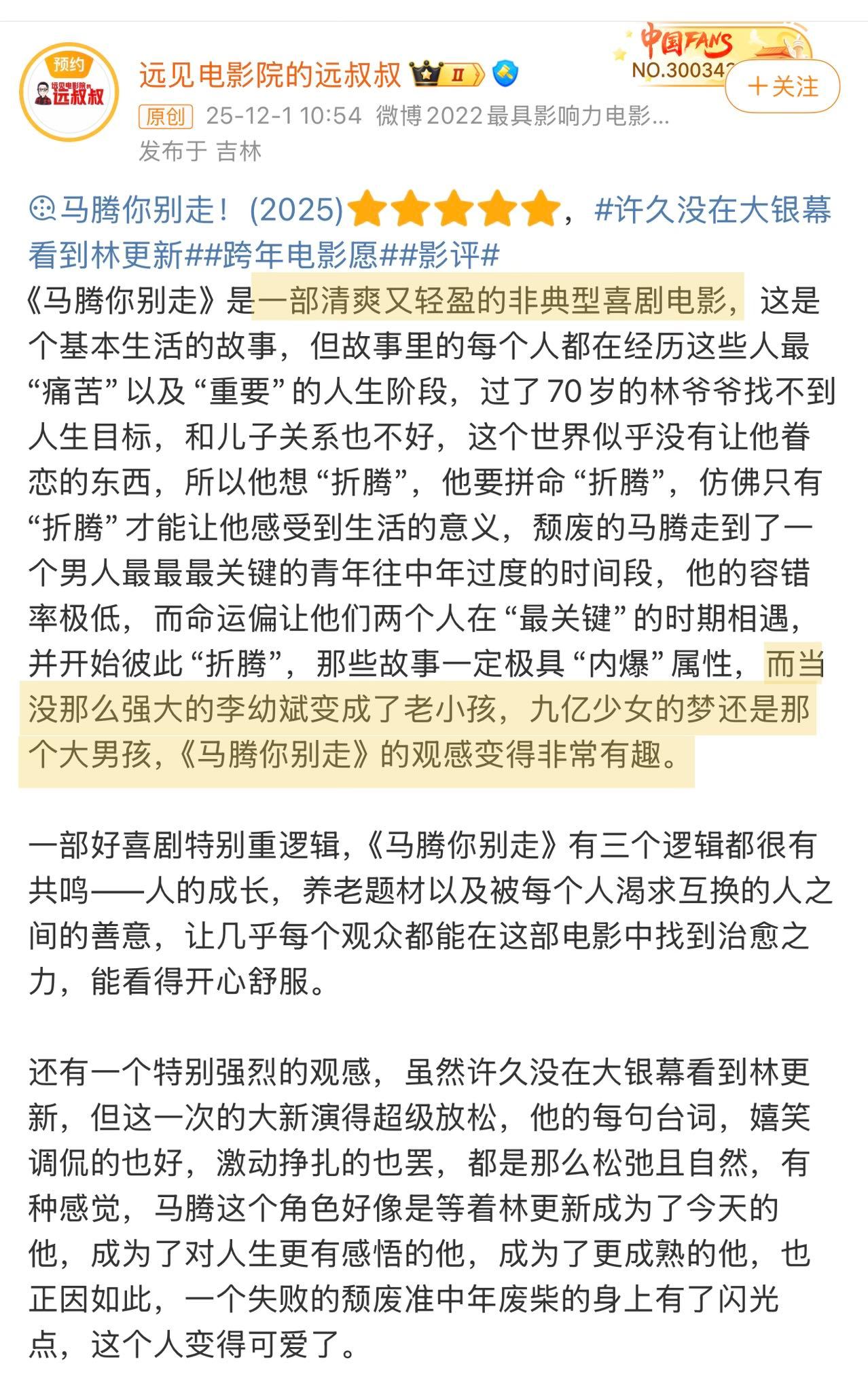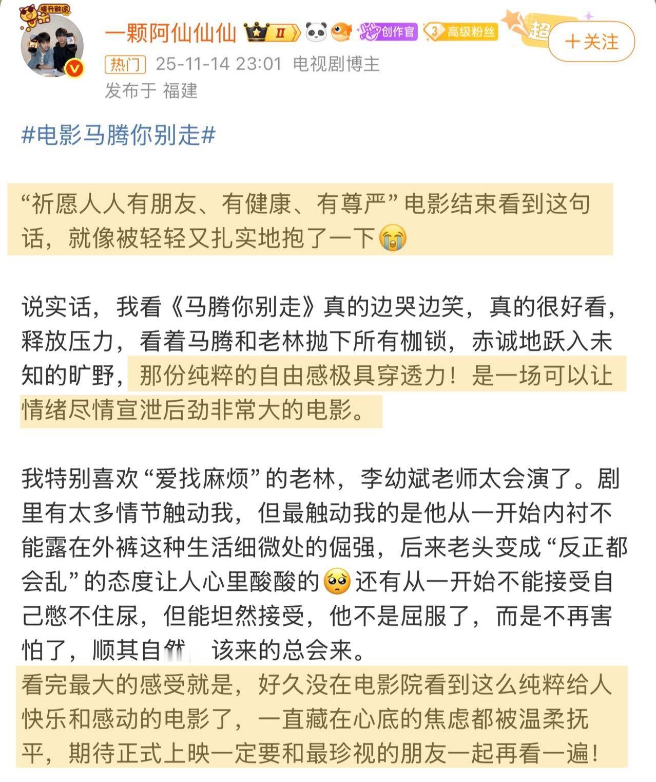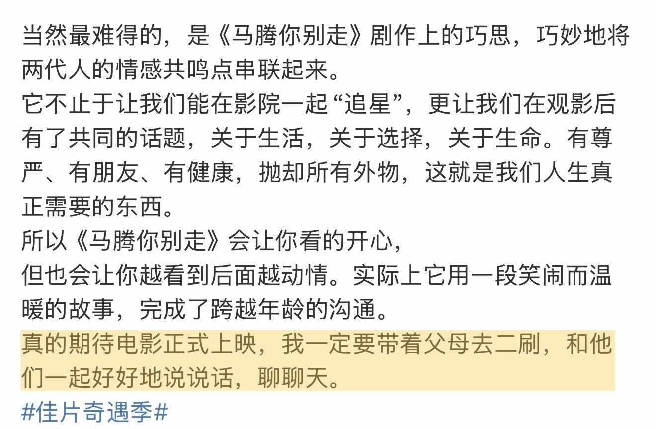 电影马腾你别走点映口碑 去年年末在金鸡放映时就被狠狠种草,2026年开年终于等来了《马腾你别走》的点映!已经“尝鲜”的观众称它是“清爽又轻盈的非典型喜剧”“观感有趣”“后劲很大”“看完就像被轻轻又扎实地抱了一下”“好久没有在大银幕上看到林更新和李幼斌了,好惊喜值回票价”。电影里“废柴”青年马腾与倔强的退休工人老林因“生死委托”相遇,走上相互救赎的旅途。影片最动人的地方也在于,无论是年轻人对当下的迷茫,或是长辈在面对衰老时的孤独,电影都“看见”并给出了的“解法”,这种跨越年龄的理解与共鸣,让人感到治愈感满满。而片尾那句“祈愿人人有朋友、有健康、有尊严”的祝福,不仅是电影的情感落点,更像是一份送给每一位观众的新年礼物。它给人的观感更像贺岁档一款清爽的甜点,与岁末年初的治愈氛围完美契合,元旦假期无论是带父母共同体会代际之间的理解与包容,还是约上好友一同感受一份纯粹又笑泪交织的温暖,都是很好的选择。愿我们都能从这部电影开始,带着善意与勇气,走进新的一年。
