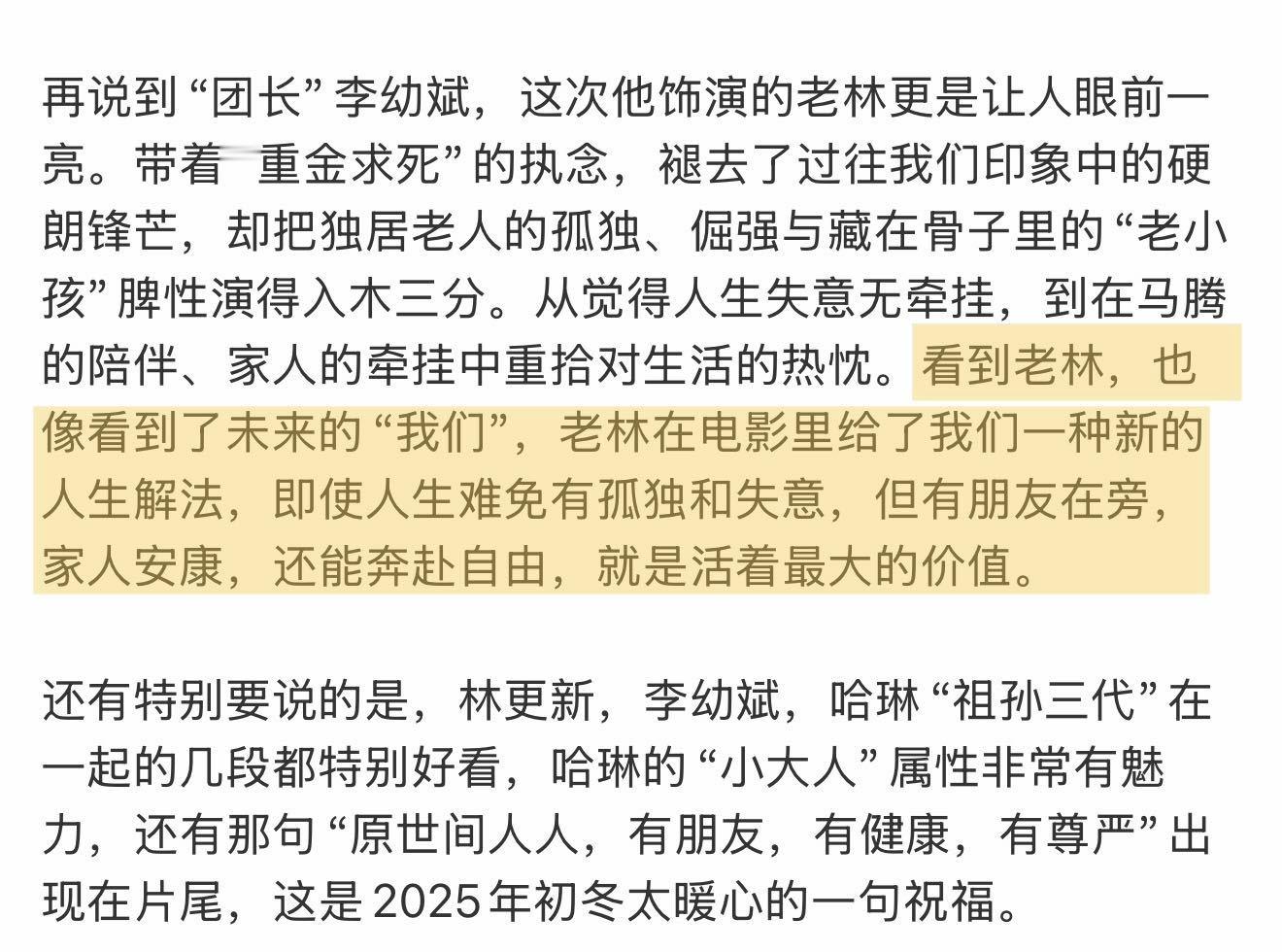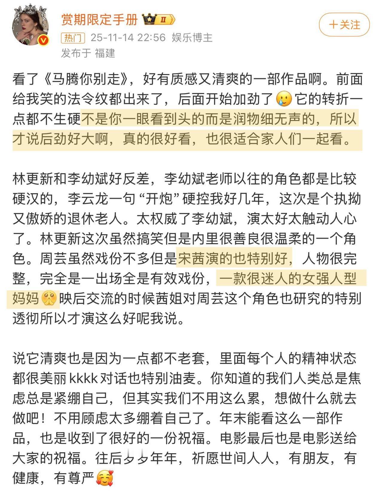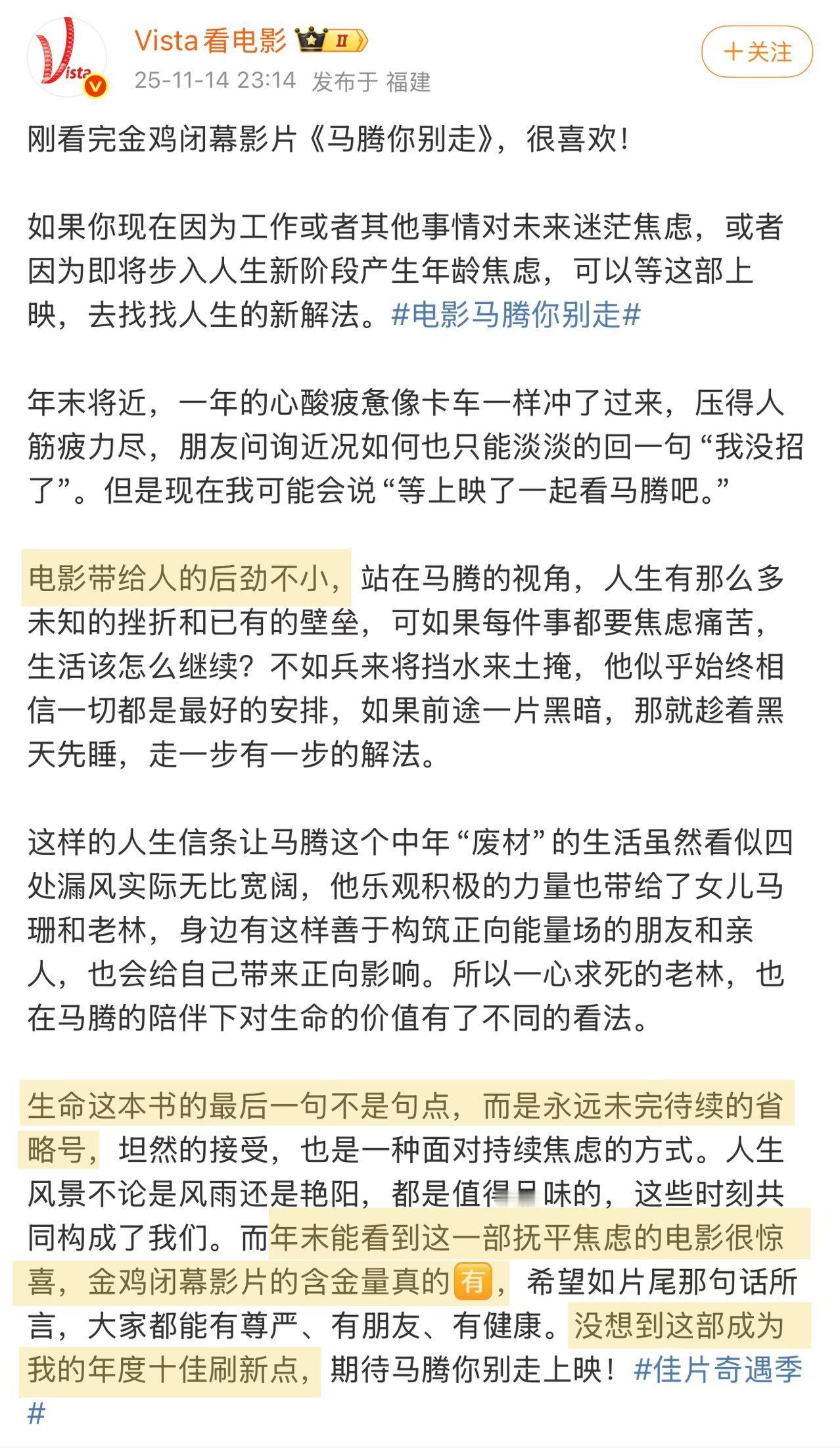 电影马腾你别走点映口碑 去年年末在金鸡放映时就被狠狠种草,2026年开年终于等来了《马腾你别走》的点映!已经“尝鲜”的观众称它是“清爽又轻盈的非典型喜剧”“观感有趣”“后劲很大”“看完就像被轻轻又扎实地抱了一下”“好久没有在大银幕上看到林更新和李幼斌了,好惊喜值回票价”。电影里“废柴”青年马腾与倔强的退休工人老林因“生死委托”相遇,走上相互救赎的旅途。影片最动人的地方也在于,无论是年轻人对当下的迷茫,或是长辈在面对衰老时的孤独,电影都“看见”并给出了的“解法”,这种跨越年龄的理解与共鸣,让人感到治愈感满满。而片尾那句“祈愿人人有朋友、有健康、有尊严”的祝福,不仅是电影的情感落点,更像是一份送给每一位观众的新年礼物。它给人的观感更像贺岁档一款清爽的甜点,与岁末年初的治愈氛围完美契合,元旦假期无论是带父母共同体会代际之间的理解与包容,还是约上好友一同感受一份纯粹又笑泪交织的温暖,都是很好的选择。愿我们都能从这部电影开始,带着善意与勇气,走进新的一年。