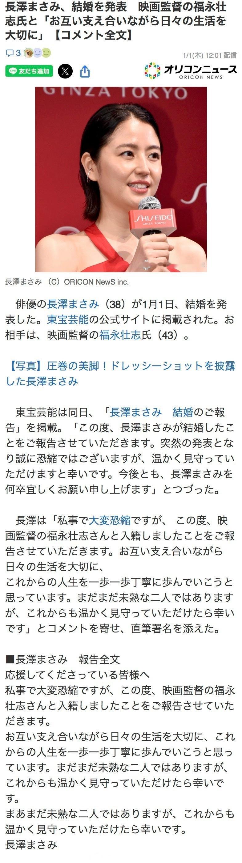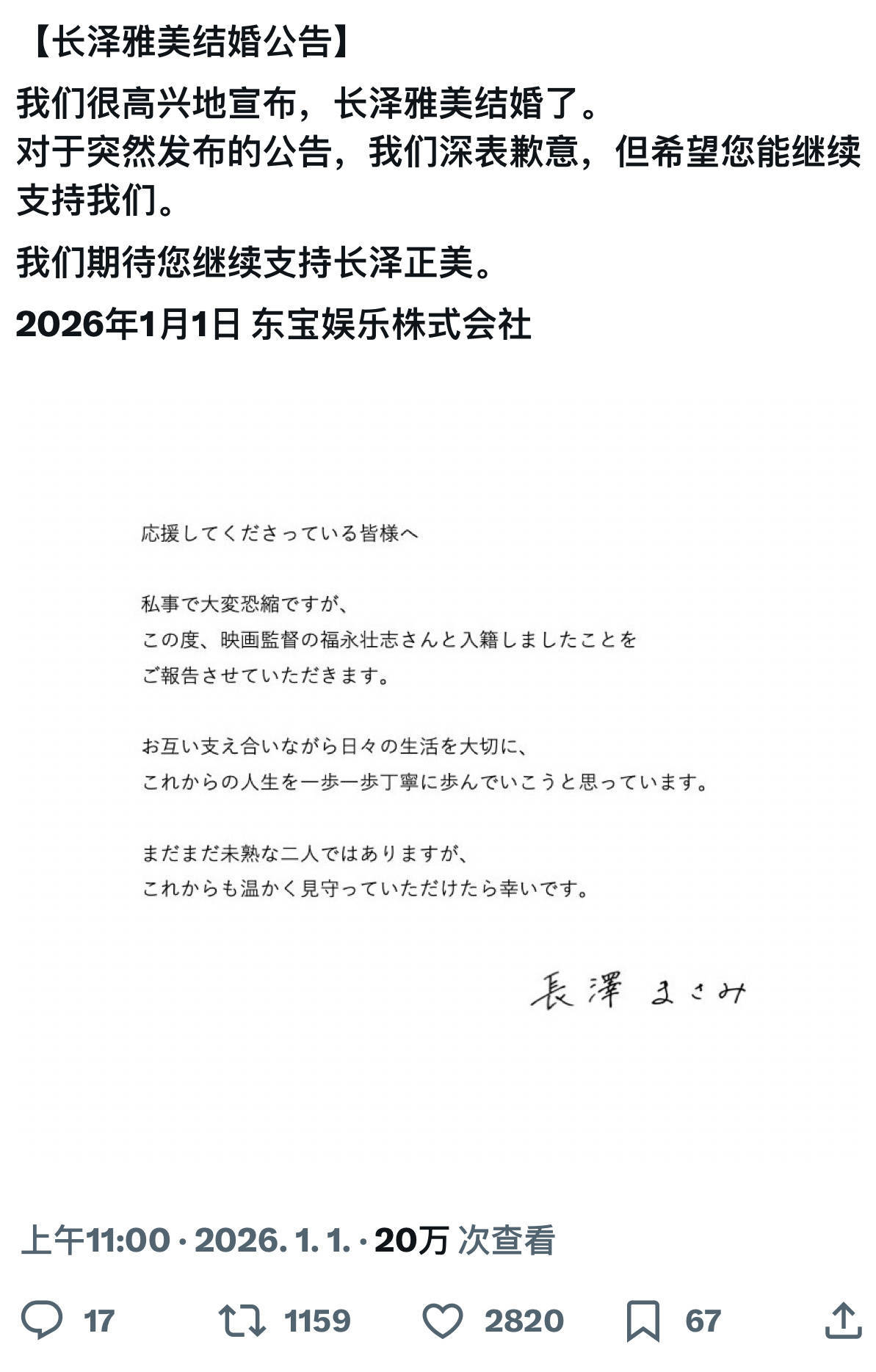 长泽雅美宣布结婚,对方是比她大五岁的电影导演福永壮志(38岁vs 43岁