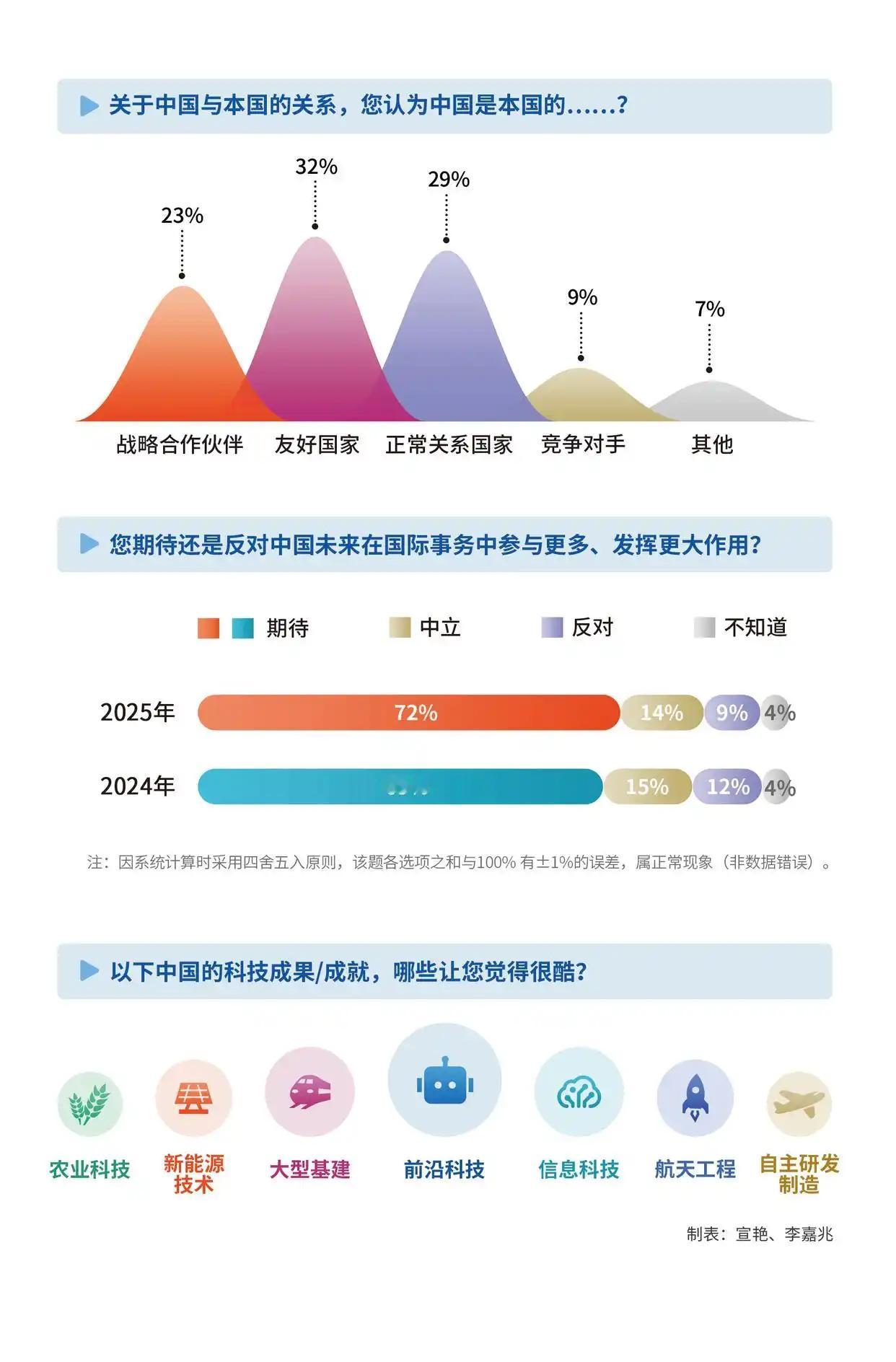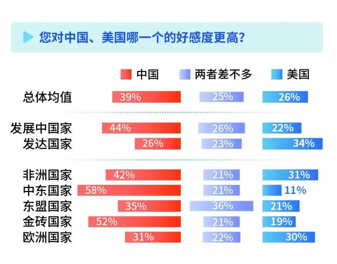 一年过去,世界给中美打分 ! 一项国际调查问卷显示,国际民意对中美好感度比较,中国39%,美国26%,选择两者差不多的比例为25%。中国比2024增加了9个点,美国下降约8个点。 先说这好感度差异背后的原因。美国长期以来在国际事务中扮演着“世界警察”的角色,可这个“警察”却常常不按规则办事。就拿关税战来说,国际民意63%都认为这是美国“单边霸凌之举”或者“破坏国际贸易规则”。 美国挑起的关税战,让全球产业链和供应链都受到了冲击,许多国家的企业都面临着原材料价格上涨、订单减少的困境。 比如德国的汽车制造业,原本从中国进口大量零部件,关税提高后,成本大幅增加,产品价格也不得不上涨,这直接影响了德国汽车在全球市场的竞争力。 而且,43%的国际民意认为关税战让自己的生活成本因此增加。就像普通老百姓去超市买东西,原本价格稳定的商品突然涨价了,大家心里肯定不乐意。 在发展中国家,一些依赖进口商品的行业,如电子产品、日用品等,价格纷纷上扬,让民众的生活压力增大。 再看中国,在国际事务中一直秉持着和平共处五项原则,倡导多边主义,积极推动构建人类命运共同体。在关税战中,中国采取的有力反制措施得到了超70%国际民意的认同。 其中非洲的支持率高达80%,金砖国家、东盟国家、中东国家超过70%,欧洲国家也超过60%。中国在反制关税战的过程中,不仅坚定地维护了自身的产业和经济安全,还通过与其他国家的合作,共同应对贸易保护主义的挑战。 例如,中国与东盟国家加强了贸易往来,签订了一系列自由贸易协定,降低了关税壁垒,促进了区域内商品的自由流通。 这使得东盟国家的农产品、制造业产品能够更顺畅地进入中国市场,同时也让中国的优质商品能够更好地走向东盟国家,实现了互利共赢。 在非洲,中国通过投资建设基础设施、开展技术合作等方式,帮助非洲国家提升自身的产业发展能力。 比如在埃塞俄比亚,中国帮助建设了工业园区,吸引了大量企业入驻,创造了大量就业机会,提高了当地居民的收入水平。这种合作模式得到了非洲国家的广泛认可和好评。 中国好感度的提升还体现在文化交流方面。近年来,中国的文化软实力不断增强,越来越多的中国文化元素走向世界。 中国的电影、电视剧、音乐、舞蹈等艺术形式在国际上受到了越来越多的关注和喜爱。比如中国的古装剧《甄嬛传》在美国、英国等国家播出后,引发了收视热潮,让外国观众对中国古代文化产生了浓厚的兴趣。 中国的传统节日如春节、中秋节等也在全球范围内得到了更广泛的庆祝和传播。在纽约、伦敦等国际大都市,每年都会举办盛大的春节庆祝活动,舞龙舞狮、放鞭炮、吃饺子等传统习俗吸引了大量当地居民参与,让他们亲身感受到了中国文化的魅力。 而美国好感度的下降,除了关税战等经济方面的因素外,还在于其国内政治的极化和社会问题的凸显。美国国内党派斗争激烈,政治极化现象严重,政府在一些重大问题上难以形成有效的决策和行动。 例如在应对气候变化问题上,美国政府的态度反复无常,一会儿退出《巴黎协定》,一会儿又重新加入,这种不负责任的行为让国际社会对美国的信任度大打折扣。 同时,美国国内的社会问题也日益严重,种族歧视、贫富差距扩大、枪支暴力等问题频发,让美国的社会形象受到了极大的损害。就像一个外表光鲜亮丽的人,内部却千疮百孔,自然难以赢得别人的好感。 年终世界给中美打分的这份调查结果,清晰地反映了国际民意对中美两国的看法和态度。中国凭借着积极的外交政策、有力的反制措施和不断增强的文化软实力,赢得了国际社会的广泛认可和好评; 而美国则因为其单边霸凌行为、国内政治极化和社会问题等原因,好感度不断下降。这也提醒着中美两国,在国际舞台上,只有秉持着公平、公正、合作、共赢的原则,才能赢得国际社会的尊重和支持,才能为世界的和平与发展做出更大的贡献。