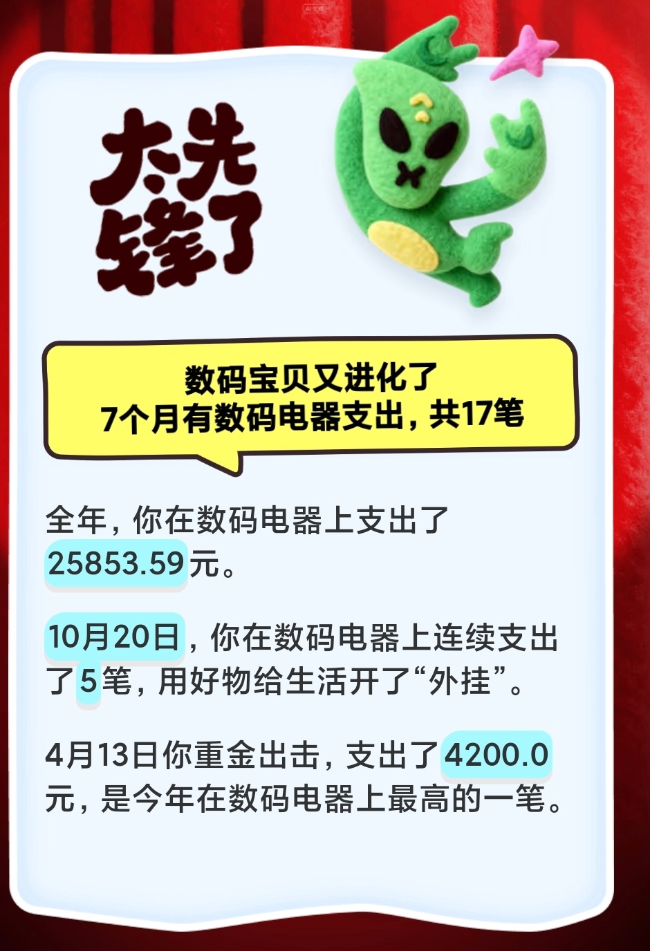 2026新国补来了看了一下,2025年支付宝统计的部分数码电器,消费了25853元。个人感觉不止,实际上的数码产品花费远远不止这个数字。后来停止国补,确实影响比较大,期待2026年更多补贴,数码产品还有很多计划购买的。