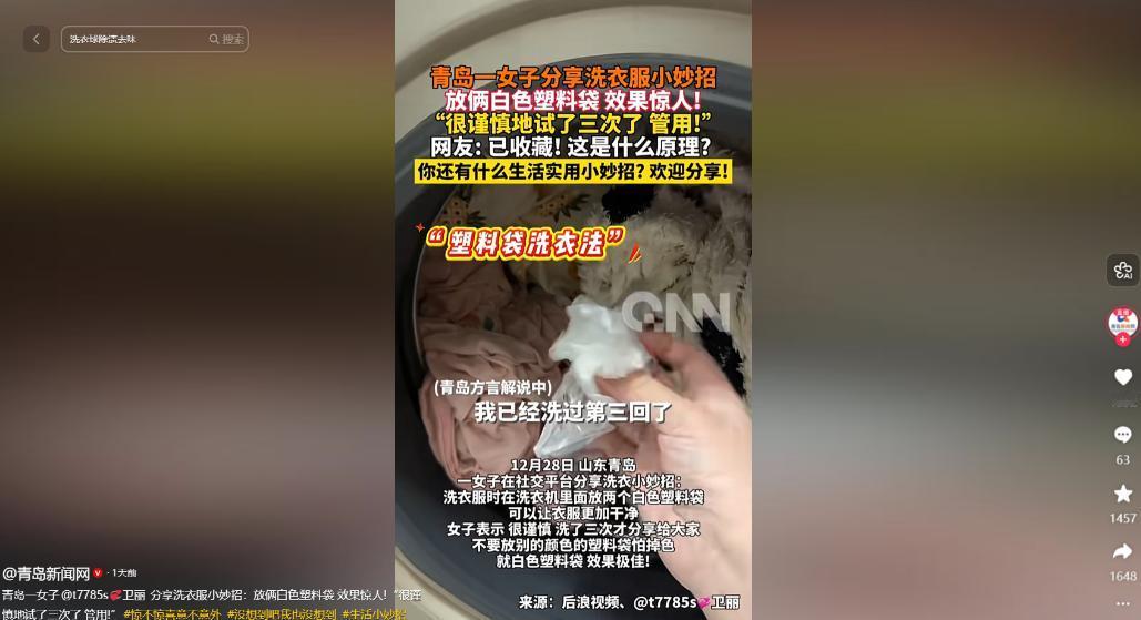 “什么原理?!”山东,一女子用洗衣机洗衣服时,意外发现这次洗过的衣服格外干净,原本洗不掉的污渍都洗干净了!正在疑惑之时,突然发现洗衣机的滚筒里混进去了一个白色塑料袋,而这就是关键所在! 她后来又连续试了三次,每次效果都一样,尤其是家里孩子校服的袖口、领口,以前都得单独手搓,现在扔进洗衣机就能洗干净。 不少网友跟着试了,有人说自家孩子沾了颜料的衣服,洗得比以前干净;也有人说本来以为塑料袋会卡机器,没想到还有这用处。 这不是什么偏方,是专家和家电协会实测过的。 第一个原因是增加了物理摩擦。 咱们都知道,洗衣机洗衣服靠的是滚筒转动,让衣服之间、衣服和筒壁碰撞摩擦,把污渍蹭下来。但有些顽固污渍,比如袖口的汗渍、衣服上的泥渍,单靠衣服之间的摩擦不够,蹭不下来。 白色塑料袋质地轻,在水里会跟着滚筒高速翻滚、折叠,相当于在洗衣机里加了好几个轻薄的摩擦片。它们钻到衣服的褶皱、边角里,和布料反复碰撞,比衣服之间的摩擦更细密,能把粘在纤维深处的污渍再刮下一层。 山东省家电协会做过测试,用同样脏的布,一组加白塑料袋,一组不加,最后用仪器测,加了塑料袋的布残留污渍确实更少,只是差距不大,肉眼看着不明显,专业设备下能看出色阶差异。 第二个原因是能辅助吸走油渍。 专家解释,咱们常用的白色塑料袋大多是PE材质,这种塑料和衣服上的皮脂、饭菜油渍成分相近,按照“相似相溶”的规律,塑料袋表面会短暂吸附油渍,把油渍从衣服纤维上拉到自己身上,再随着水流被冲掉。 这就是为什么对孩子的袖口汗渍、大人的衣领油渍效果特别好,青岛那位女士也是靠这个洗干净了孩子的校服。 还有个辅助作用,塑料袋在水里翻滚,能让洗衣液的泡沫分布得更均匀,洗衣液和污渍的接触面积变大,去污效果也会间接提升。 但要说明白,这方法只对油脂、泥渍这类顽固污渍有用,像墨渍、锈渍、果汁渍这些化学性污渍,塑料袋没什么效果,还得靠洗衣液里的针对性成分,或者提前局部处理。 虽然效果真实,但不是随便放个塑料袋就行,很多人试了出问题,都是没注意这几点。 首先必须选白色、无印刷、没破损的塑料袋,彩色塑料袋上面的油墨遇水会掉色,容易把衣服染花;有印刷的塑料袋添加剂多,还会影响摩擦效果。青岛那位女士特意强调,只放白色塑料袋,就是怕掉色。 其次,塑料袋不能太薄,比如超市的超薄保鲜袋,洗衣机一转就容易被撕碎,产生细小的塑料颗粒,粘在衣服上、堵住洗衣机滤网。 有位网友试了一次,拆开洗衣机滤网,里面全是塑料毛毛和袋子边角,清理了半小时才干净。建议选普通购物袋厚度的,厚度≥0.025mm的合规PE袋最好,撕去提手,避免缠绕洗衣机转轴。 然后是面料问题,纯棉、牛仔、化纤这些耐摩擦的面料可以用,羊毛、真丝这些娇贵面料不能用。额外的摩擦会让这些面料起球、抽丝、变形,得不偿失。 还有洗衣液不能省,塑料袋只是辅助,不能替代洗涤剂,该放多少还得放,最多能少放一点,青岛宝妈实测,洗衣液用量减半就够,多了反而会有泡沫残留。 还要注意用量,衣服少放1-2个,衣服多放3-4个就行,放多了会占地方,影响衣服翻滚,反而没效果。滚筒洗衣机可以把塑料袋打个结,防止滑进门缝里缠绕;波轮洗衣机直接放进去就行。 洗完衣服后,一定要清理洗衣机滤网,把可能残留的塑料碎屑、纤维清理干净,避免堆积堵塞排水口,之前就有人因为塑料碎屑堵了排水口,花几百块修洗衣机。 还有个环保风险要提醒,塑料袋破损产生的微塑料,排到下水道会污染环境,虽然目前没有权威数据说对人体有直接危害,但能避免就避免。 如果想提升去污效果,又不想用塑料袋,可以用旧毛巾卷成筒状放进去,或者用洗净的PET饮料瓶,这些东西不容易破损,还能重复用,环保又安全,效果和塑料袋差不多。 洗衣机里放白塑料袋能让衣服更干净,是真实有效的,但不是万能的,核心是靠增加摩擦和辅助吸油渍,只对特定污渍有用。选对袋子、用对方法,能省不少手搓的力气;用错了,要么染坏衣服,要么损坏洗衣机。 对于此事,你有怎样的见解?欢迎在评论区分享你的观点。