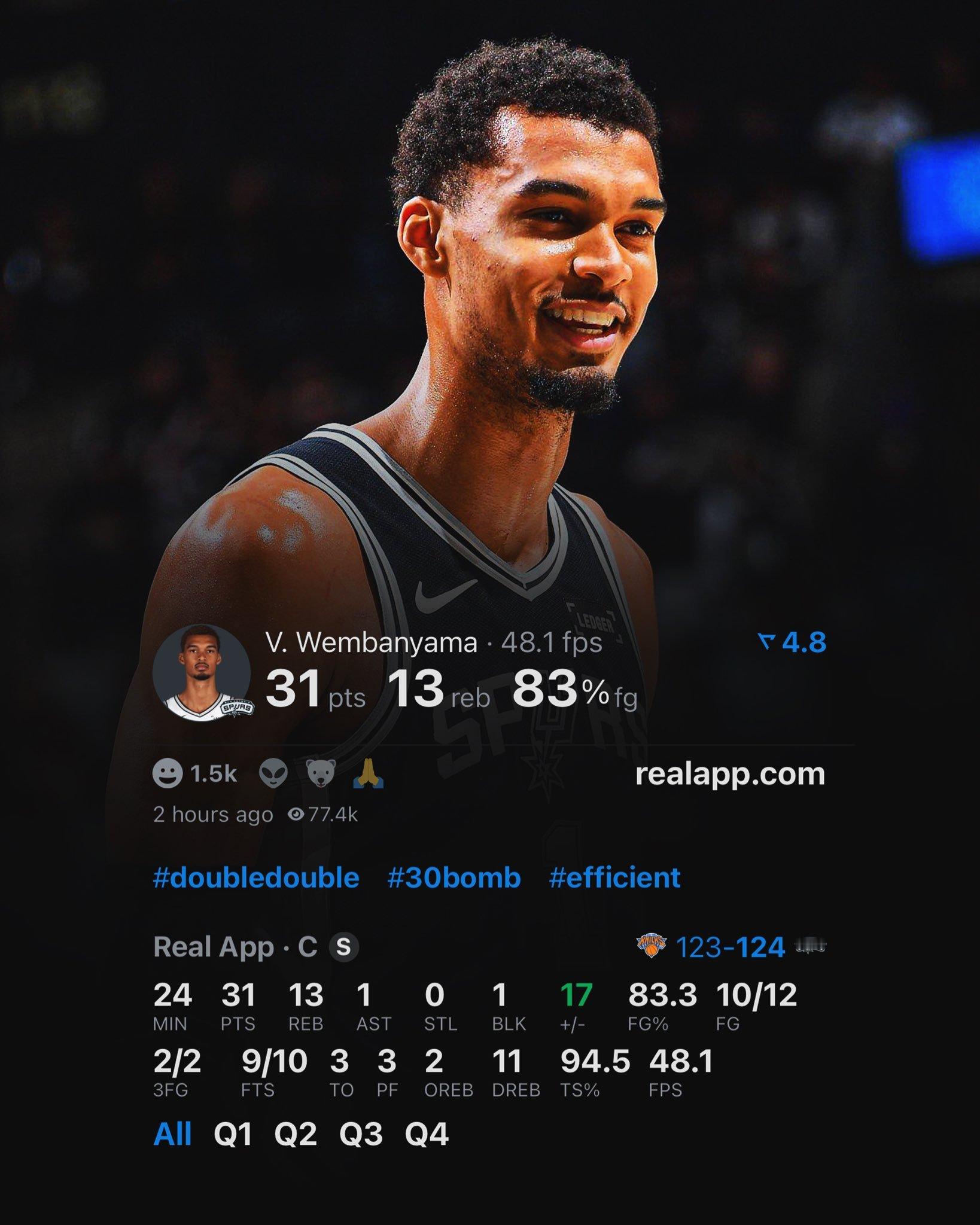 在瓦塞尔缺阵,文班末节初伤退,卡斯尔又疯狂打铁的情况下,马刺靠着尚帕尼生涯之夜的11记三分,福克斯的末节13分3助攻,以及关键时刻科内特和KJ的前板,成功复仇了尼克斯。文班伤退前12中10拿了31+13,最后时刻在场边表情轻松,这可能是更好的消息。尼克斯vs马刺NBA