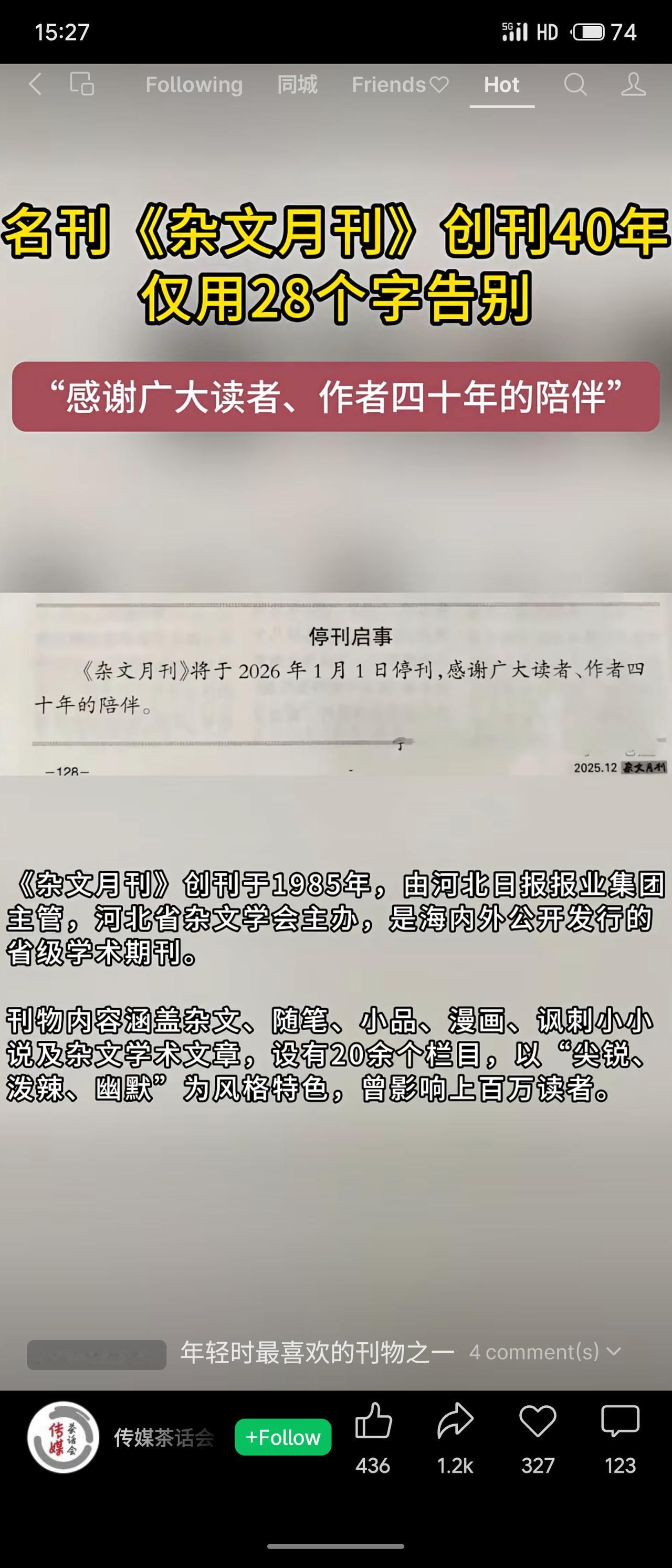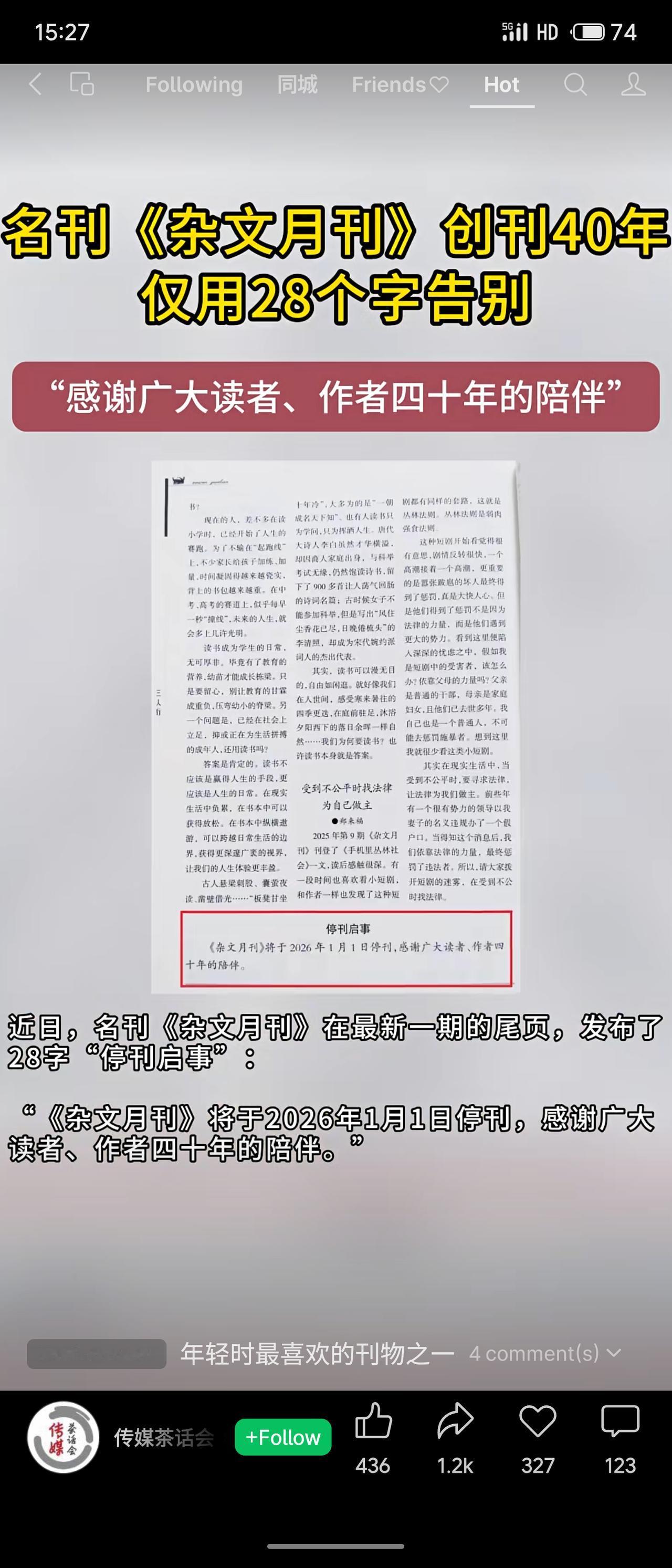 创刊于1985年的知名杂志《杂文月刊》宣布将于2026年1月1日停刊。其告别方式极为简洁,仅用28字启事感谢了读者与作者四十年的陪伴。该刊以“尖锐、泼辣、幽默”的杂文风格著称,曾拥有广泛影响力。