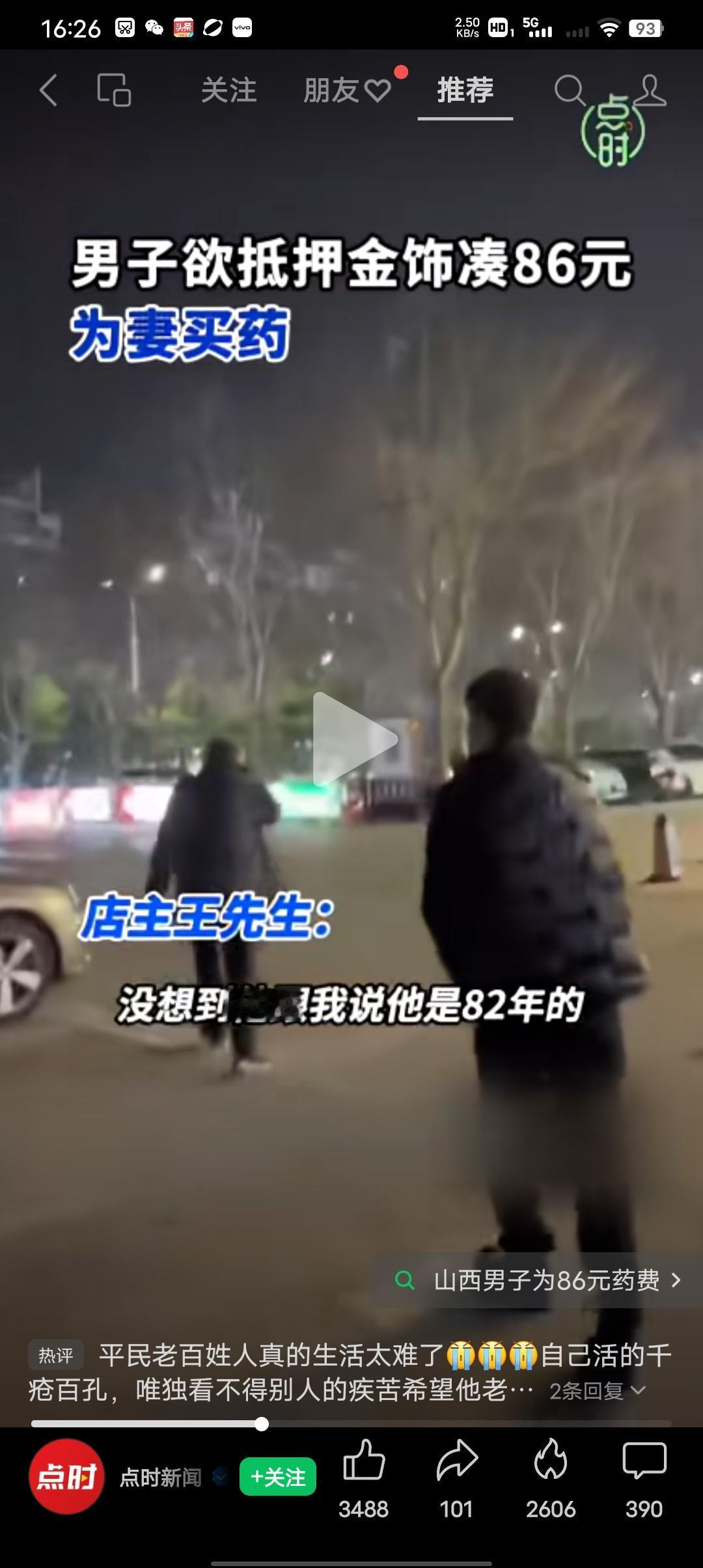 86块钱就当掉了一个40多岁男人的自尊! 山西运城店主王先生:他进来的时候,我以为他的年龄有六七十岁了,后来他才说他是八二年的,因为他的妻子得了重病,他在工地打工,工地黑心的老板拖欠了,他工资,也许是他妻子的病太重愁白了头发。大哥都这样了,那位狠心的老板怎么能这样?他还有心吗? 他说他是给妻子买药的,而他的口袋里只有21块钱,他想拿自己的项链做抵押,可其它店里他们都不收,当时我也没想起他的,我就说你的项链我不收,我给你钱你先去买药。当这位大哥提到他的妻子的时候就哭了,我相信他绝对不是骗人的,一个七尺男儿就这样的在别人眼前流泪,一定是难到了极点,他可以要100要 200 ,但他只要86元。 我当时拿了100块钱只想让大哥赶紧去给他老婆买药,没想那么多,也许这位大哥感觉白拿我的钱不好意思,所以他就转身离开了,在我再三的强求下大哥才收了100块钱,然后说三天以后会给我送来。 有人一顿饭吃好几千块钱,有人贪污受贿好几万,有人却86块钱药钱都凑不齐,这个世界穷人的路真的太难走了,特别是一个家庭中一人得了重病,那么这个家庭真的是雪上加霜。 令人欣慰的是这个世界还是有温度的,虽然这个世界破破烂烂,但是总有人在缝缝补补!