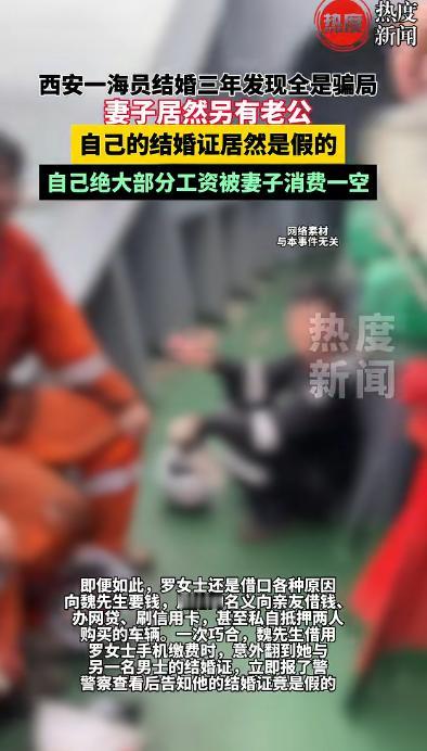 12月30日,陕西西安,海员魏先生休假在家,无意中翻看老婆罗女士的手机,没想到竟从中看到了罗女士跟别人的结婚证,报警查证后才知道,原来自己跟老婆的结婚证竟然是假的,而手机中老婆跟别人的结婚证才是真的!   一起离奇的“假结婚”事件在网络上引发关注,作为海员的魏先生(化名)怎么也没想到,自己辛苦维系了三年的婚姻,竟然从一开始就是一场骗局。   由于工作性质特殊,他常年随船出海,一次航行短则三五个月,长则半年以上,真正陪伴家人的时间并不多,为了这个家,他吃过苦、熬过夜,把大部分时间和精力都交给了大海,在他看来,虽然聚少离多,但只要婚姻真实、家庭稳定,这些付出都是值得的。   三年前,经人介绍,魏先生认识了孙女士(化名),两人相处一段时间后登记结婚,并领取了“结婚证”,由于工作繁忙,加上对对方的信任,魏先生并未对证件的真伪产生怀疑,婚后,他依旧常年在外跑船,经济上尽力支持家庭,情感上也尽量保持联系,认为自己尽到了丈夫的责任。   前不久,魏先生在忙碌工作后,本打算好好休整,弥补长久以来缺席的陪伴,然而,未曾料到,他在家偶然间间打开妻子手机的时候却看到了一张结婚证照片,起初他并未在意,但当他仔细查看后却发现,证件上的新郎并不是自己,而是另一个陌生男子。   这一发现让魏先生心生疑虑,他第一时间与孙女士沟通,但对方的解释含糊其辞,无法自圆其说,为了弄清真相,魏先生选择报警,并通过相关部门核实婚姻登记信息。   调查结果让他彻底崩溃,他与孙女士所谓的“结婚证”并未在民政系统登记备案,属于伪造证件,而手机中那张与他人登记的结婚证,才是真实、合法的婚姻关系。   也就是说,在过去三年里,魏先生一直生活在一段并不受法律保护的“婚姻”中,而他的合法身份从未真正存在过,面对这一结果,魏先生既愤怒又无奈,他表示,自己常年不在家,对婚姻细节疏于关注,是对对方的信任让自己放松了警惕。 事件曝光后,迅速引发网友热议,有人同情魏先生的遭遇,认为其付出多年却被欺骗,令人心寒,也有人提醒,婚姻登记关乎法律权益,无论多忙都应亲自核实,切不可掉以轻心。   目前,相关情况仍在进一步处理中,对魏先生来说,这不仅是一段感情的破裂,更是一次沉重的现实教训,常年漂泊在海上的他,或许从未想过,最难防的风浪,竟然来自岸上的生活。  信息来源 :热度新闻