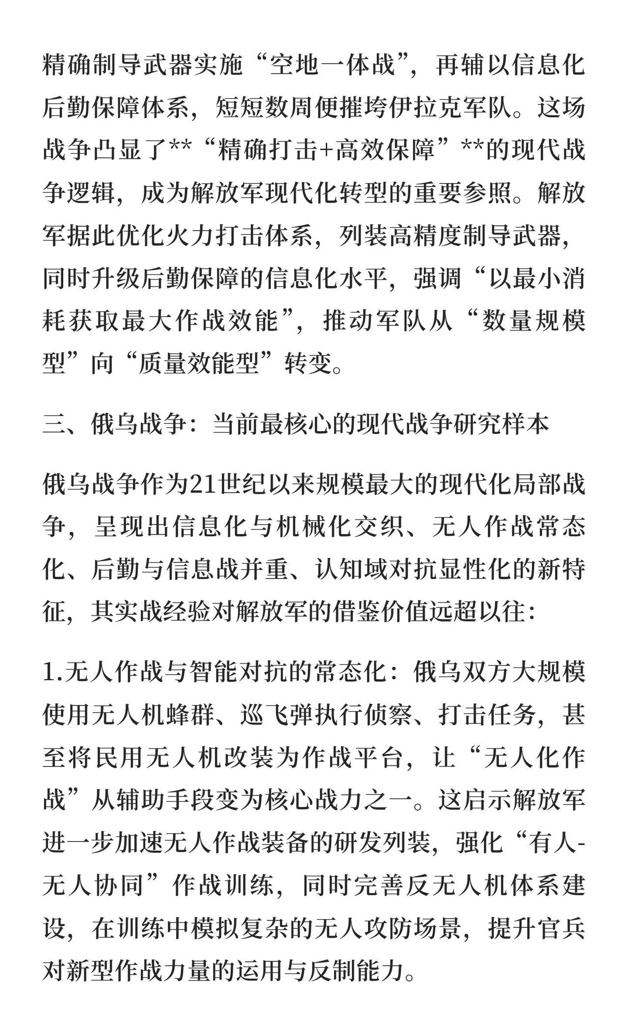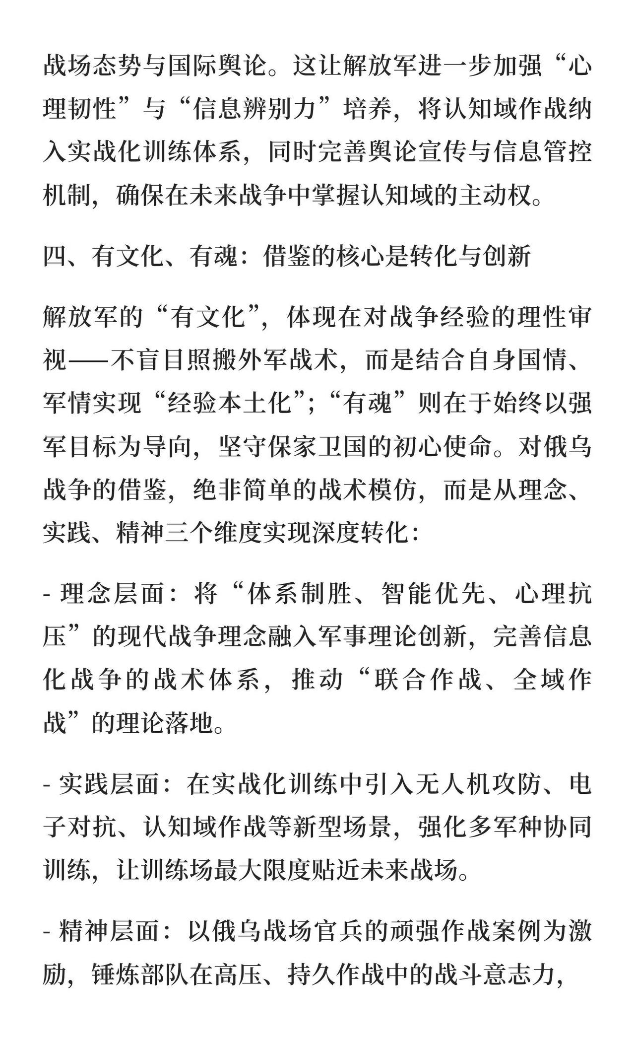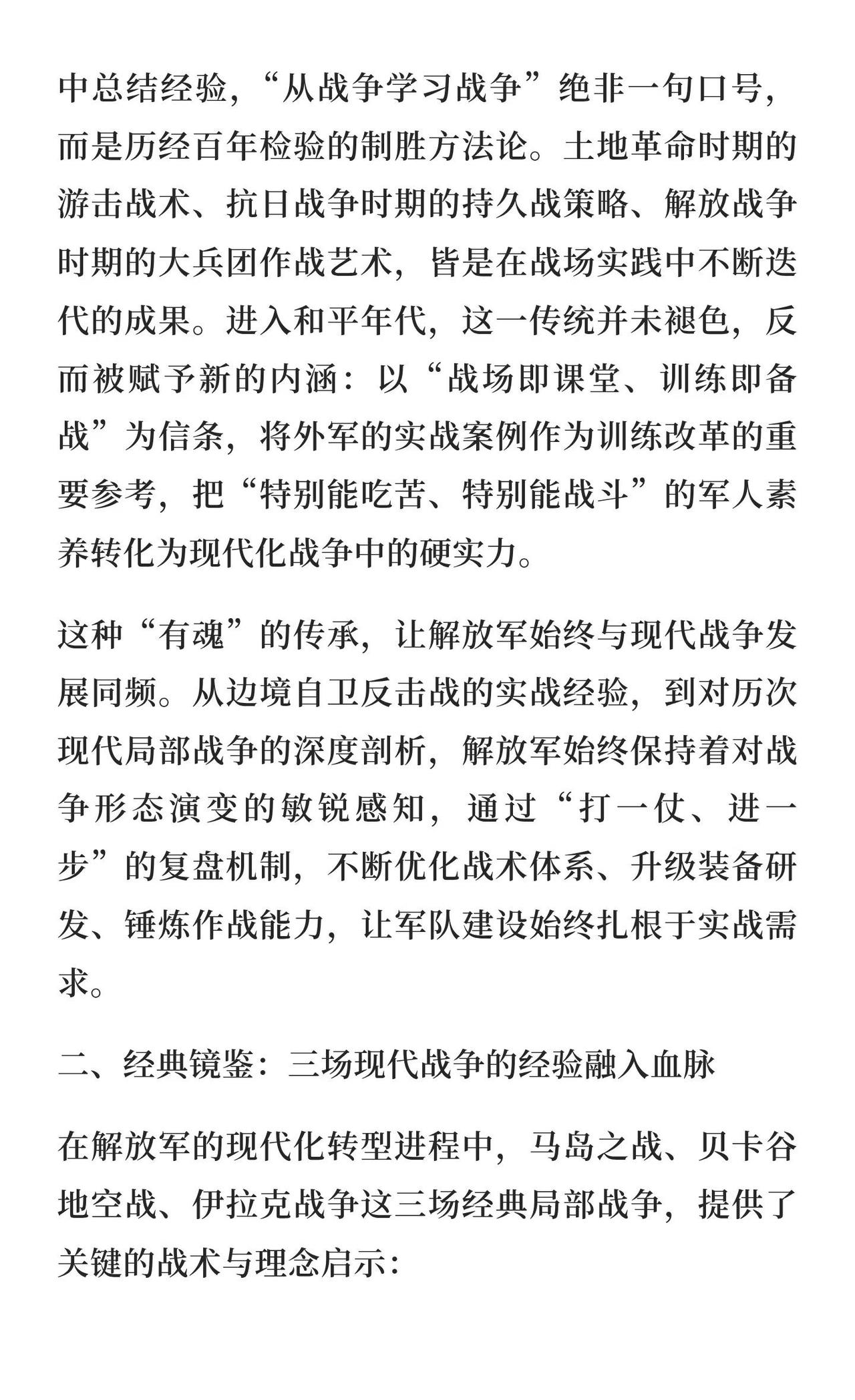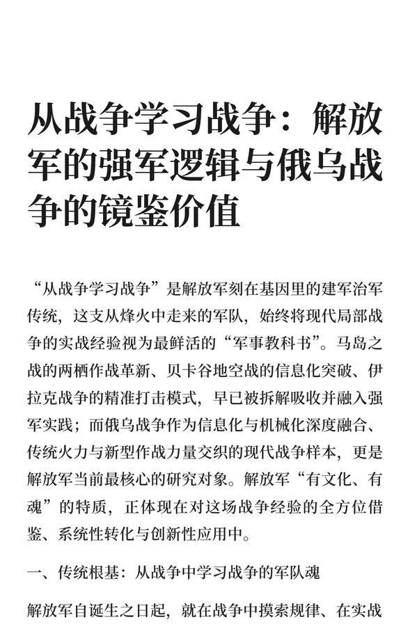 从战争学习战争:解放军的强军逻辑与俄乌战 解放军通过“从战争学习战争”不断优化战术体系,借鉴马岛、贝卡谷地、伊拉克战争经验,尤其俄乌战争为当前研究重点,推动现代化转型,提升体系化作战能力,确保未来战争制胜。