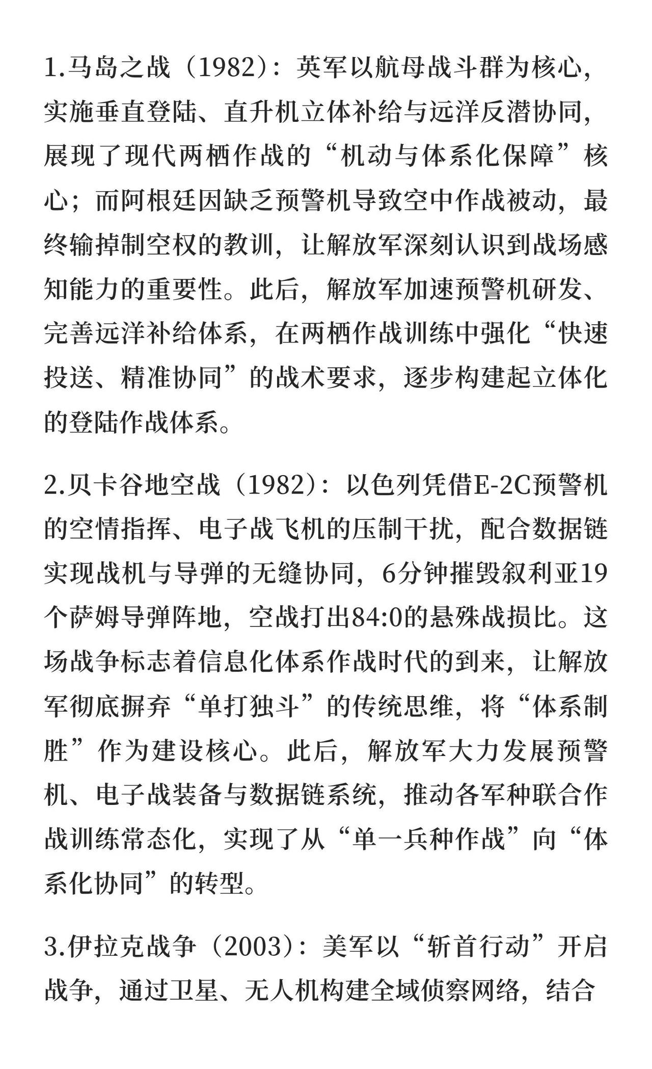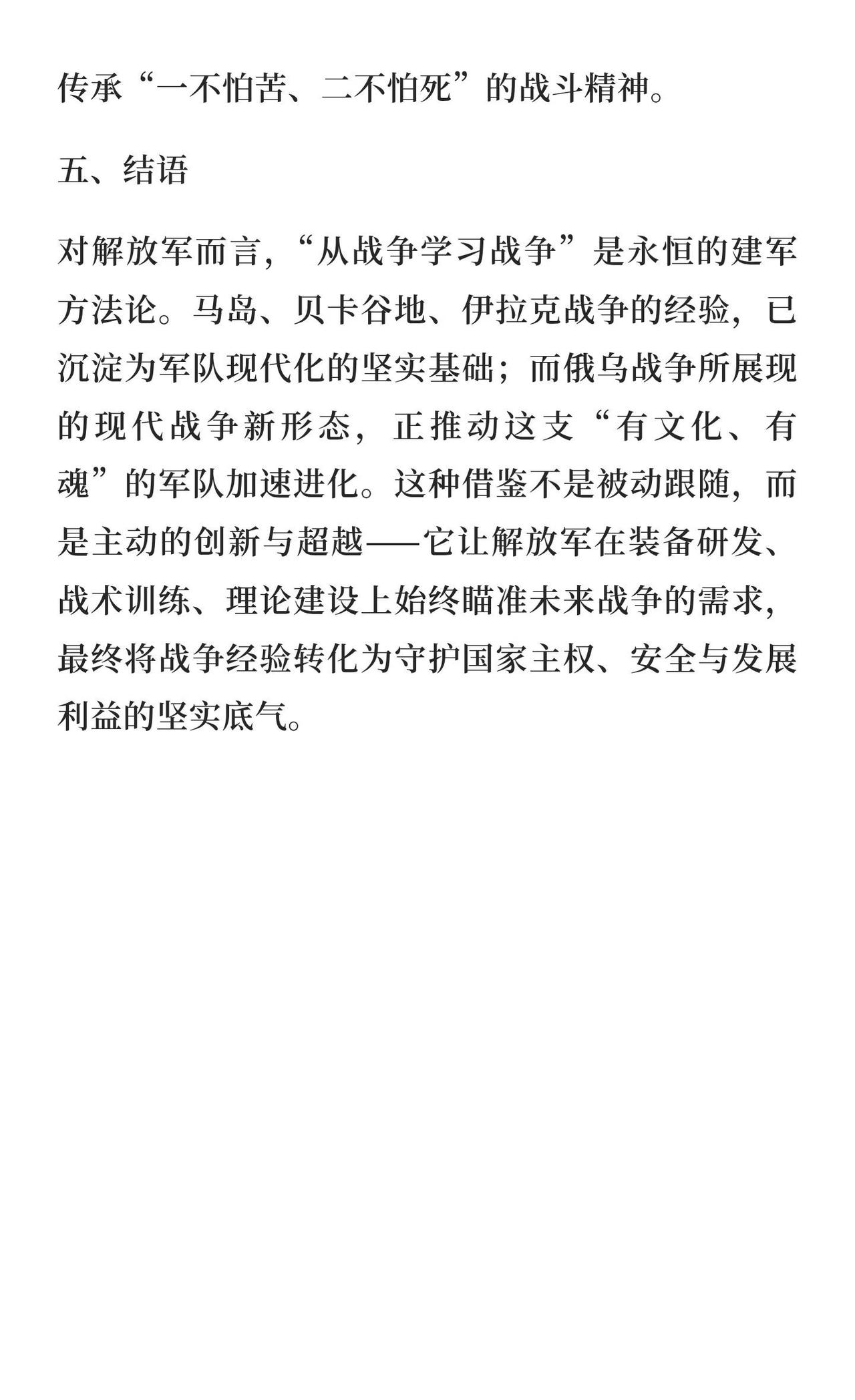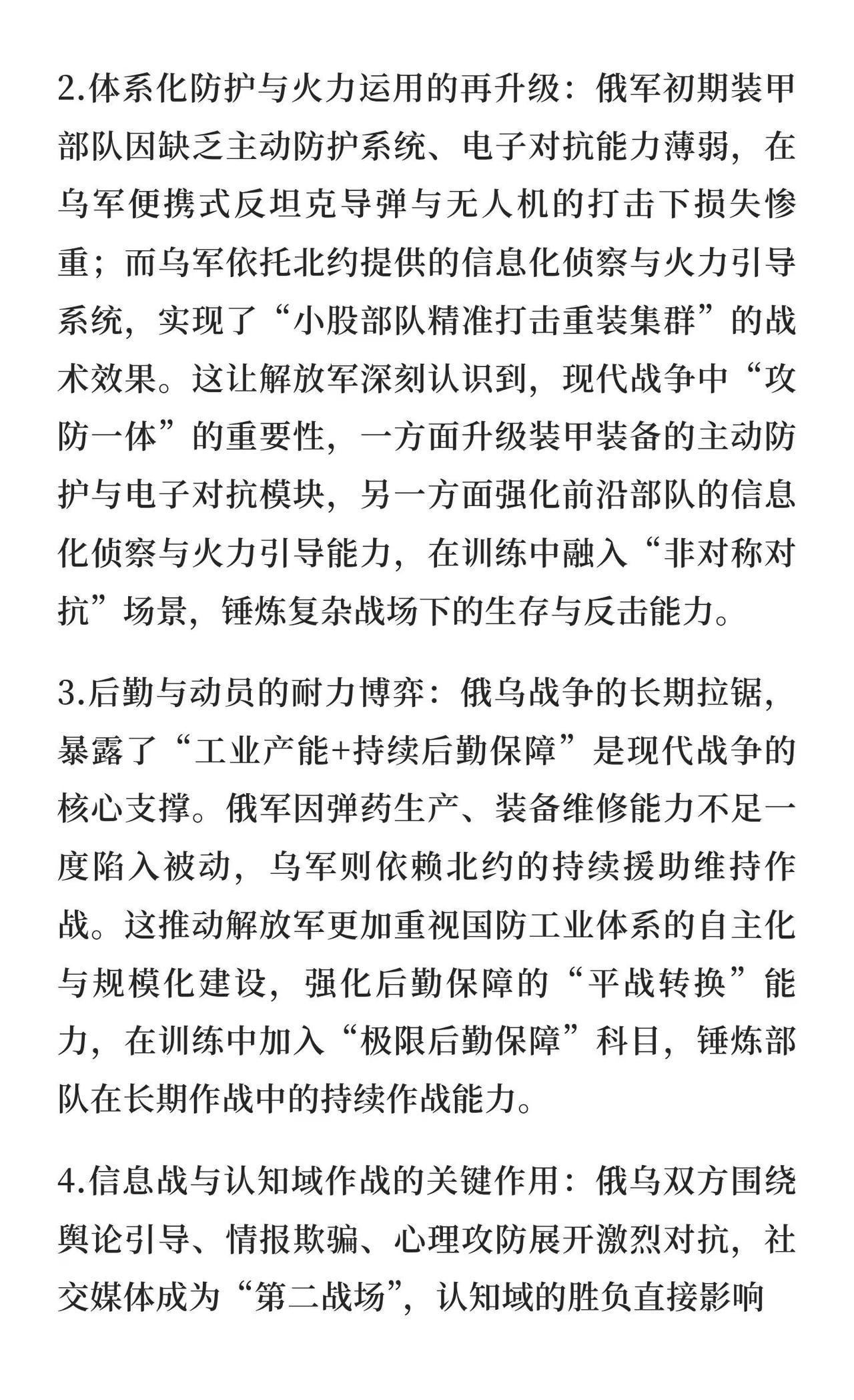 从战争学习战争:解放军的强军逻辑与俄乌战 解放军通过“从战争学习战争”不断优化战术体系,借鉴马岛、贝卡谷地、伊拉克战争经验,尤其俄乌战争为当前研究重点,推动现代化转型,提升体系化作战能力,确保未来战争制胜。