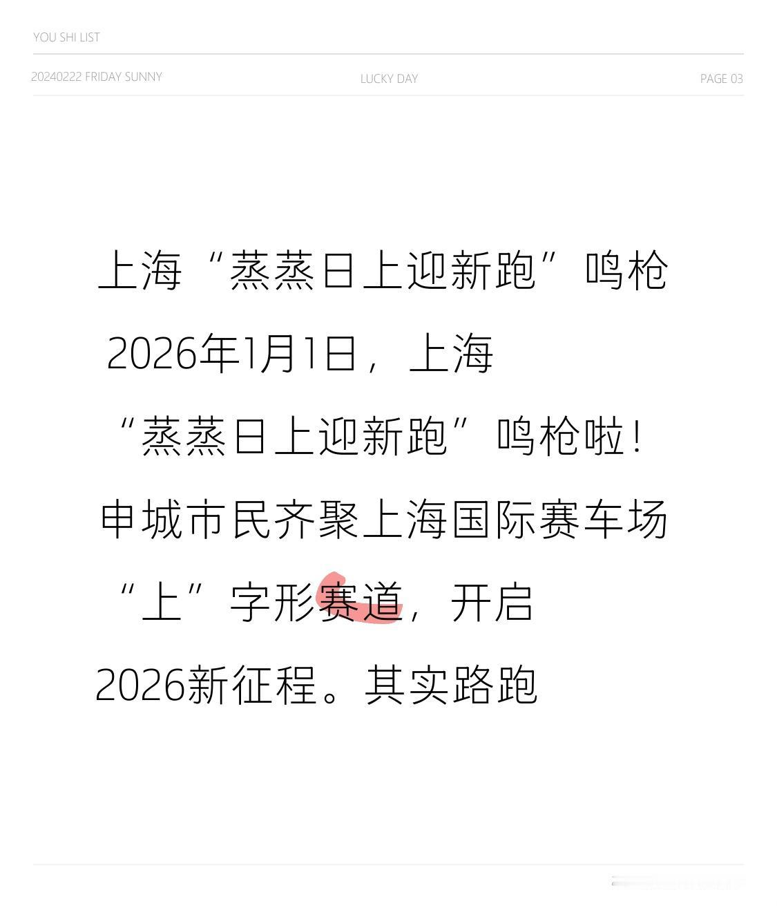 上海“蒸蒸日上迎新跑”鸣枪 2026年1月1日,上海“蒸蒸日上迎新跑”鸣枪啦!申城市民齐聚上海国际赛车场“上”字形赛道,开启2026新征程。 其实路跑赛事回归的烟火气早有体现,2023年2月19日第九届赛事,数千跑友就齐聚这里绘出“上”字形轨迹,那次虽没在元旦举办,而是在农历正月最后一天。当时清晨7点,近4500名跑者从各地赶来,即便室外仅6度,大家热情却丝毫不减。赛完后,大家交流心得、合影留念,跑团旗帜挥舞。这迎新跑,不仅是一场跑步活动,更是大家对新一年的美好奔赴。