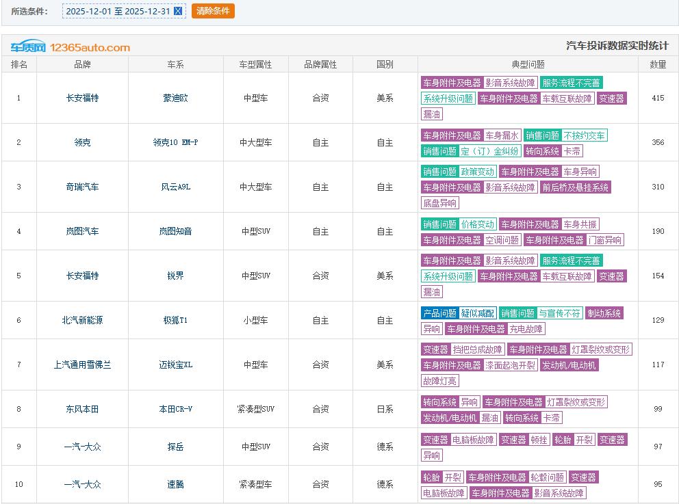 来看车质网12月投诉榜,合资占六席。 -长安福特蒙迪欧以415起投诉登顶,主要问题集中在影音系统故障与车载互联故障。同门锐界以154起投诉位列第五,两者核心痛点高度一致。 -领克10 EM-P以356起投诉位列第二,车身漏水/不按时交车成为投诉重点。 -奇瑞风云A9L则因价格变动被投诉,部分车主认为新款车型增配降价,背刺车主。 -岚图知音因价格变动引发190起投诉,而极狐T1则因疑似减配问题遭到车主不满。 -迈锐宝XL问题集中在档把总成故障、车身附件及电器方面。 -本田CR-V存在转向系统异响、灯罩裂纹、发动机漏油等问题。 -一汽-大众探岳和速腾分列第九和第十,投诉均指向变速器电脑板故障。该问题已持续多个月,覆盖品牌多款车型。