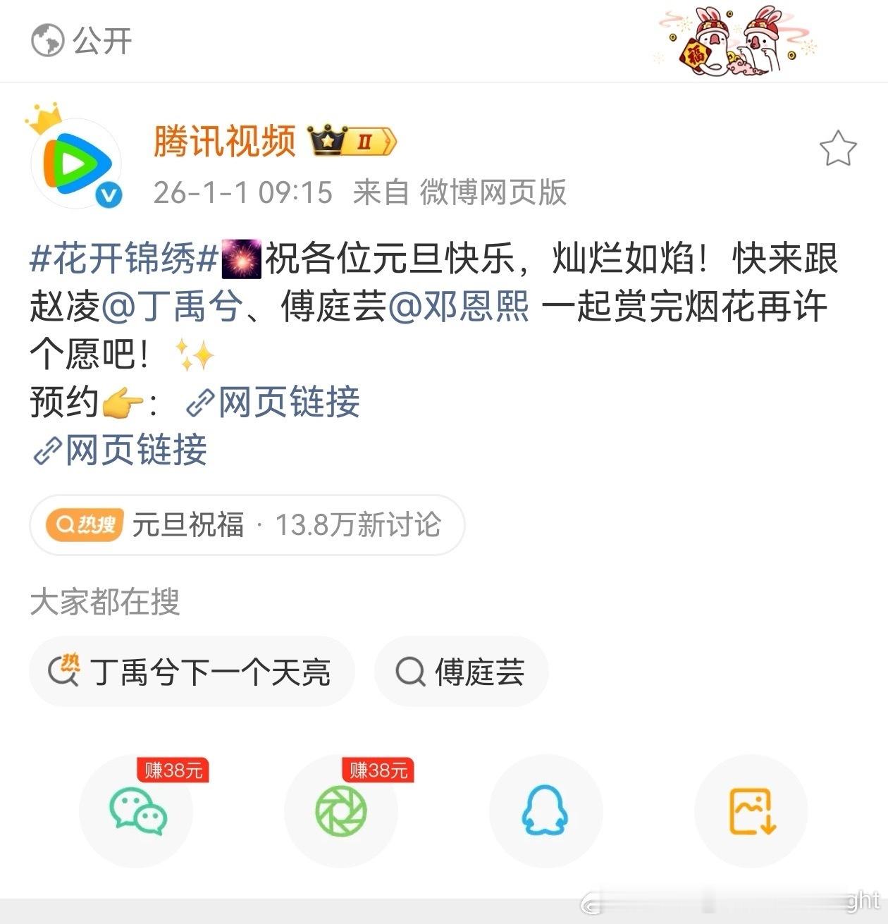 2026第一天,丁禹兮家在向腾讯视频维权。因为腾讯视频发的《百花杀》孟子义、《莫离》白鹿、《三线谜回》孟子义都有回车键,而丁禹兮《花开锦绣》和邓恩熙没有回车键,现在粉丝要求同样给予丁禹兮回车键的待遇