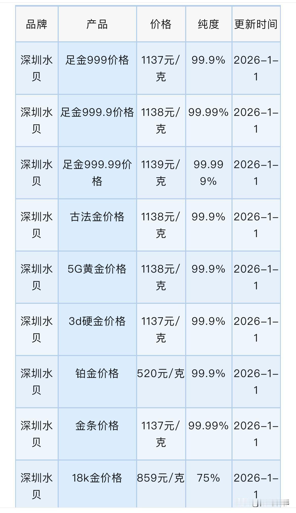 快看! 黄金批发价格可以查看了,来看看今天批发价有没有下跌呢? 足金999价格1137元/克, 古法金价格1138元/克, 5G黄金价格1138元/克, 铂金价格520元/克, 金条价格1137元/克。 同昨天相比较,今天深圳水贝珠宝黄金首饰批发价格基本保持不变。 水贝黄金指发市场,今日报价为每克 1137元,工费另计,不同的黄金款式工费有所差异(每克10元至35元不等)。 水贝黄金为什么那么便宜? 国内珠宝行业有这么一句话:“世界珠宝看中国,中国珠宝看深圳,深圳珠宝看罗湖,罗湖珠宝看水贝”水贝是全国75%的珠宝集散地。 零售与品牌店黄金为什么比水贝贵? 品牌店和零售店需要加盟费、品牌费、店铺成本装修、人工工资、明星代言费等等价格自然就上去了相对来说水贝就没有这些七七八八的费用。 所有信息,都只是提供参考价值! 购买黄金有风险,请大家保持理性购买黄金,不要盲目跟风! 黄金售卖价格 黄金价 黄金金店价格 黄金一克720 足金金饰价格 黄金价格680 广东黄金价格