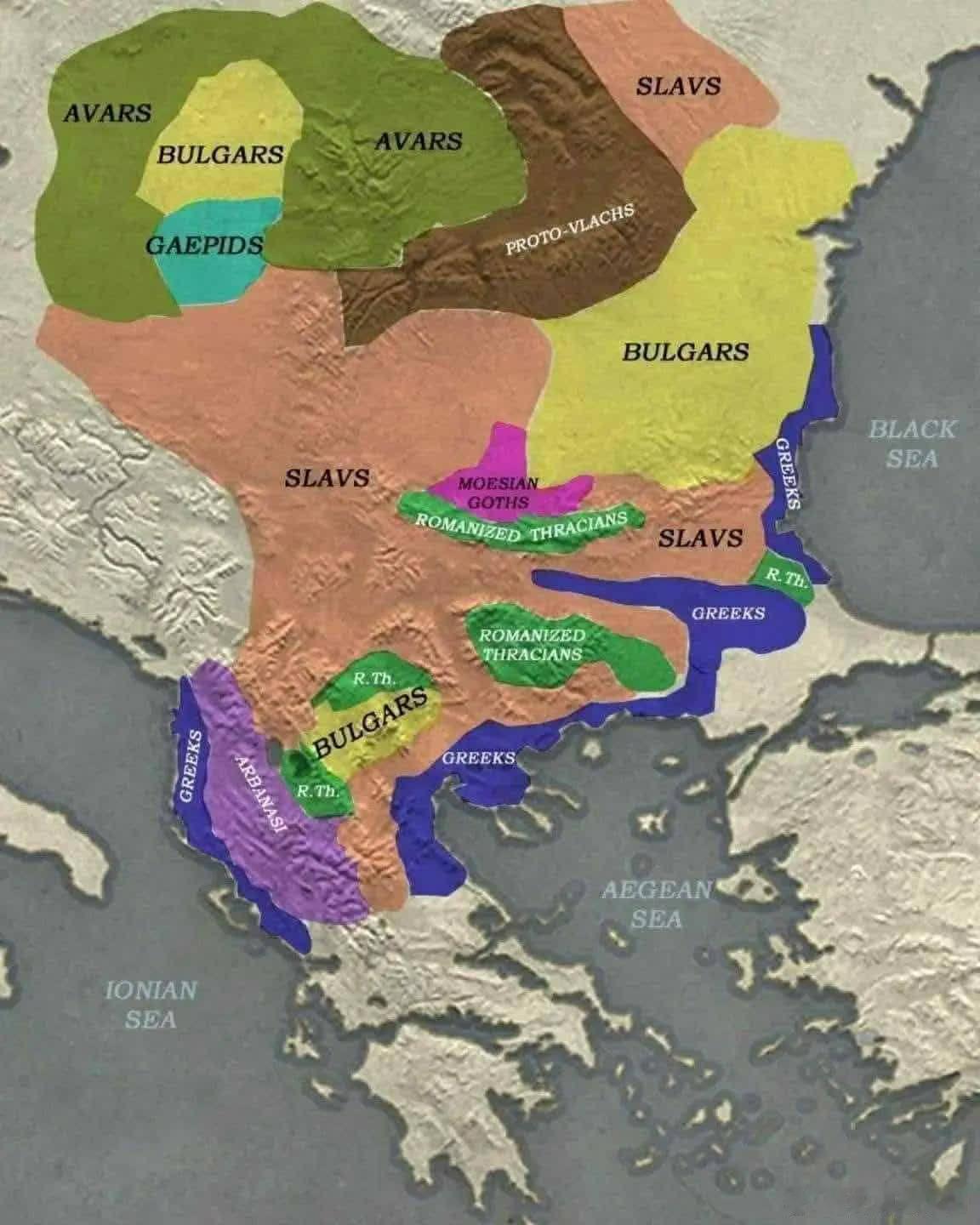 700A.D的巴尔干半岛民族分布。斯拉夫人、保加利亚人等民族开始逐渐进入北巴尔干地区,逐渐。击退拜占庭帝国的势力,开始在这个地区据地建国。FW