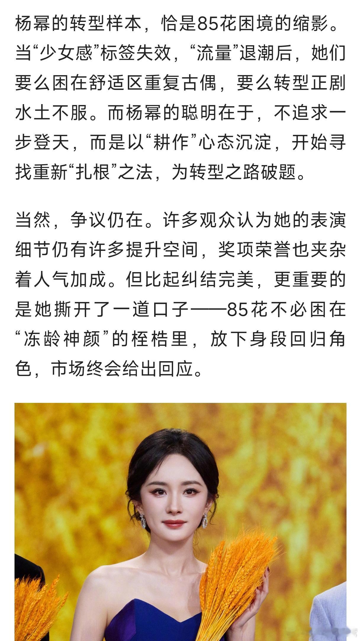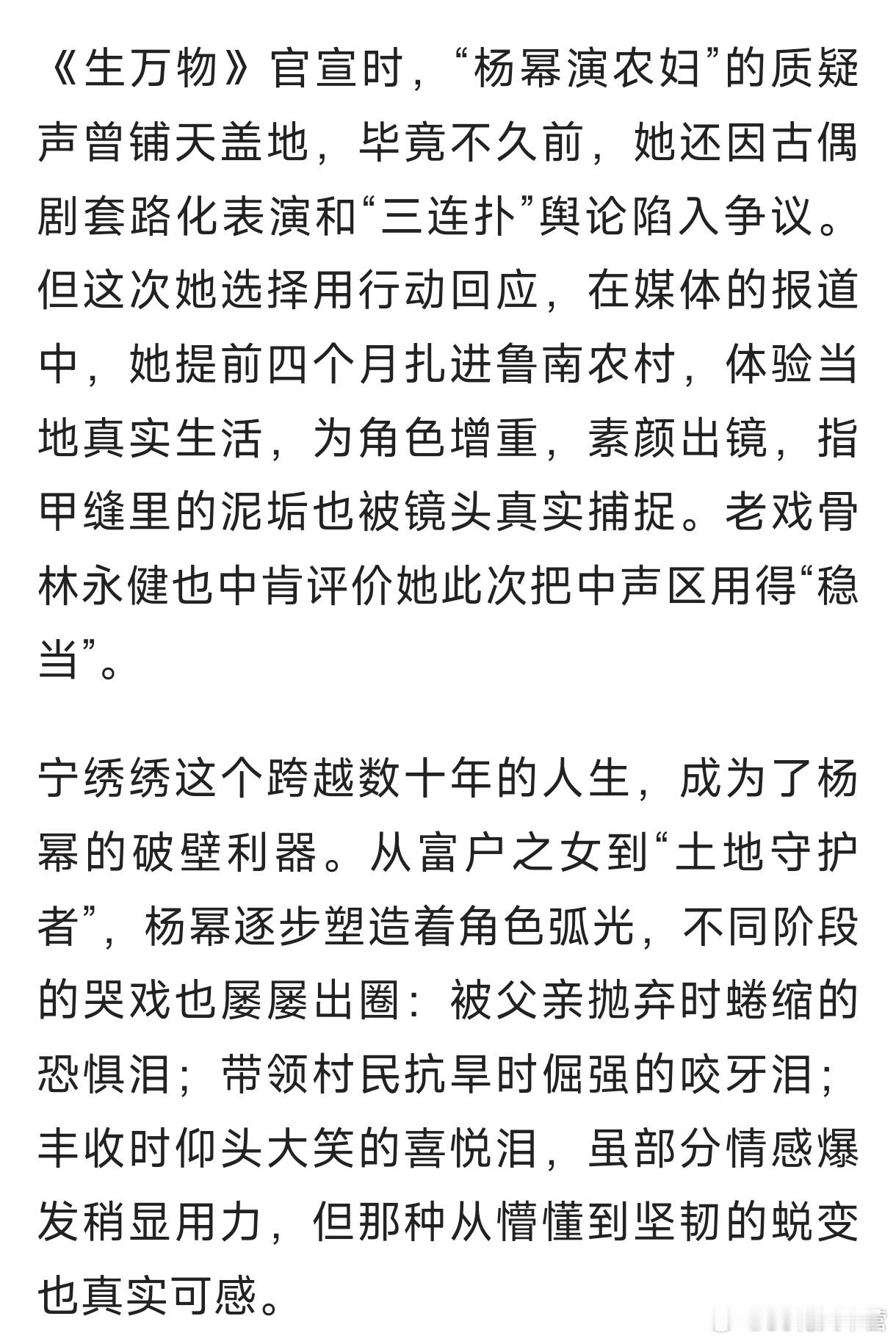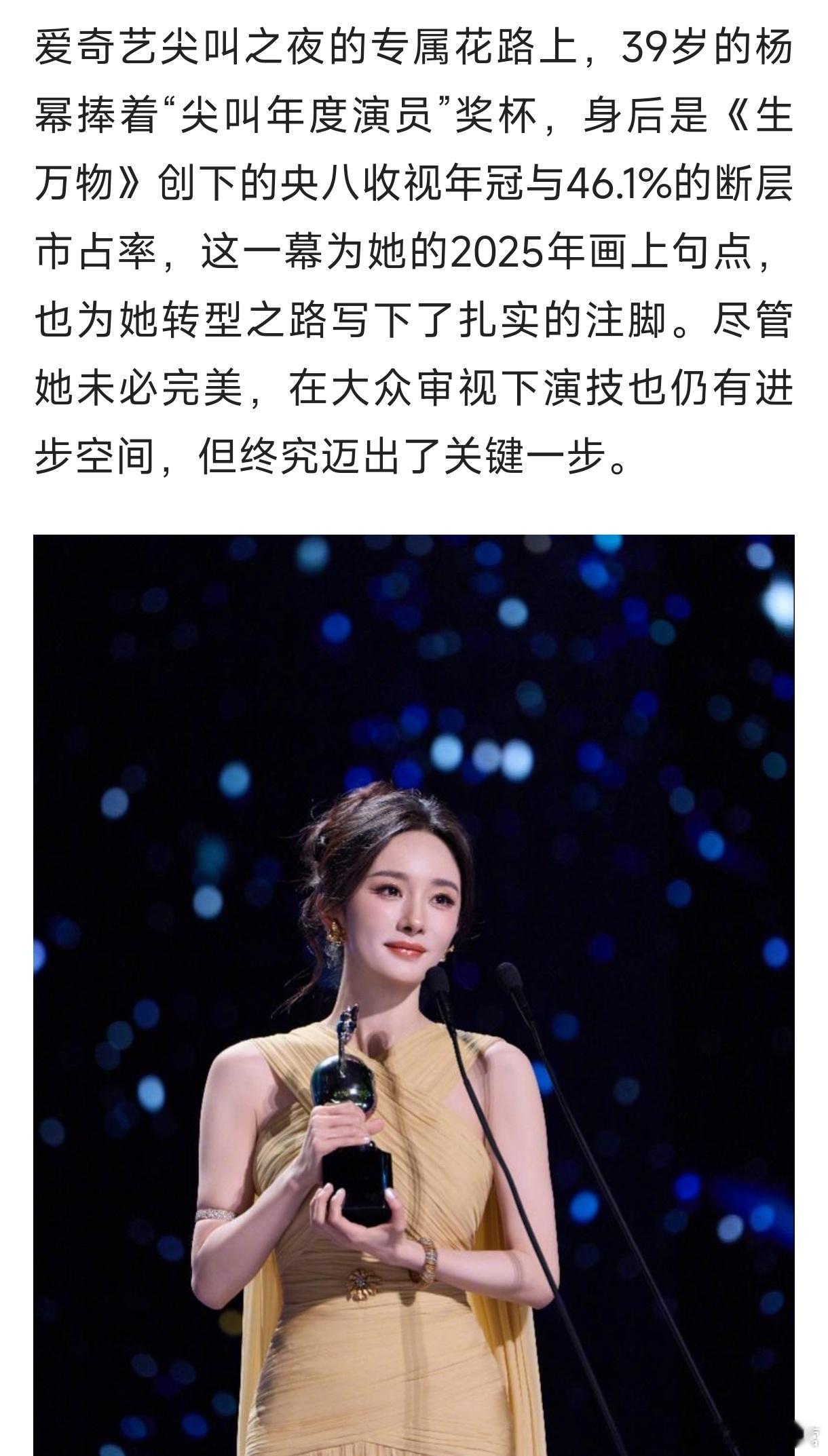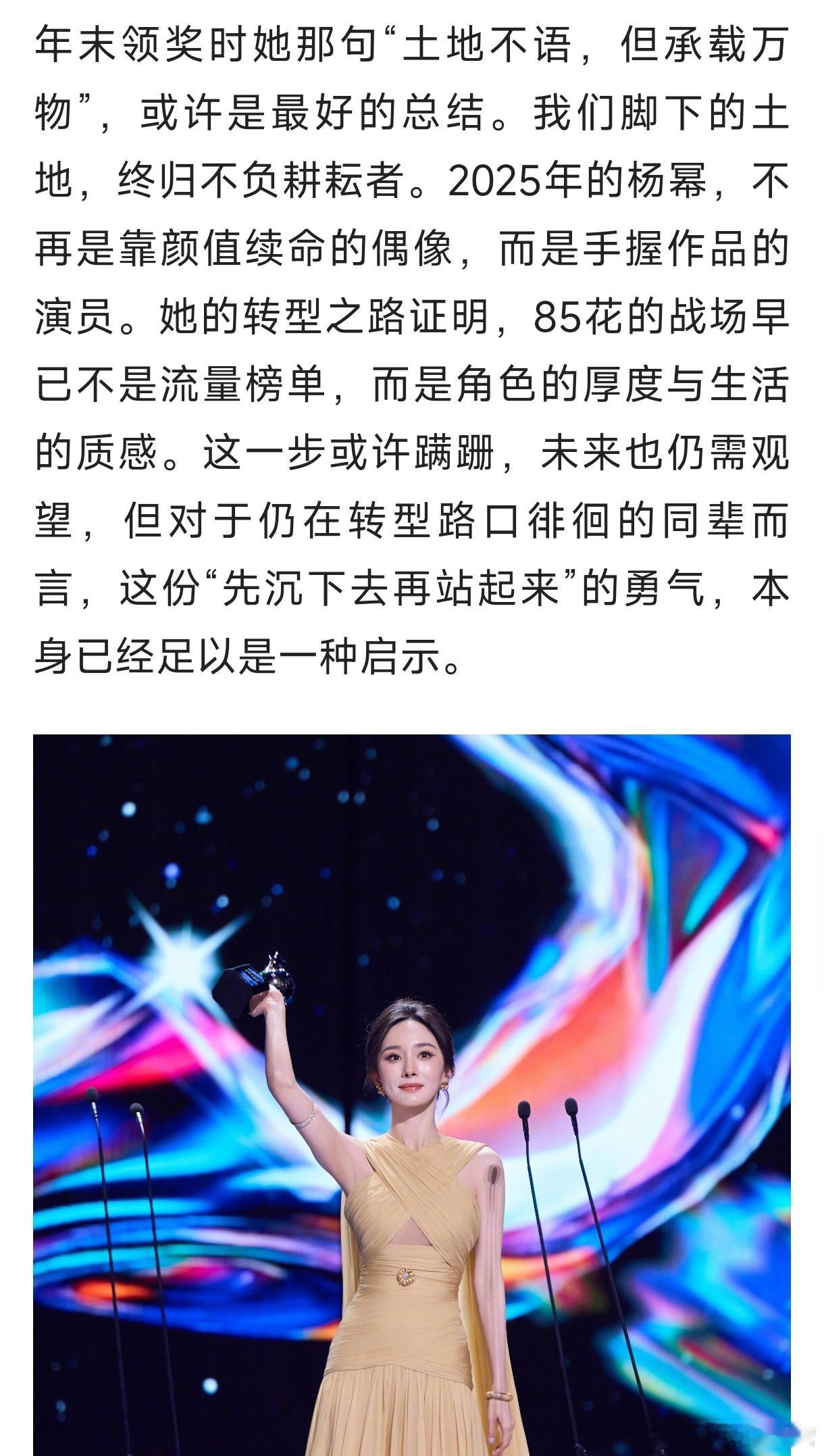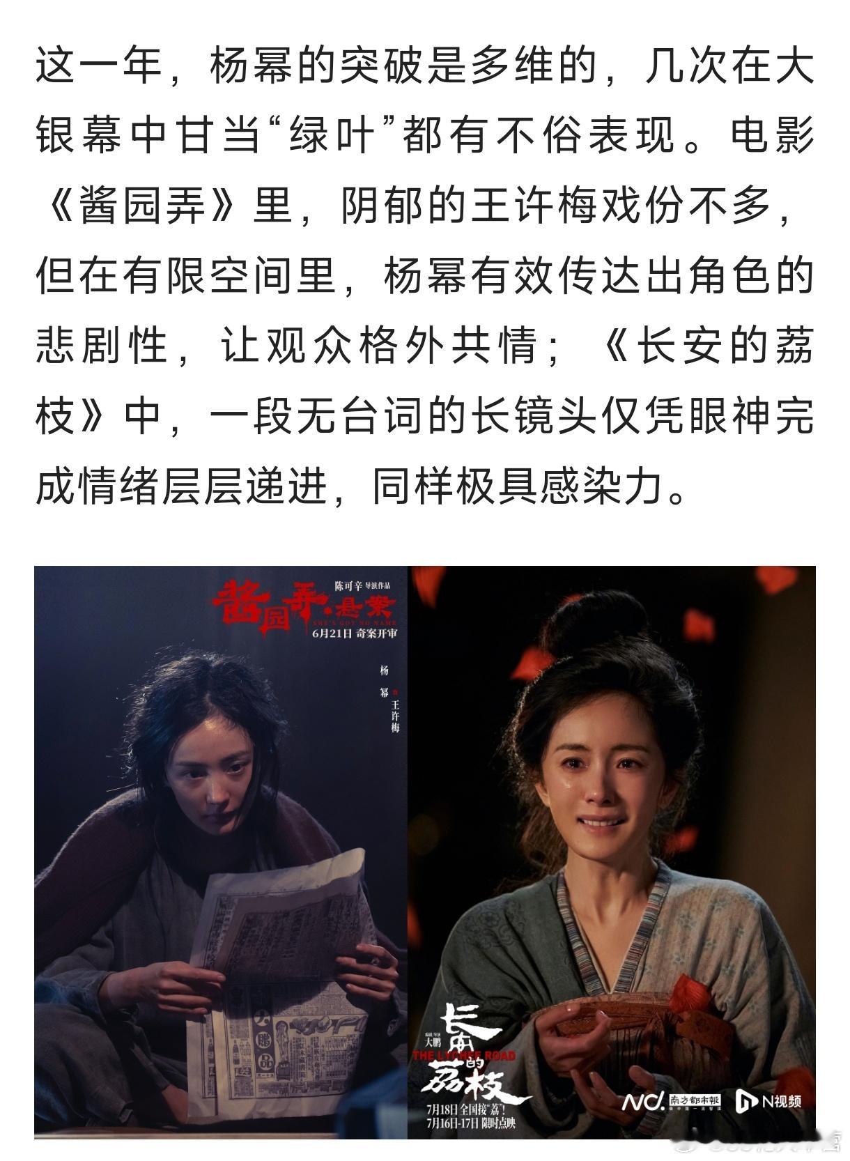 2025南都娱乐年度十大人物——杨幂的专题报道《杨幂扎根土地,以角色破局》《生万物》创下的央八收视年冠与46.1%的断层市占率《酱园弄》里,阴郁的王许梅戏份不多,但在有限空间里,杨幂有效传达出角色的悲剧性,让观众格外共情。《长安的荔枝》中,一段无台词的长镜头仅凭眼神完成情绪层层递进,同样极具感染力。2025年的多维杨幂!