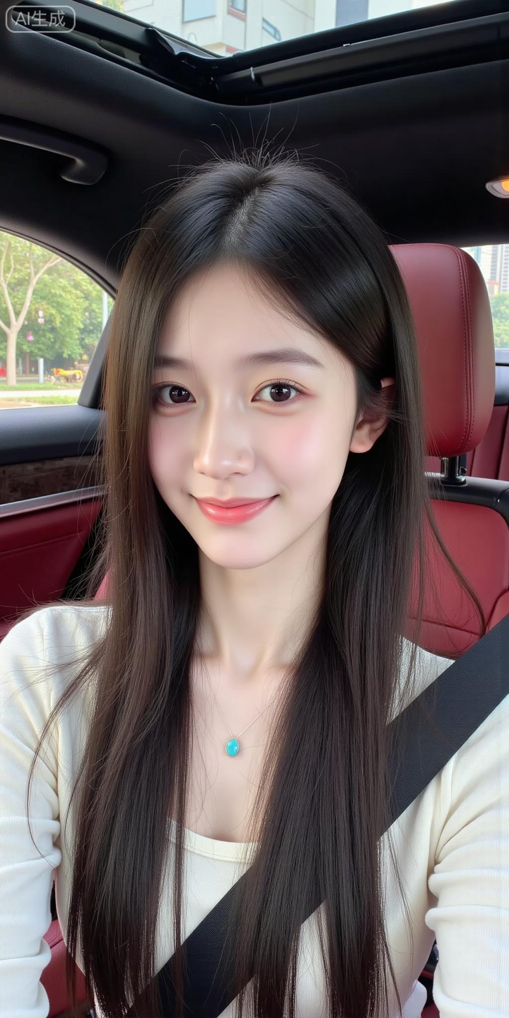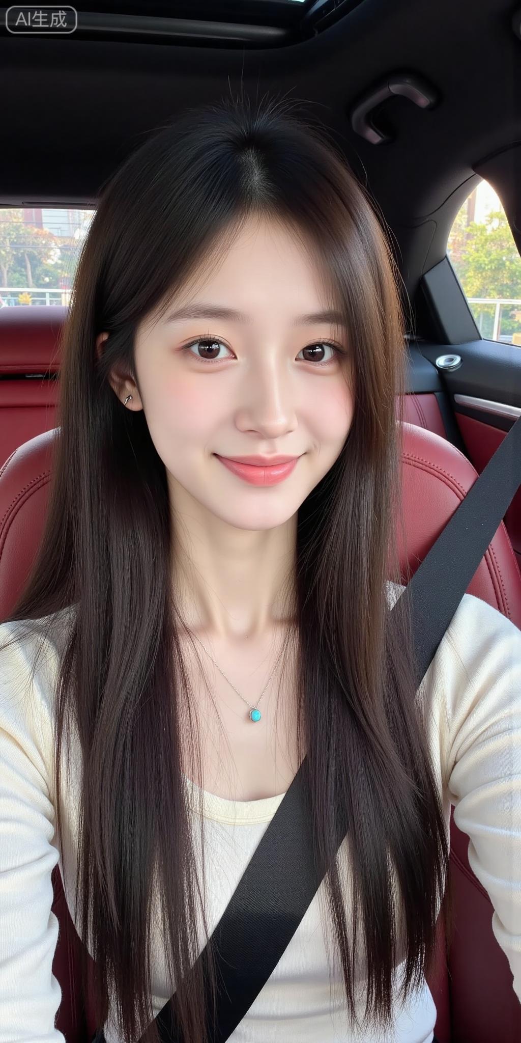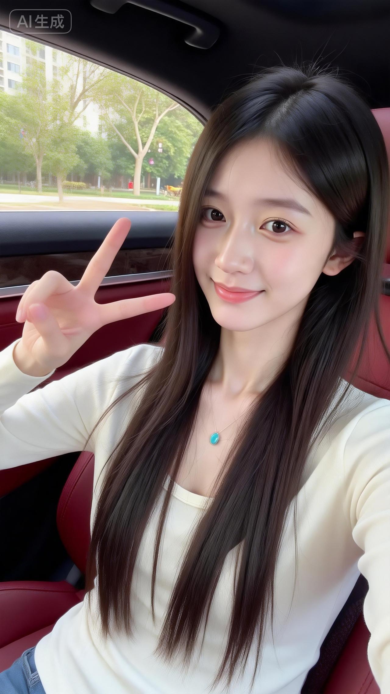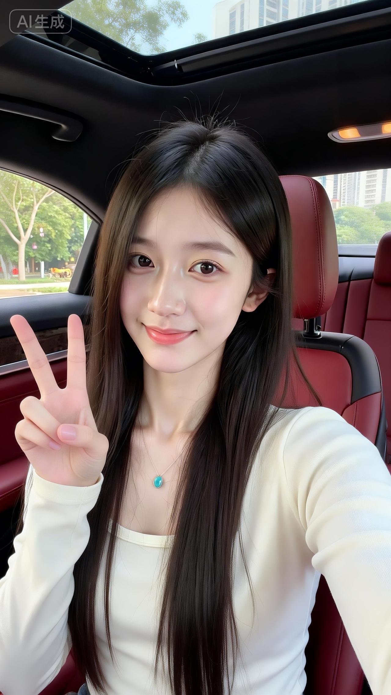 车内的奶白甜妹好清新 软乎乎的米白针织叠内搭,绿松石项链一衬,甜得像裹了层奶霜~ 对着镜头比耶,红棕座椅衬得氛围温柔又松弛,这就是日常甜妹的氛围感吧!粉白配色穿搭
