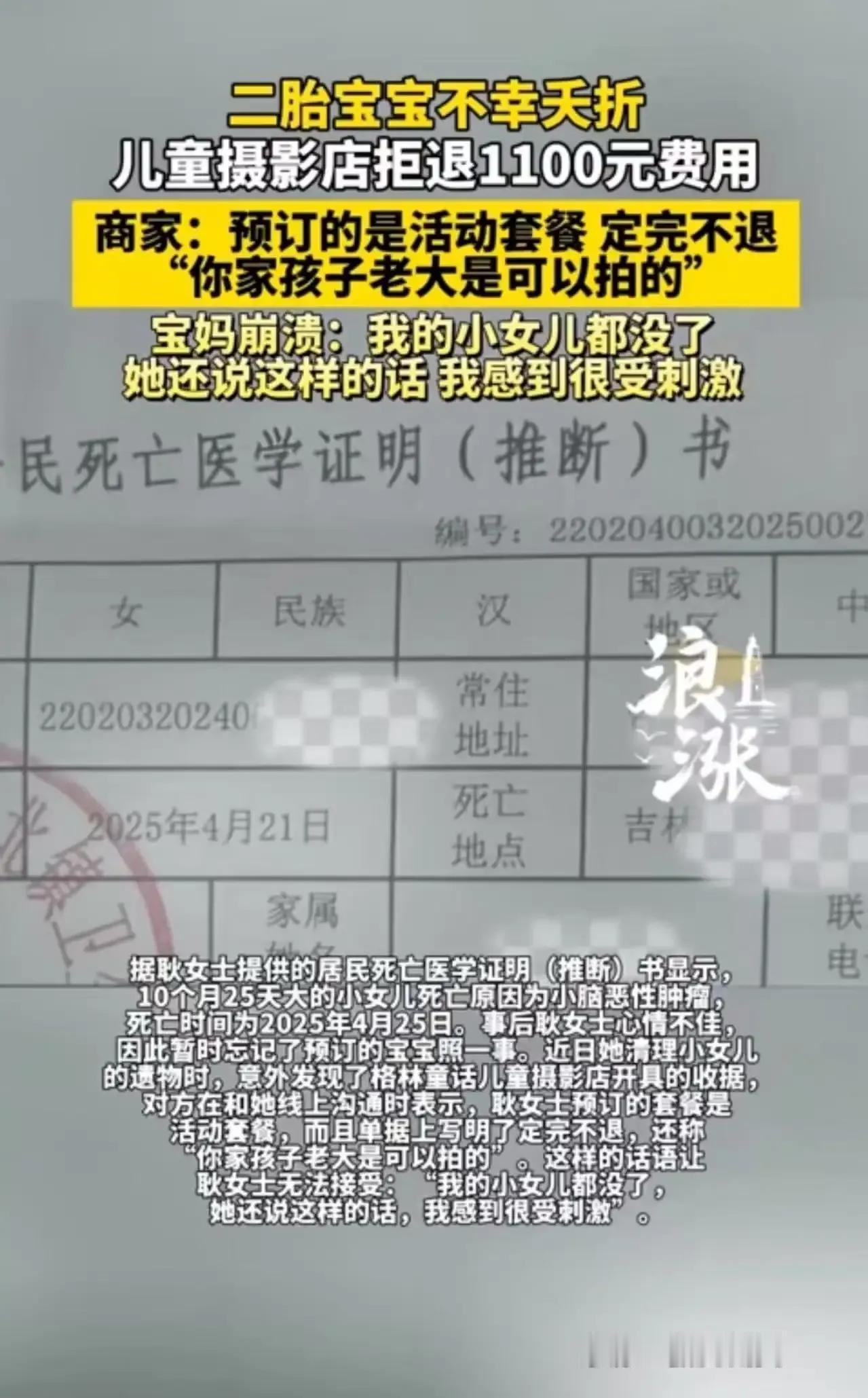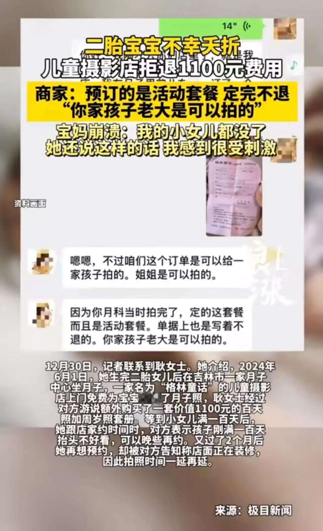 吉林icon,二胎宝宝不幸夭折,母亲想要退掉之前购买的摄影套餐,却遭到了商家的无情拒绝,1100元的费用愣是一分都不肯退。商家还冷漠地表示:“你二女儿没了,可以留着给你家老大拍!”宝妈崩溃哭诉:“我的小女儿都没了,她还说这样的话,我感到很受刺激!” 在这个世界上,最让人心碎的,莫过于失去自己最珍爱的孩子。尤其是在如此痛苦的时刻,却还要面对商家的冷漠与无情,让人心如刀绞。这不仅仅是一笔交易,更是一个家庭的悲剧与无助的写照。 这位宝妈的故事,或许只是千万家庭中的一个缩影。她刚刚经历了生命中最沉重的打击——二胎宝宝的不幸夭折,本应得到更多的理解与安慰,却迎来的是商家的无情拒绝。1100元的摄影套餐,或许在他们眼中只是几张照片的费用,但在宝妈的心中,却是那一份对已逝女儿的纪念与爱。那份希望、那份期待,瞬间变成了无尽的失落。 更令人愤怒的是,商家竟然还冷漠地说:“你二女儿没了,可以留着给你家老大拍!”这句话,像一把刀狠狠戳在宝妈的心上。无论是出于何种理由,面对一个刚刚失去孩子的母亲,竟然还能如此冷漠、如此无情,难道他们真的不知道,失去孩子的痛苦有多深?难道他们不懂,一个母亲的心会因为一句话而碎成渣吗? 这件事引发了我深深的思考。我们在追求商业利益的同时,是否忘记了人性与善良?在社会的某个角落,是否还有那么一些商家,缺乏基本的同理心?更重要的是,我们每个人是否也在无意中成为了那种“只看利益不顾人情”的人? 面对这样的悲剧,作为公众,我们不能只是一味谴责商家,更要反思:我们是否在某些时刻也变得冷漠?我们是否在日常生活中,忽视了身边人的痛苦与需要?善良和同情心,难道就真的那么难以维护吗? 这位宝妈的哭诉,唤醒了我们每一个人的良知。我们要相信,这个世界上仍有温暖和善良存在。我们也要呼吁更多的商家,能够用人性去经营,用心去服务。因为,真正的商业,不仅仅是利益的交换,更是人与人之间的理解与关怀。 让我们用行动告诉这个社会:无论何时何地,善良永远不会过时。我们期待,那些在黑暗中挣扎的家庭,能感受到一缕温暖的光。我们相信,只要心怀善意,悲伤终会被爱与希望取代。 因为,生命的价值,不在于金钱的多少,而在于我们彼此的关怀和理解。让我们共同努力,让这个世界变得更加温暖和有爱。夭折孩子 二胎新生儿照