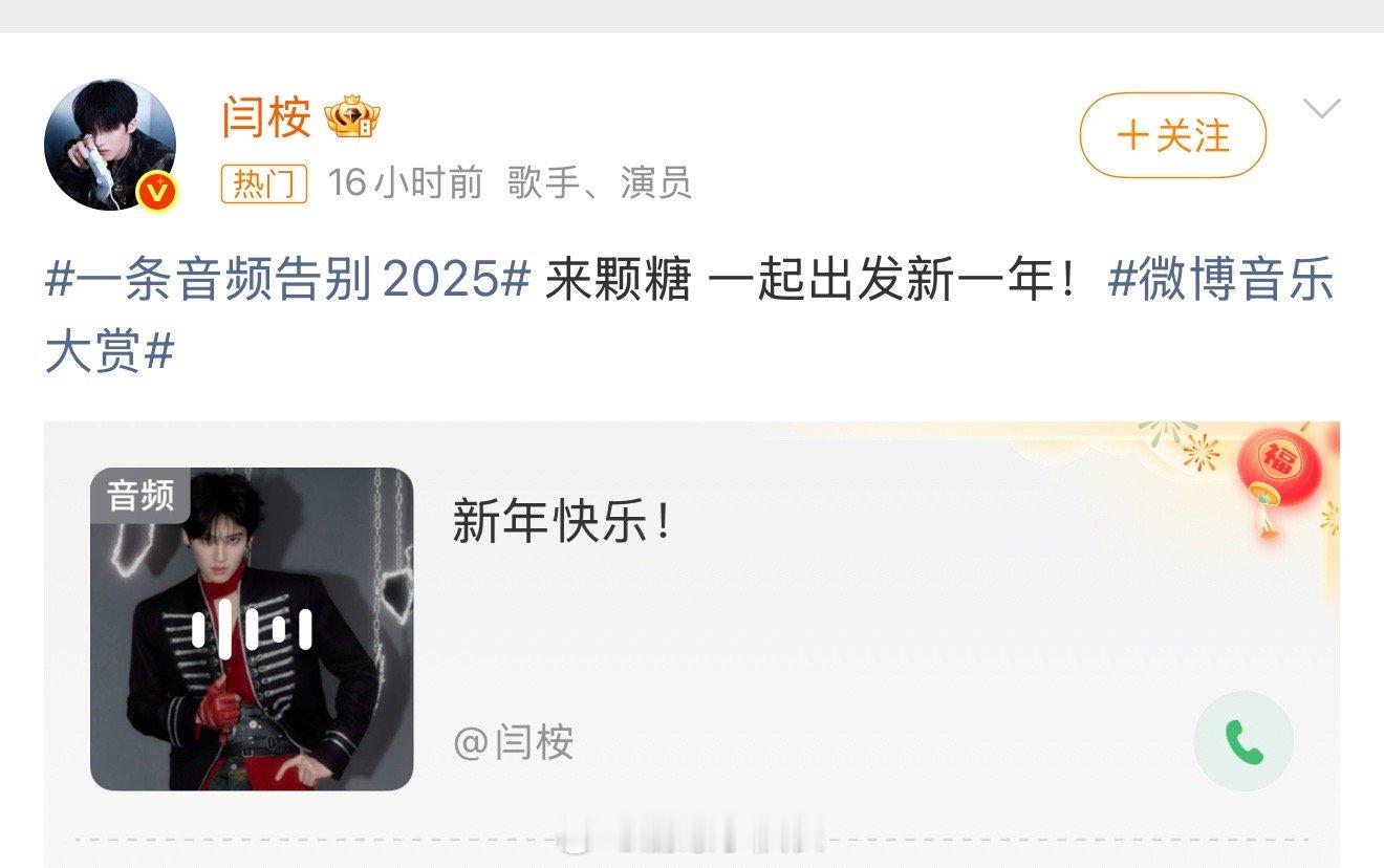 闫桉来颗糖一起出发新一年 和闫桉一起,从一颗糖开始新的一年。最重要的还是身体健康,在此基础上,愿你事事顺心,事业有成,永远保持那份真诚和热情。