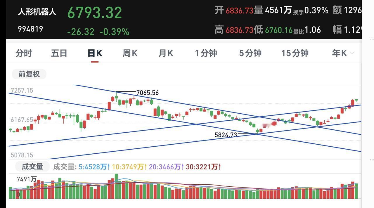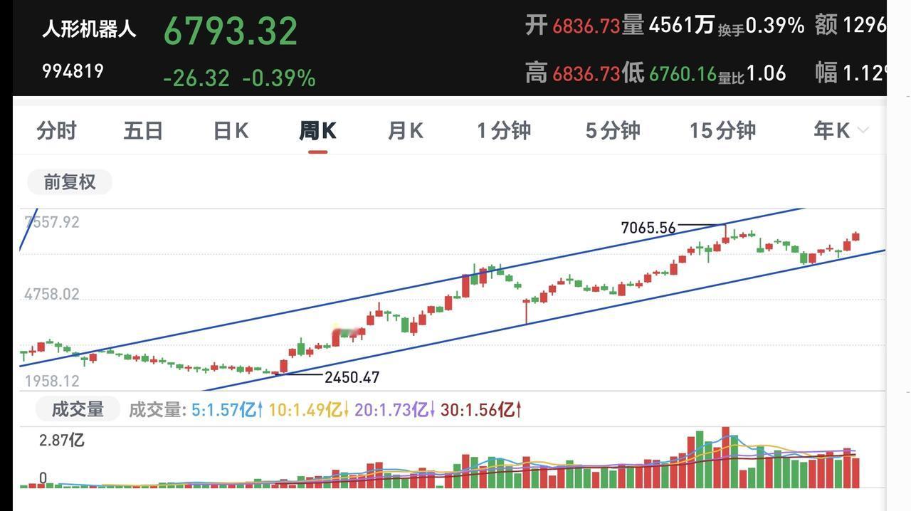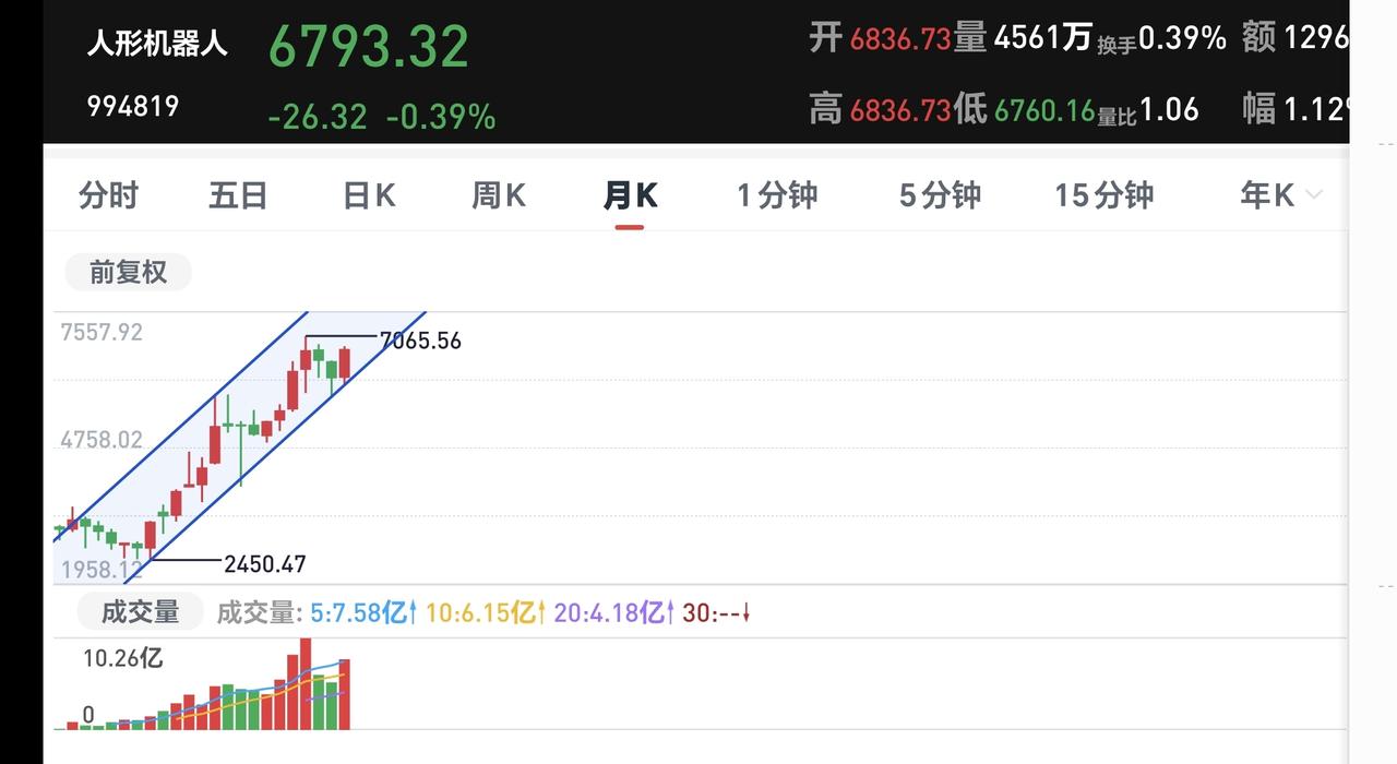 基金:这个板块加速上涨后需要注意 机器人是许多人都感兴趣的板块,这个板块2025年上涨了69.89%,这个上涨幅度中规中矩,但也让我们对后市的走势充满了想象。 我们来看一下下面的截图2,这是机器人板块日K线图,从图中可以看出,我画了两条倾斜向上的斜线,这是机器人板块日线级别上涨通道,星期一的时候上涨突破了这个上涨通道的上轨,也就是说,日线级别有可能走加速走势,近期观察会不会跌回上涨通道内,还是真的来一个加速上涨走势,如果加速上涨偏离这个上涨通道过远,要注意短期调整的需求。 我们来看一下下面的截图3,这是机器人板块周k线图,从图中可以看出,我画了两条倾斜向上的斜线,这是机器人板块周线级别上涨通道,现在的位置处于这个上涨通道中,也就是说,机器人板块周线级别处于上涨趋势中。而且,周线级别上涨通道的斜率不是很高,这样的斜率有利于持续上涨。 我们来看一下下面的截图4,这是机器人板块月K线图,从图中可以看出,我也画了两条倾斜向上的斜线,这是机器人板块月线级别上涨通道,需要注意的是,这个上涨通道的斜率很高,这样的斜率不支持长时间以这样的速度上涨,所以,震荡调整是大概率事件。 看到这里,许多人肯定是一头雾水,各个周期的表述不一样,不要不理解,因为,各个周期表现出来的情况不一样。 日线级别有想走加速走势的模样,周线级别表现正常,月线级别速度过快,所以,从小级别服从大级别看,这个板块有可能会月线级别降速,但并不是现在就开始降速,而是在这个日线级别加速上涨的末端,所以,我们需要注意这个有可能加速上涨的末端,到时候需要考虑要不要止盈出来观望。 我每天都会分享我的观点,我的观点只代表我个人的看法,不能作为你操作的依据,据此操作后果自负。