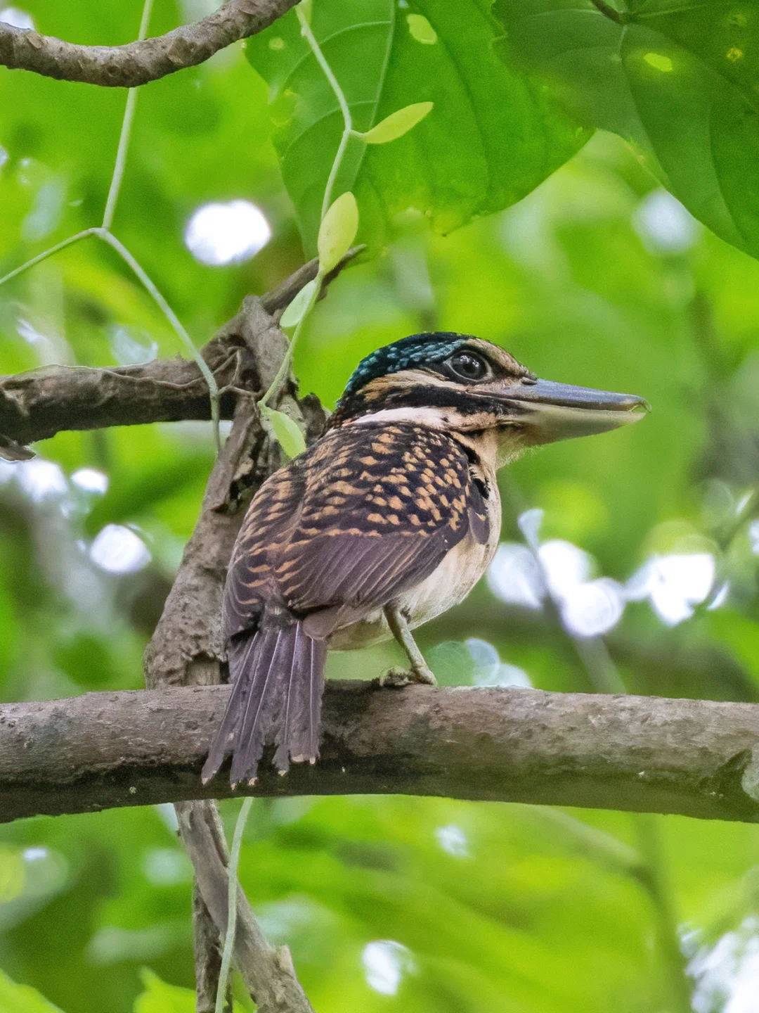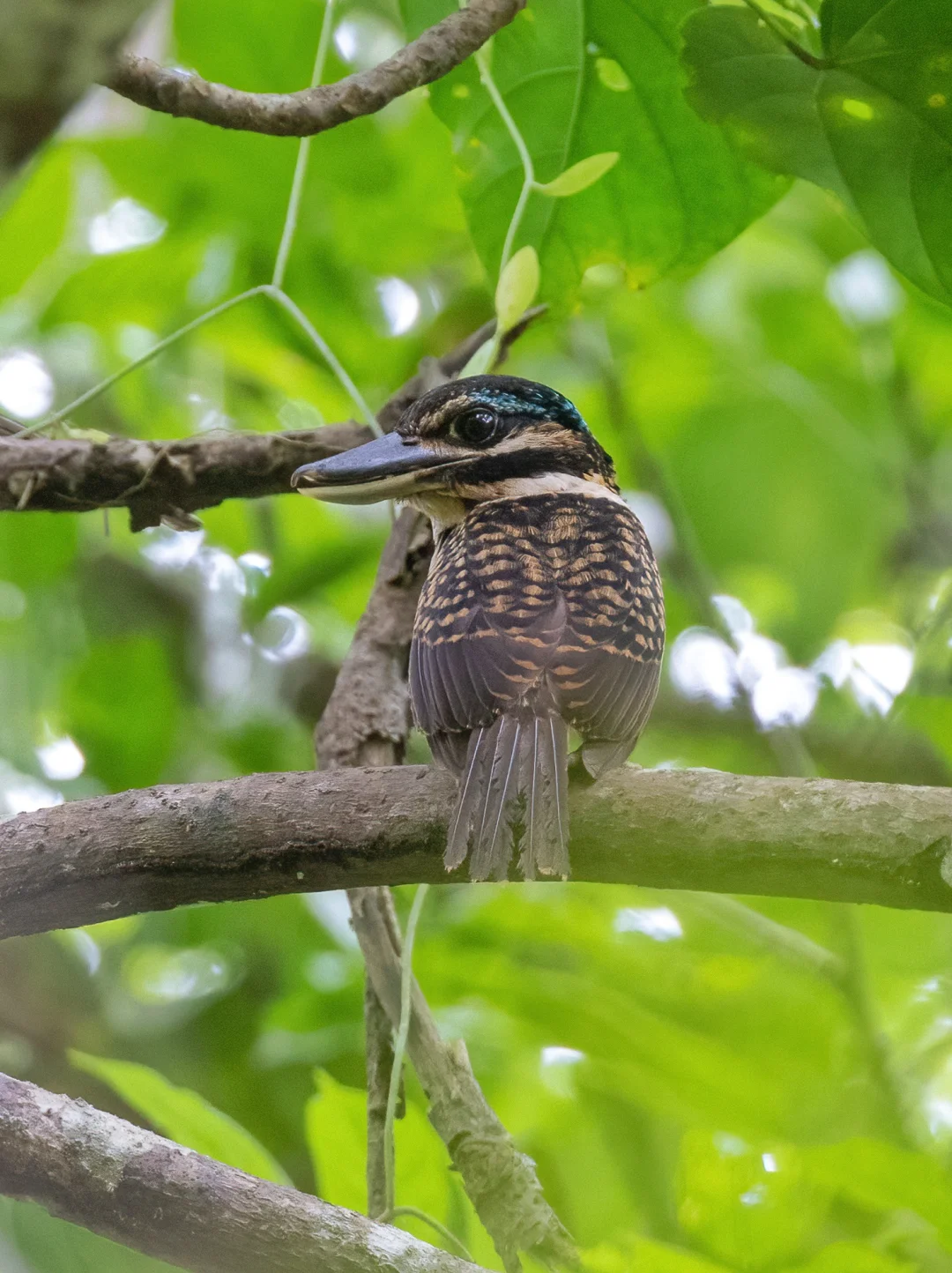 原创拍摄 钩嘴翠鸟,佛法僧目翠鸟科钩嘴翠鸟属。是这个属的唯一鸟种。新几内亚岛特有的一种大型的翠鸟。 钩嘴翠鸟的头部很大,眼睛也很大很圆,看上去很二次元,它们的嘴非常的厚实,嘴顶端能够见到一个钩子,所以叫钩嘴翠鸟,真的是名副其实的自带鱼钩的大头翠鸟。 找到这只钩嘴翠鸟可是费了好大劲儿,当时在卫古岛观鸟,吵闹的声音倒是听到很久,但是来回飞都见不到鸟影,最后不知道飞到什么地方。向导钻入了一个超级密的树林里面,等了好久,最后从林子里走出来让我们进去看看,才发现了她。