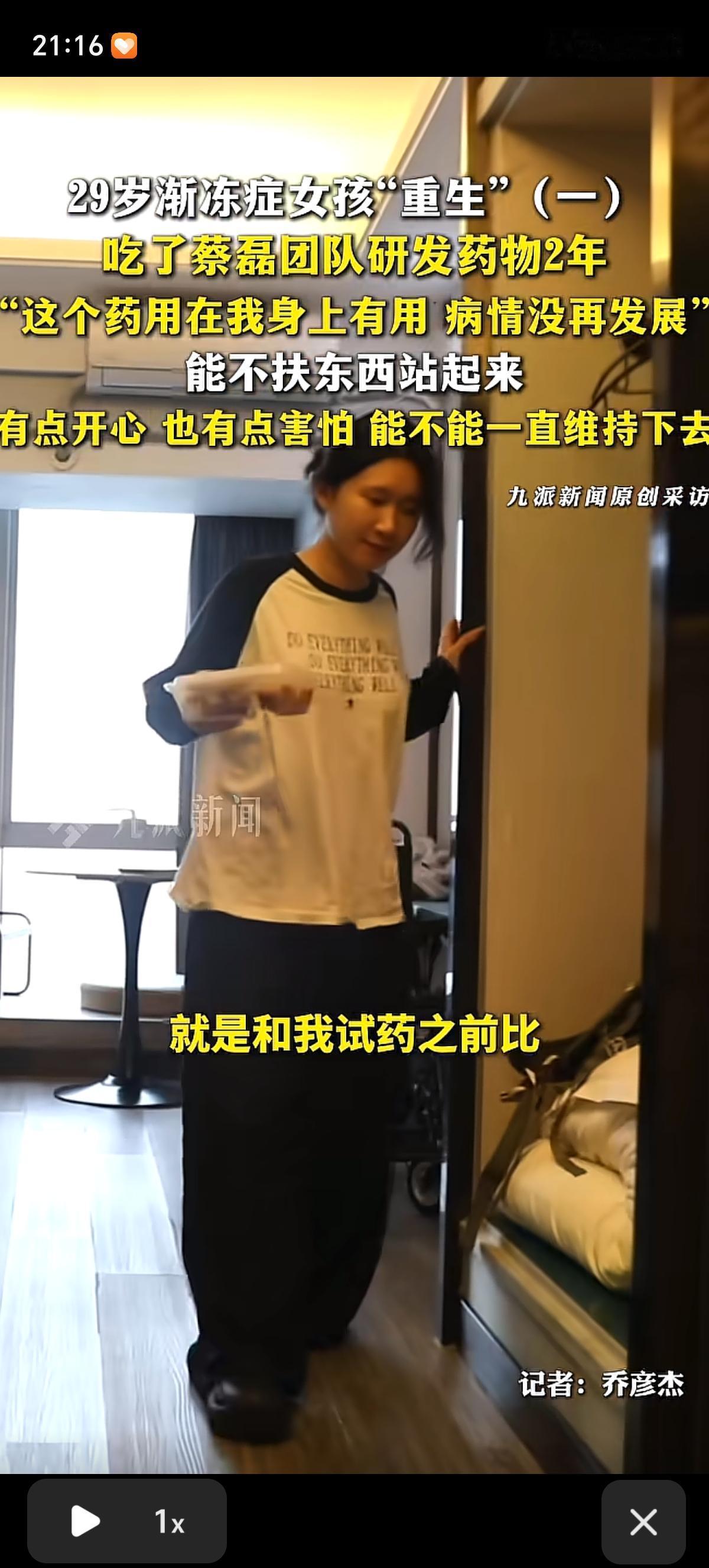 蔡磊团队研发的药物没能让蔡磊本人开口说话,却让一个29岁渐冻症女孩重生了。女孩吃了两年蔡磊的药后病情稳定了,现在还能自己扶着东西慢慢行走了。 现在女孩既开心自己能走路了,又有点患得患失,担心又回到以前。目前看来药对女孩这种情况是有效的,挺对症。 蔡磊团队研发的药是有用的,就是蔡磊本人的症状看上去更严重,病情接近终末期了,跟女孩的情况又不太一样。 蔡磊的药想治好自己还要再等等,有希望总是好的,就像蔡磊本人说的,他的意志永远坚定,精神是自由的。