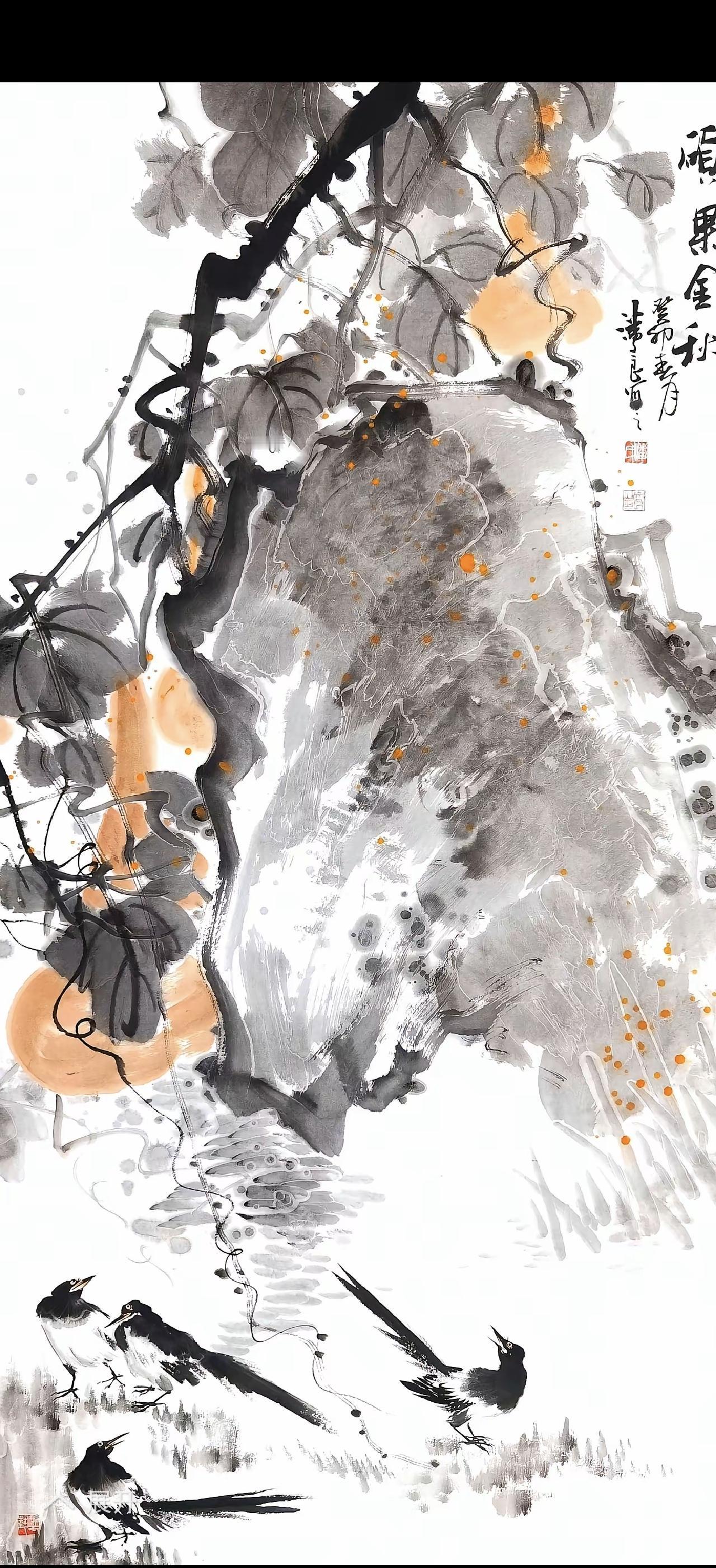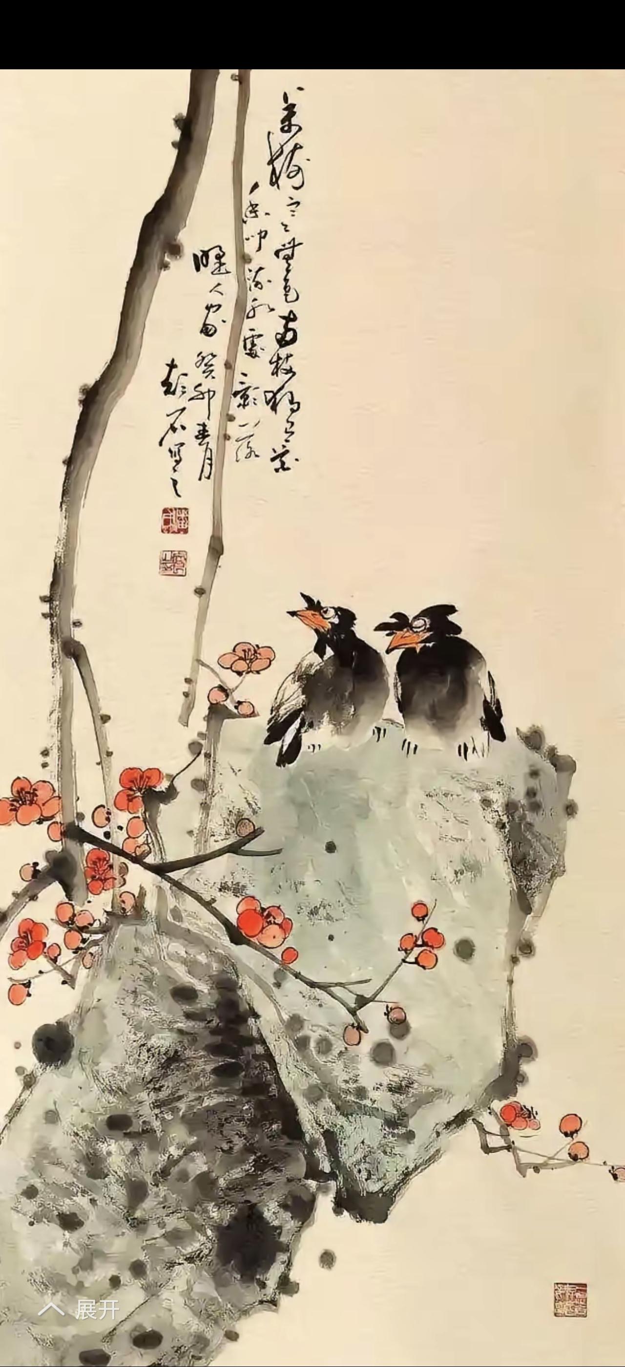 画中的鸟和梅花和正在盛开的梅花和鸟