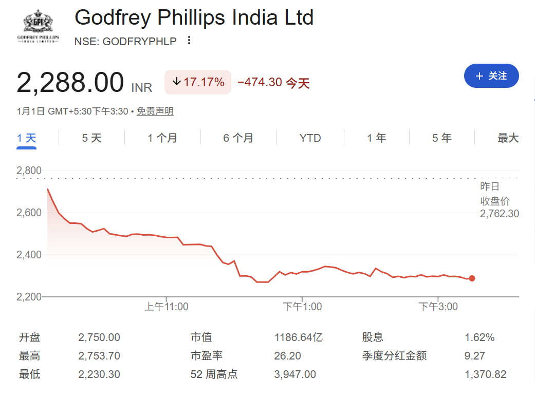 行业龙头、生产“GoldFlake”等品牌的ITC股价下跌9.7%,在印度负责“万宝路”分销的GodfreyPhillipsIndia暴跌17%。
