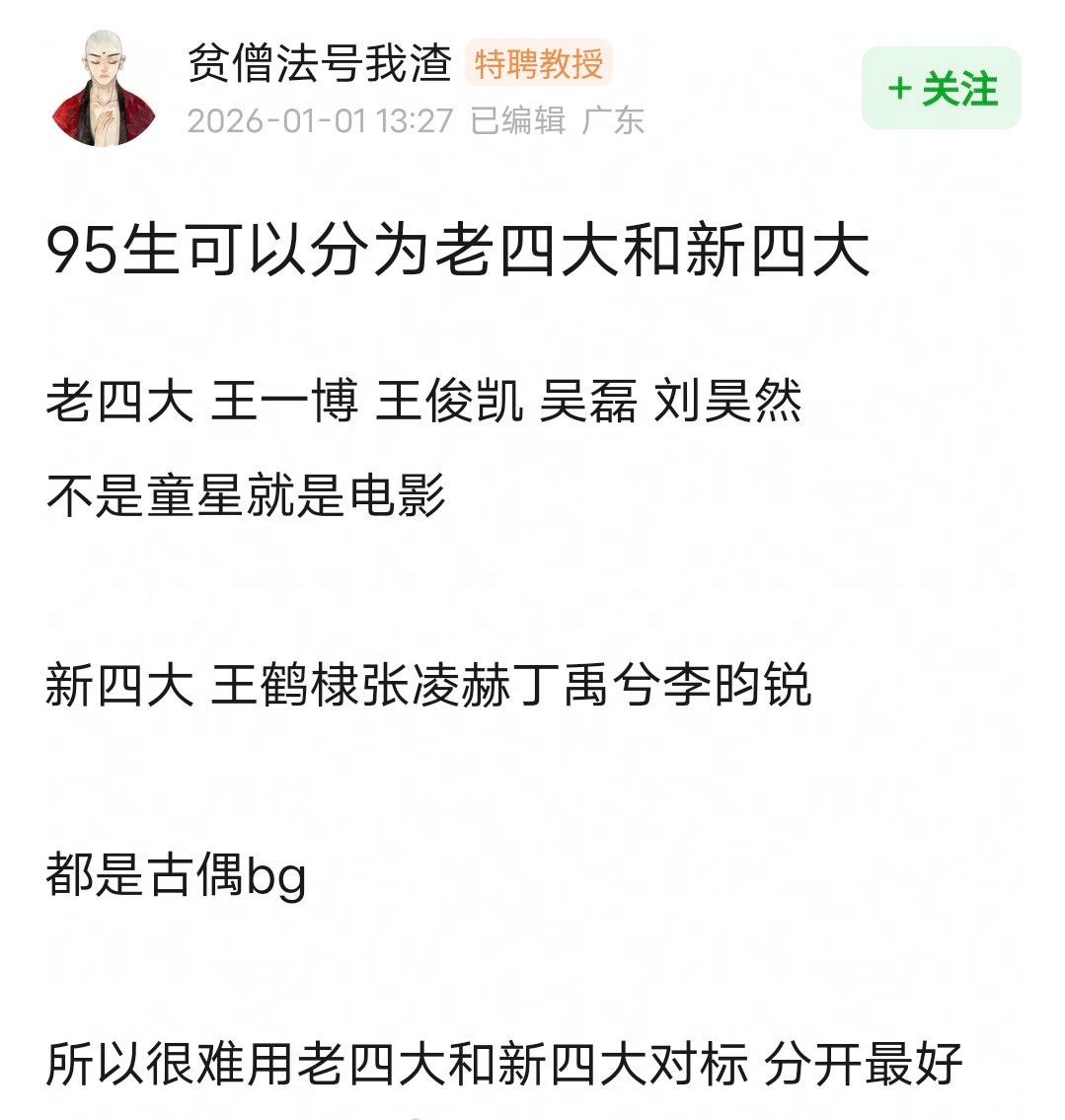 网友评选的95生大顶流95老四大:王一博、王俊凯、吴磊、刘昊然95新四大:王鹤棣、张凌赫、丁禹兮、李昀锐