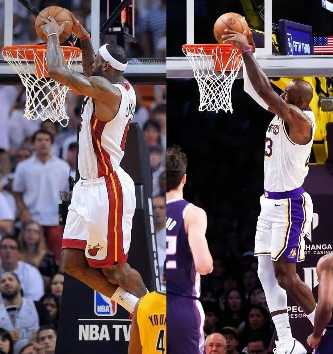 美媒晒图,詹姆斯41岁生日当天,同一个扣篮动作,弹跳高度差了整整30公分。热火时期,他起跳平筐,头能撞到篮筐水平线。如今,他起跳高度连篮板上沿都没摸到。身体机能的衰退是不可逆的物理定律。