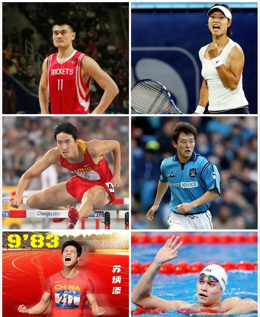 这6人是中国体坛最具世界影响力的运动员,谁赞成、谁反对?1.姚明,篮球天花板!2.刘翔,110米栏天花板!3.李娜,网球天花板!4.孙杨,游泳天花板!5.苏炳添,100米天花板!6.孙继海,足球留洋天花板!萝卜青菜各有所爱,大家认可这五人的地位和排名吗?
