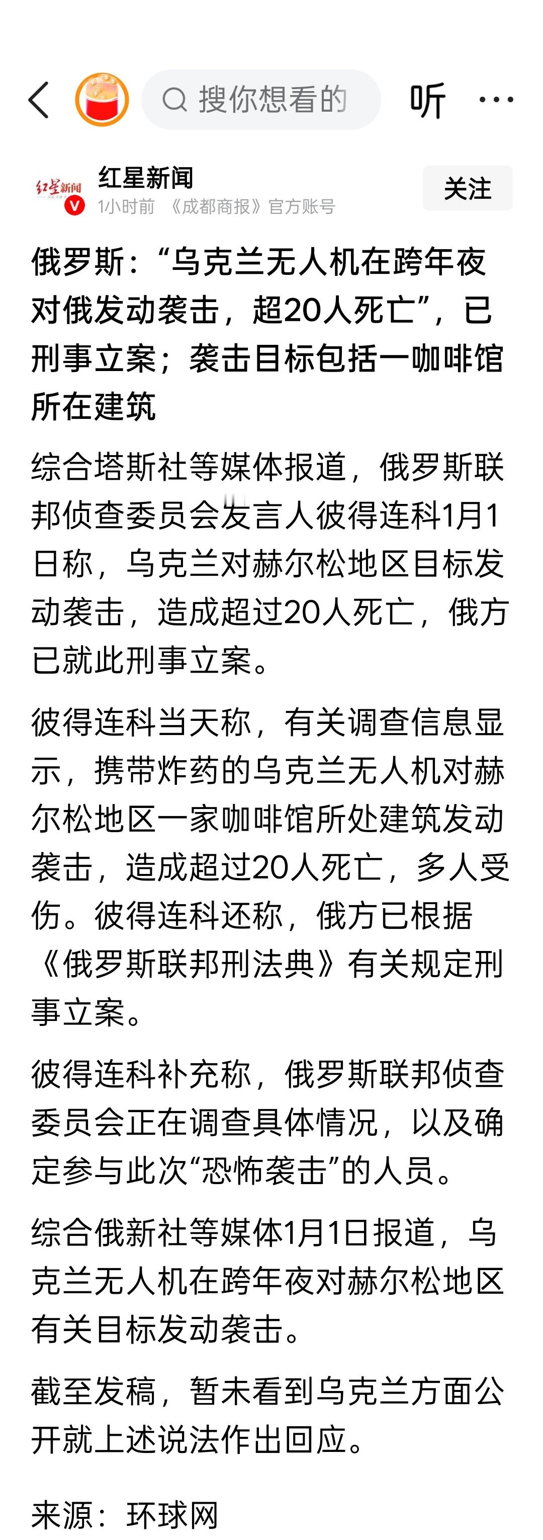 俄罗斯:“乌克兰无人机在跨年夜对俄发动袭击,超20人死亡”,已刑事立案;袭击目标包括一咖啡馆所在建筑