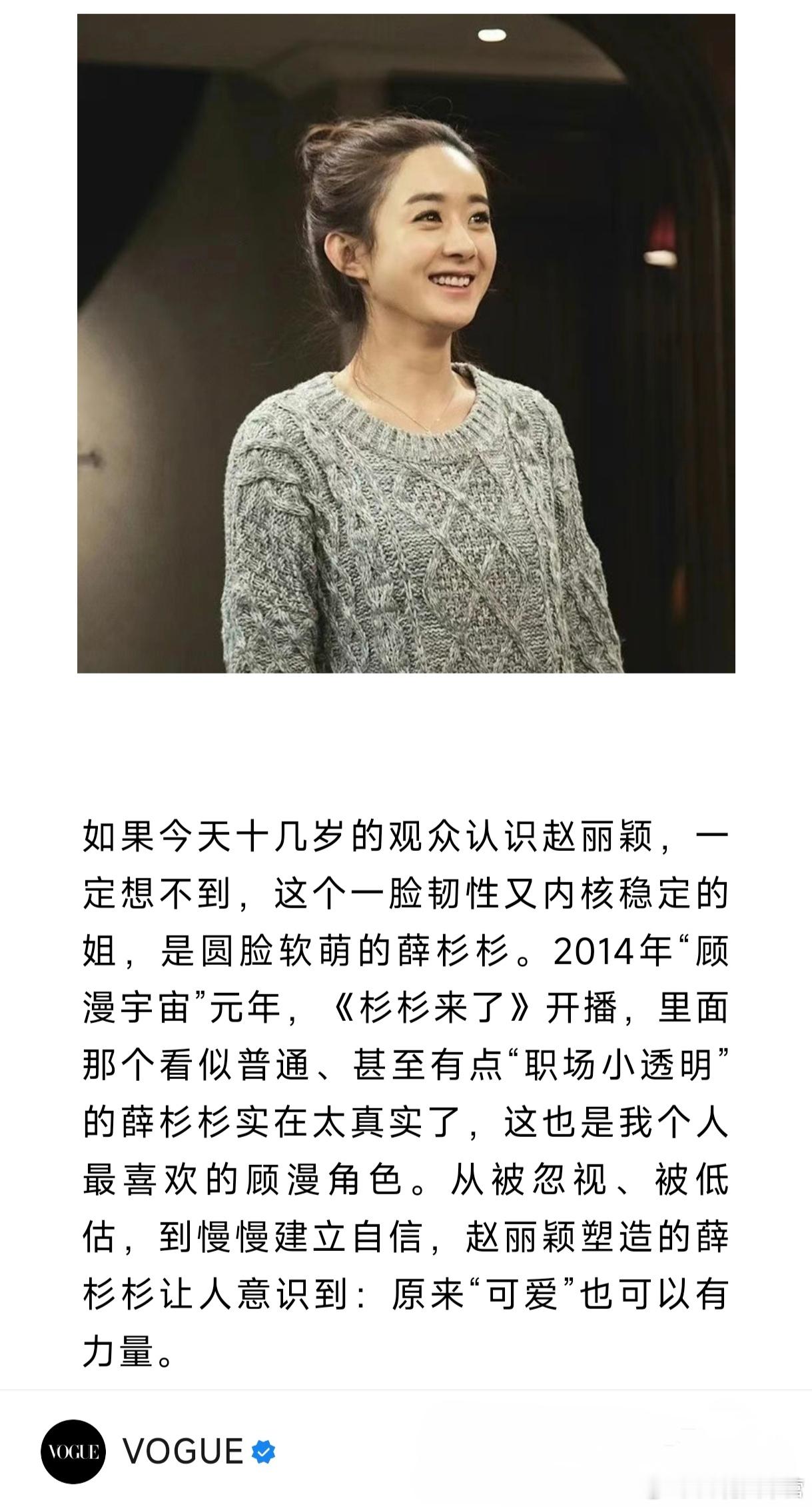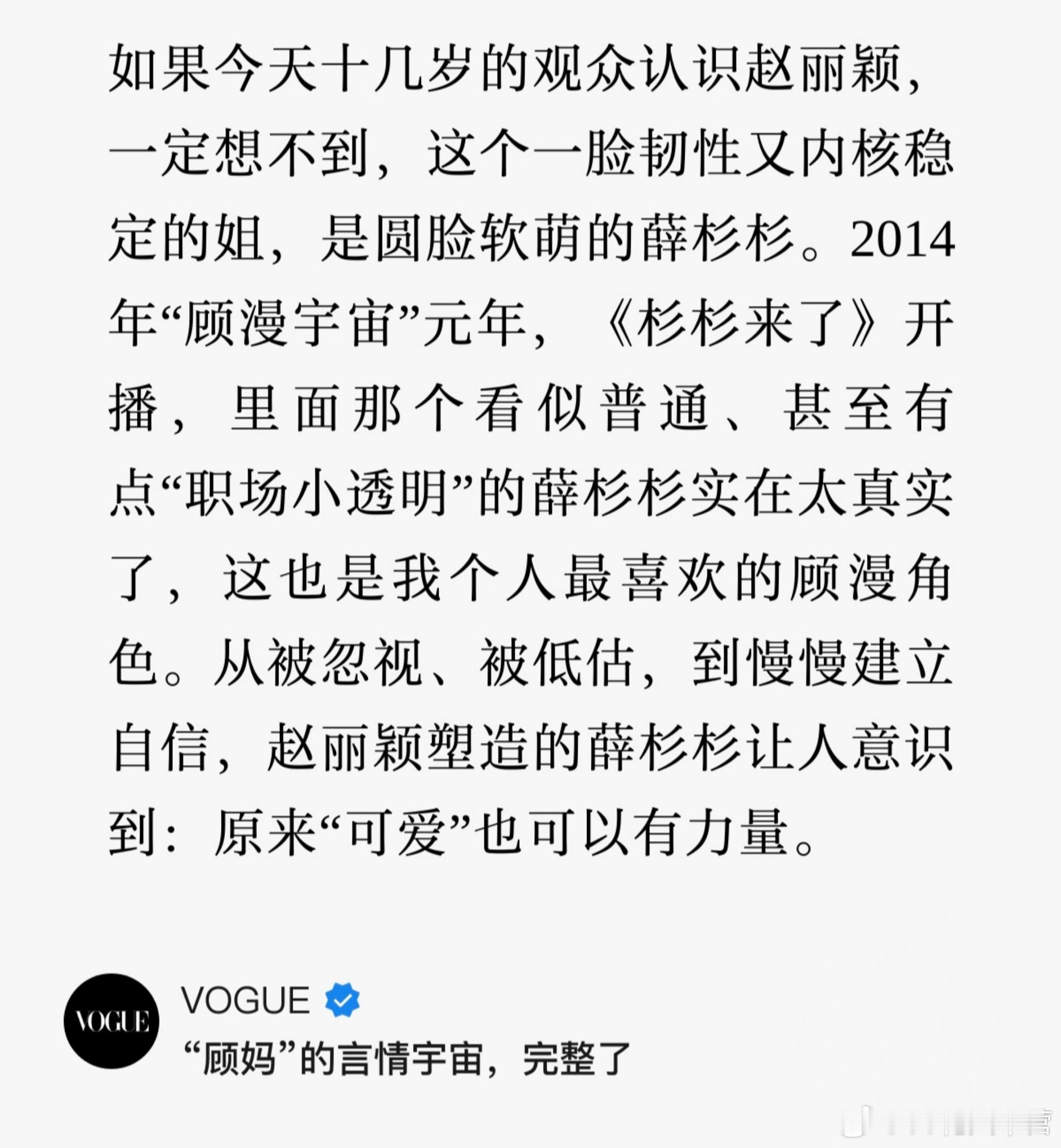 VOGUE盘点顾漫的女性角色——《杉杉来了》薛杉杉如果今天十几岁的观众认识赵丽颖,一定想不到,这个一脸韧性又内核稳定的姐,是圆脸软萌的薛杉杉。2014年“顾漫宇宙”元年,《杉杉来了》开播,里面那个看似普通、甚至有点“职场小透明”的薛杉杉实在太真实了,这也是我个人最喜欢的顾漫角色。从被忽视、被低估,到慢慢建立自信,赵丽颖塑造的薛杉杉让人意识到:原来“可爱”也可以有力量。杉杉来了
