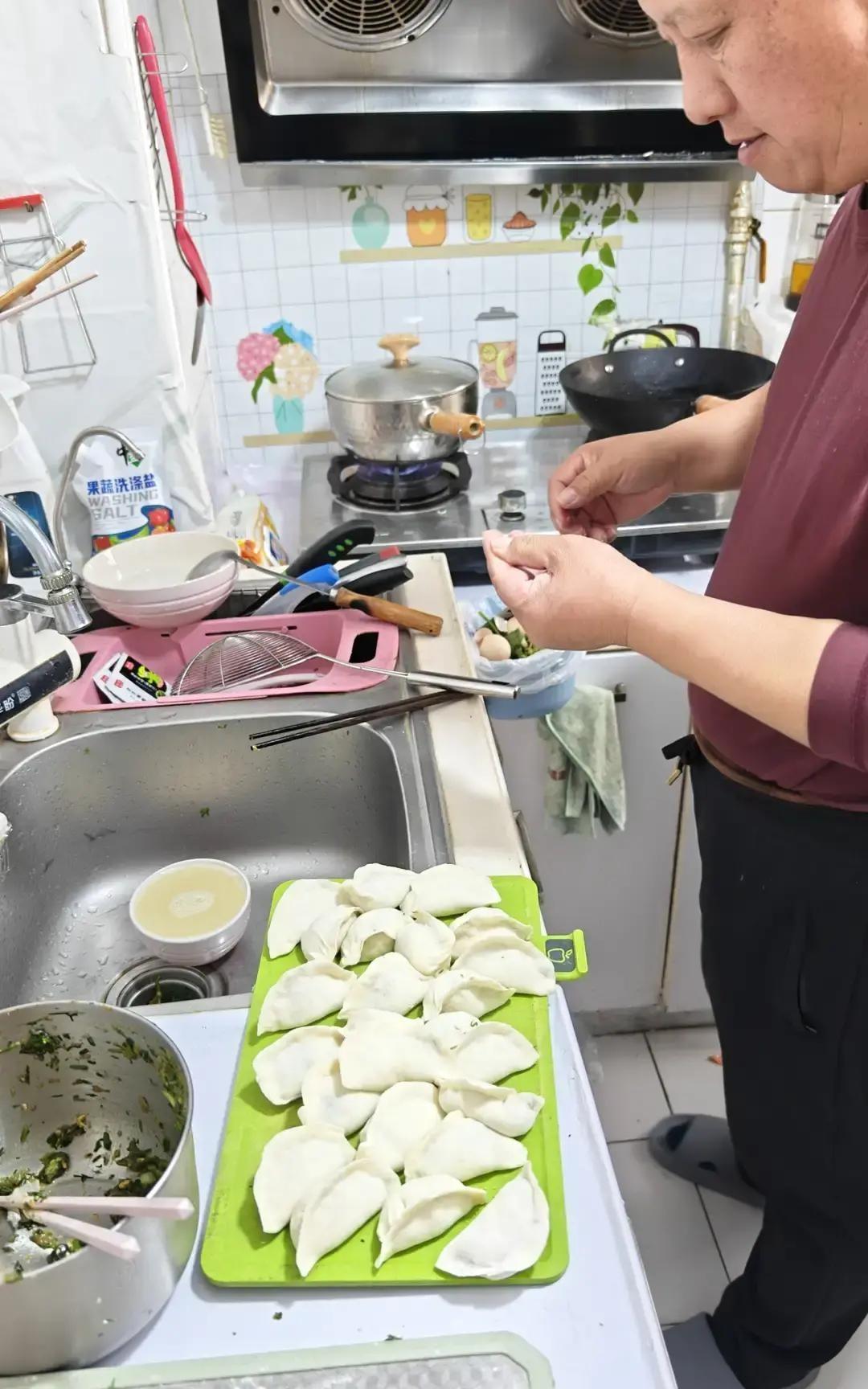 大妈初一早上接到闺女电话说馋茴香饺子,和老伴蹬半小时自行车回楼房现包现煮,一家人