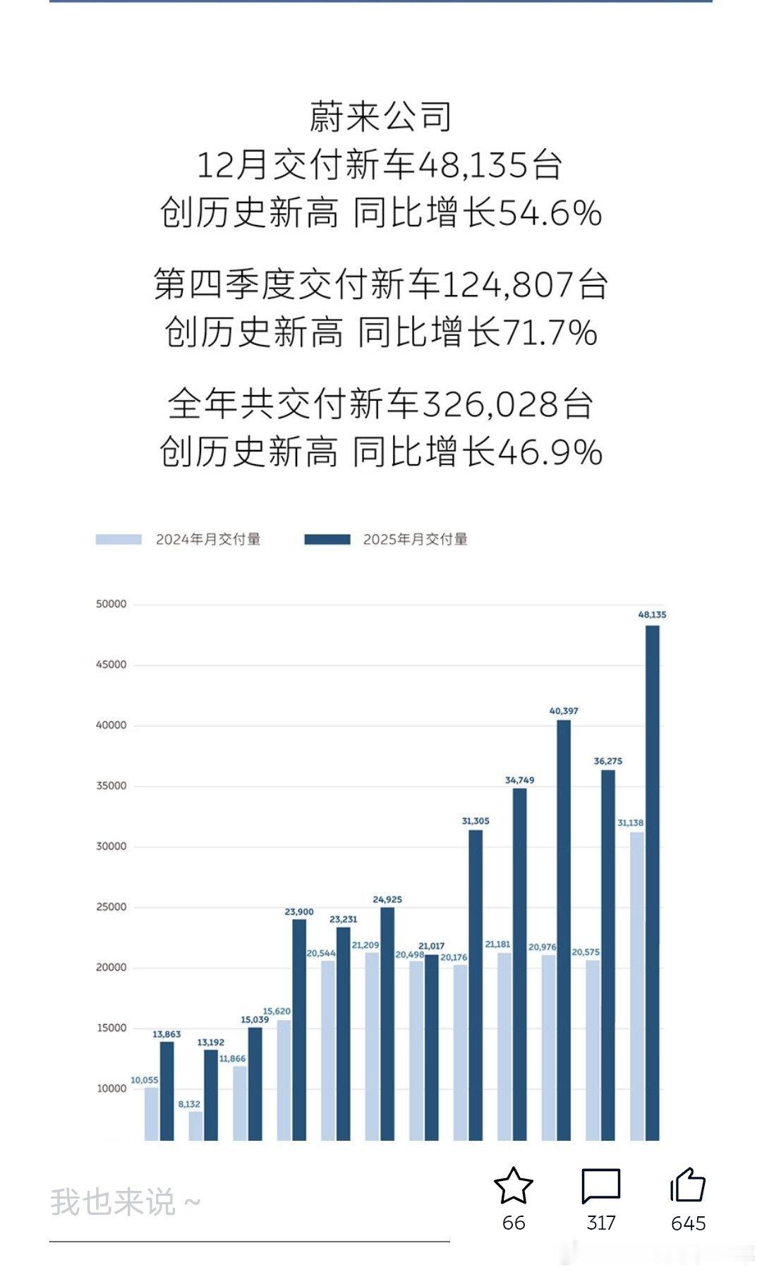 蔚小理12月成绩单:蔚来:48135小鹏:37508理想:44246蔚来2025年成绩单:蔚来:326028小鹏:429445理想:406343新能源汽车
