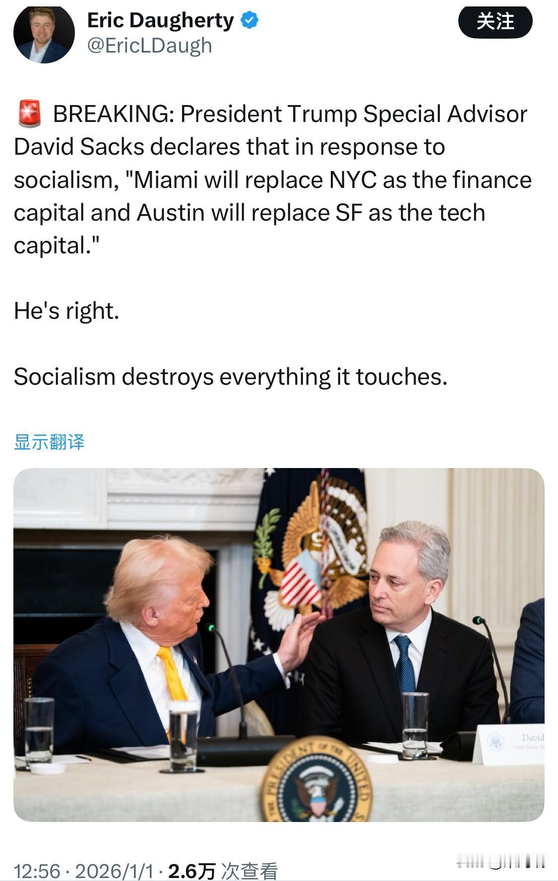 突发新闻:特朗普总统特别顾问大卫·萨克斯宣称,为了应对社会主义,“迈阿密将取代纽约成为金融中心,奥斯汀将取代旧金山成为科技中心”。