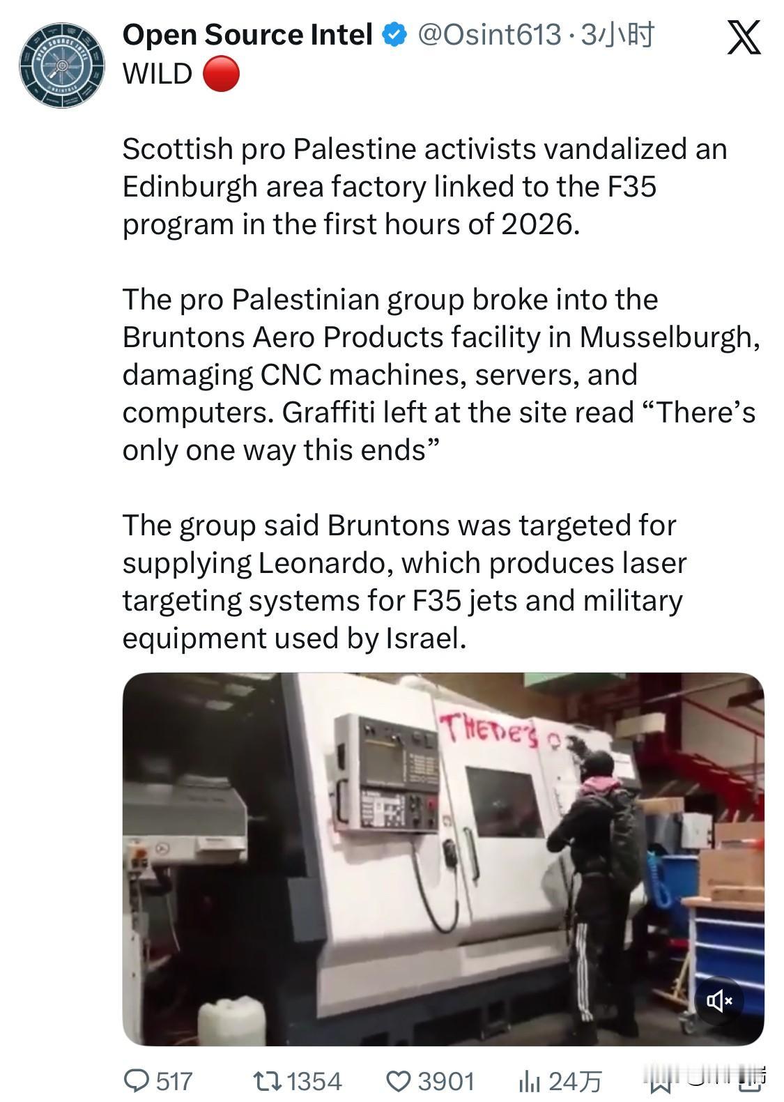 突发事件:2026 年伊始,苏格兰亲巴勒斯坦活动人士破坏了爱丁堡地区一家与 F35 项目有关的工厂。 亲巴勒斯坦组织闯入位于马瑟尔堡的布伦顿航空产品公司,损坏了数控机床、服务器和电脑。现场留下的涂鸦写着“结局只有一个”。 该组织称,布伦顿公司之所以成为攻击目标,是因为其向莱昂纳多公司供应产品,而莱昂纳多公司生产的激光瞄准系统是F35战斗机和以色列使用的军事装备所用的。