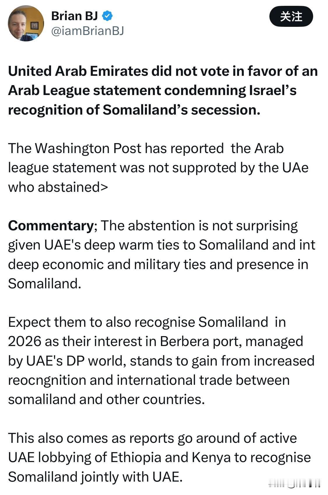 阿拉伯联合酋长国没有投票赞成阿拉伯联盟谴责以色列承认索马里兰脱离以色列的声明。 《华盛顿邮报》报道称,阿联酋投了弃权票,不支持阿拉伯联盟的声明。 评论:鉴于阿联酋与索马里兰之间深厚的友好关系,以及在索马里兰的深厚经济和军事联系及存在,阿联酋的弃权并不令人意外。 预计他们也会在 2026 年承认索马里兰,因为他们对由阿联酋 DP World 管理的柏培拉港的利益将受益于索马里兰与其他国家之间日益增长的认可和国际贸易。 与此同时,有报道称阿联酋正在积极游说埃塞俄比亚和肯尼亚,希望它们与阿联酋共同承认索马里兰。