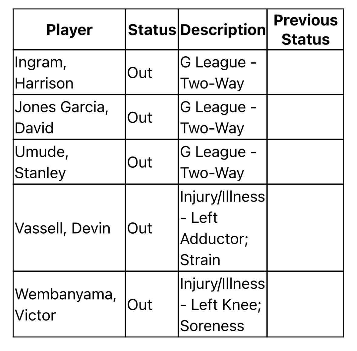 虽然文班说自己预计下场能打,但马刺还是出于谨慎考虑没有让他飞往印第安纳,他会缺席和步行者一战,Michael C. Wright说再往后一场vs开拓者他可能被列为出战成疑。核磁共振结果显示文班没有遭遇韧带损伤,一切正常。NBA