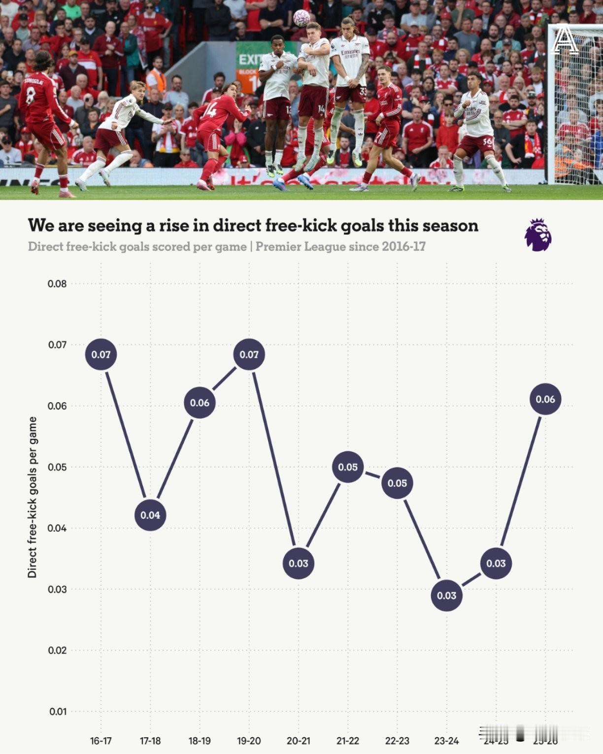 英超联赛使用耐克足球长达25年后,本赛季已转用彪马足球。 新款“奥比塔”足球设计旨在提升精准度和飞行稳定性,似乎更符合球员的技术与创造力。 教练和球员可能针对新用球特性调整任意球策略(如旋转、弧线或力量控制),从而提高得分效率。 附图是英超联赛直接任意球进球趋势(2016/17赛季至2025/26赛季预测) 具体数据与趋势 - 2016/17赛季:起点为 0.07球/场,随后逐年下降。 - 2020/21赛季:触底至 0.03球/场(可能与新冠疫情导致的赛制变化相关)。 - 2021/22赛季后:反弹并持续上升,2025/26赛季预计回升至0.06球/场。 - 2019/20赛季:短暂回升至 0.07球/场,但未维持。 - 2025/26赛季预测值:标注为 0.06球/场,表明当前赛季呈上升趋势。 那么,本赛季英超用球是否促成了更多精彩进球呢?