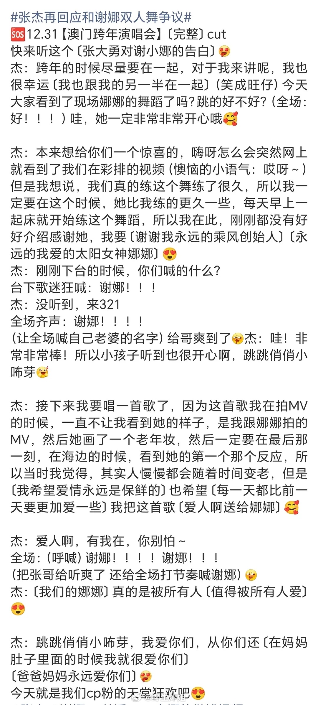 总结一下张杰这次感觉是下定决心不要梦女了总结一下:12.28开始梦女就因为谢娜上台破防12.29第一波回应:希望大家理解,围着太阳转,一起经历了很多,做好歌手之前先做好男人12.31谢娜上台跳《无药可救》➕《Perfume》第二次回应:我永远爱太阳女神,和另一半在一起,几次带头现场喊谢娜+打节拍+我的娜娜值得所有人爱(意思是希望大家都爱她)1/1第一条微博谢谢女儿新歌教学(意思是唱的歌女儿想听)1/1第二条微博世界美好和精彩,心中圆满的舞台。配图还有一张只露谢娜脸没露他自己脸的图