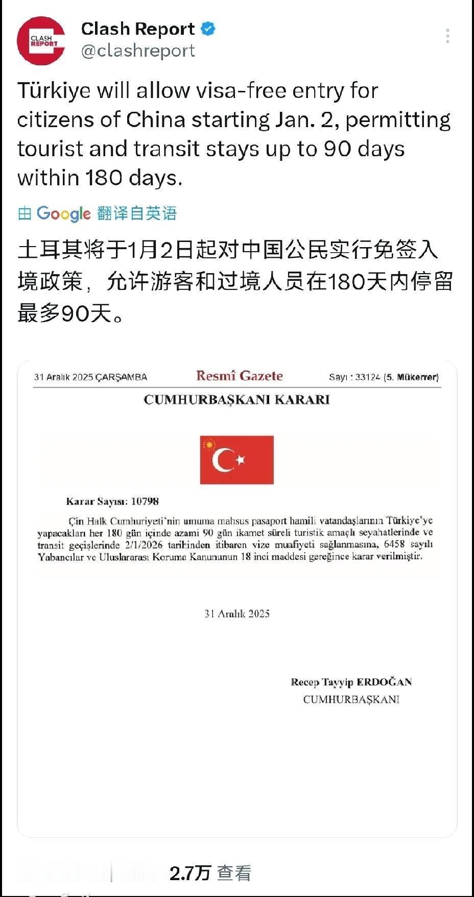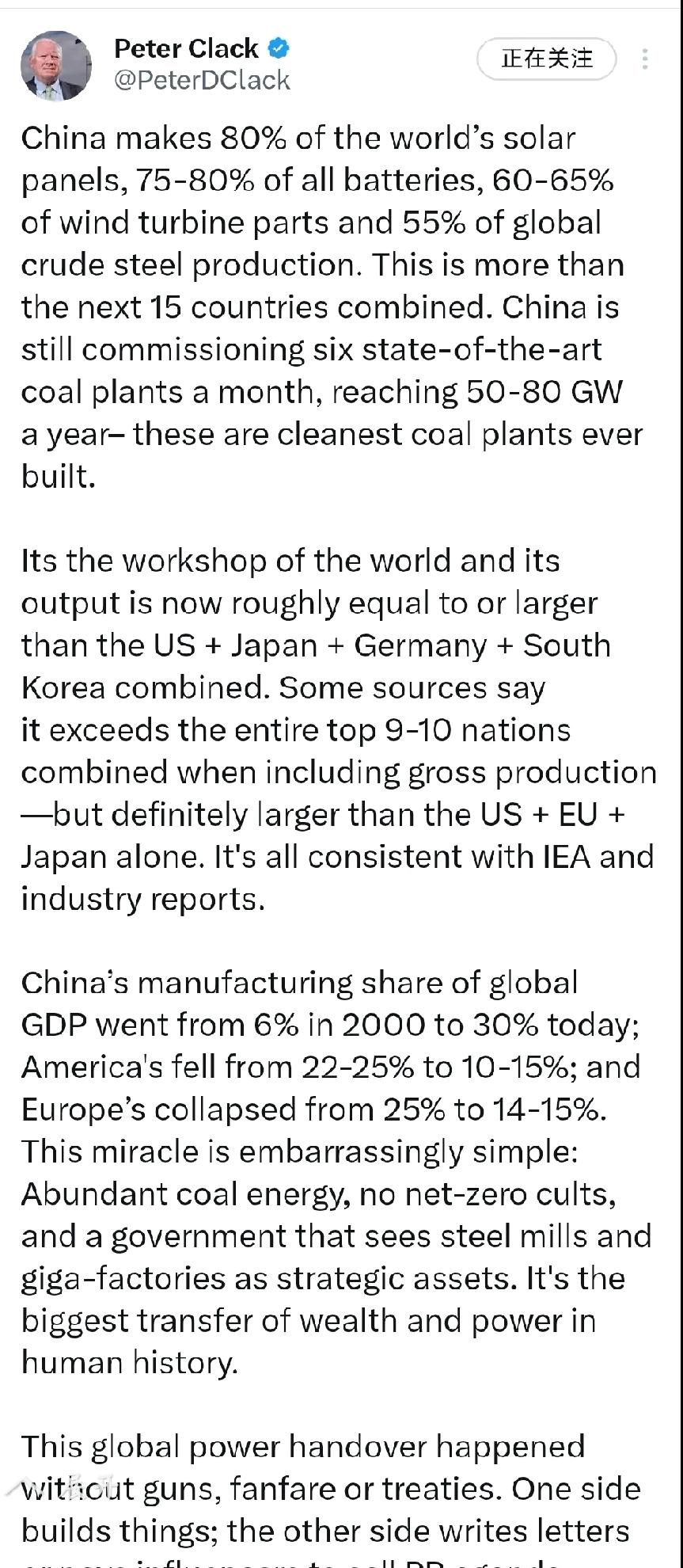 2026年,继续拥抱世界 请看两个国际资讯: 第一个国际资讯:昨日1月1日,土耳其对中国游客免签的通知。 第二个国际资讯:澳大利亚科学家皮特克拉克也是1月1日对于中国的发文写到:“中国生产了全球80%的太阳能电池板,75%-80%的电池,60%-65%的风力涡轮机部件和全球55%的粗钢产量,这比紧随其后的15个国家的总和还要多,现在的中国,应在以每月投产六座最先进的燃煤电厂的速度发展。” 个人认为:对待此类新闻的态度是:“这是对我们过去的肯定,但不会限制我们的发展速度,更加不会成为我们发展道路上的绊脚石。我们还没有复兴,所以不能被取得的成绩击昏头脑。继续保持冷静开放的心态,继续向前更快的迭代发展。” 而且个人对澳大利亚人发文的初衷:保持怀疑态度,这是对我们的肯定,也是对我们的警惕。而且澳大利亚对中国的不友好,是举世皆知。